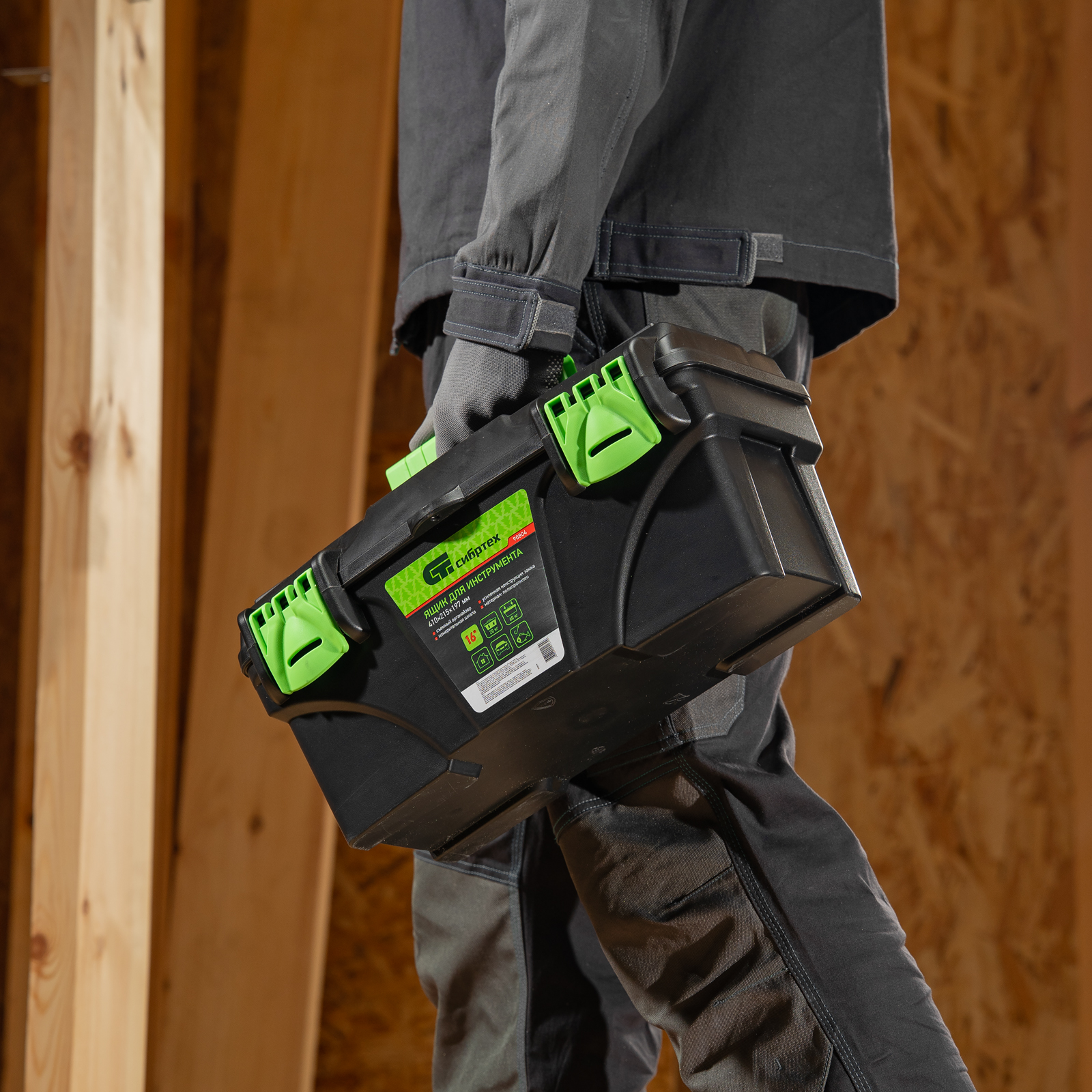 Ящик для инструмента Сибртех 90804 из пластика, размером 410 х 215 х 197 мм (длина 16"), — удобное вместилище для инструментов, бытовых мелочей, рыболовных снастей. На крышку нанесена измерительная шкала в сантиметрах и дюймах, поэтому можно проводить измерения, даже если под рукой нет линейки. Ящик пригодится в поездке, на рыбалке, а также дома, на даче или в гараже.