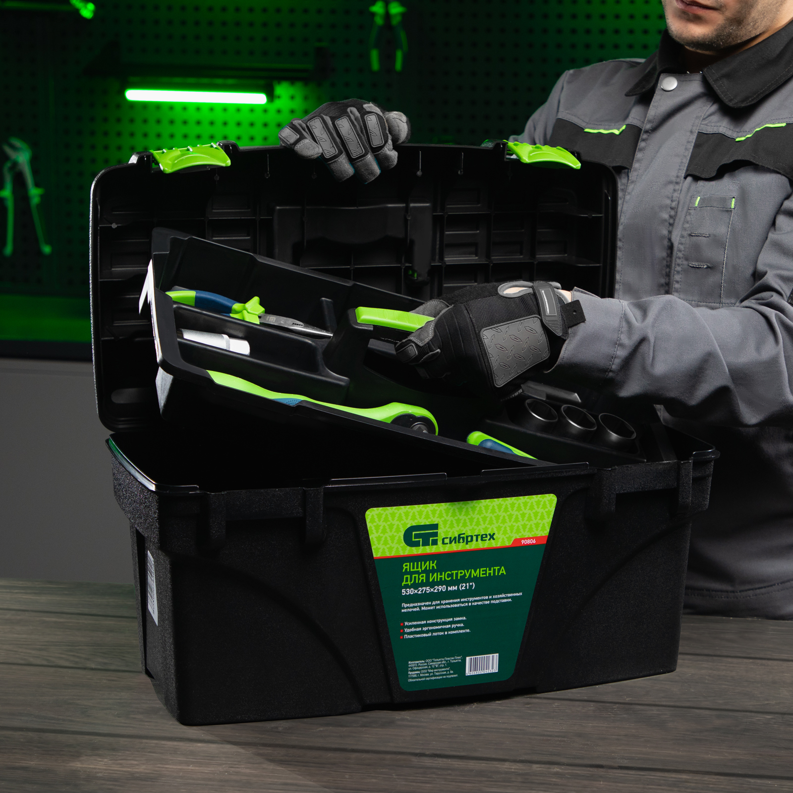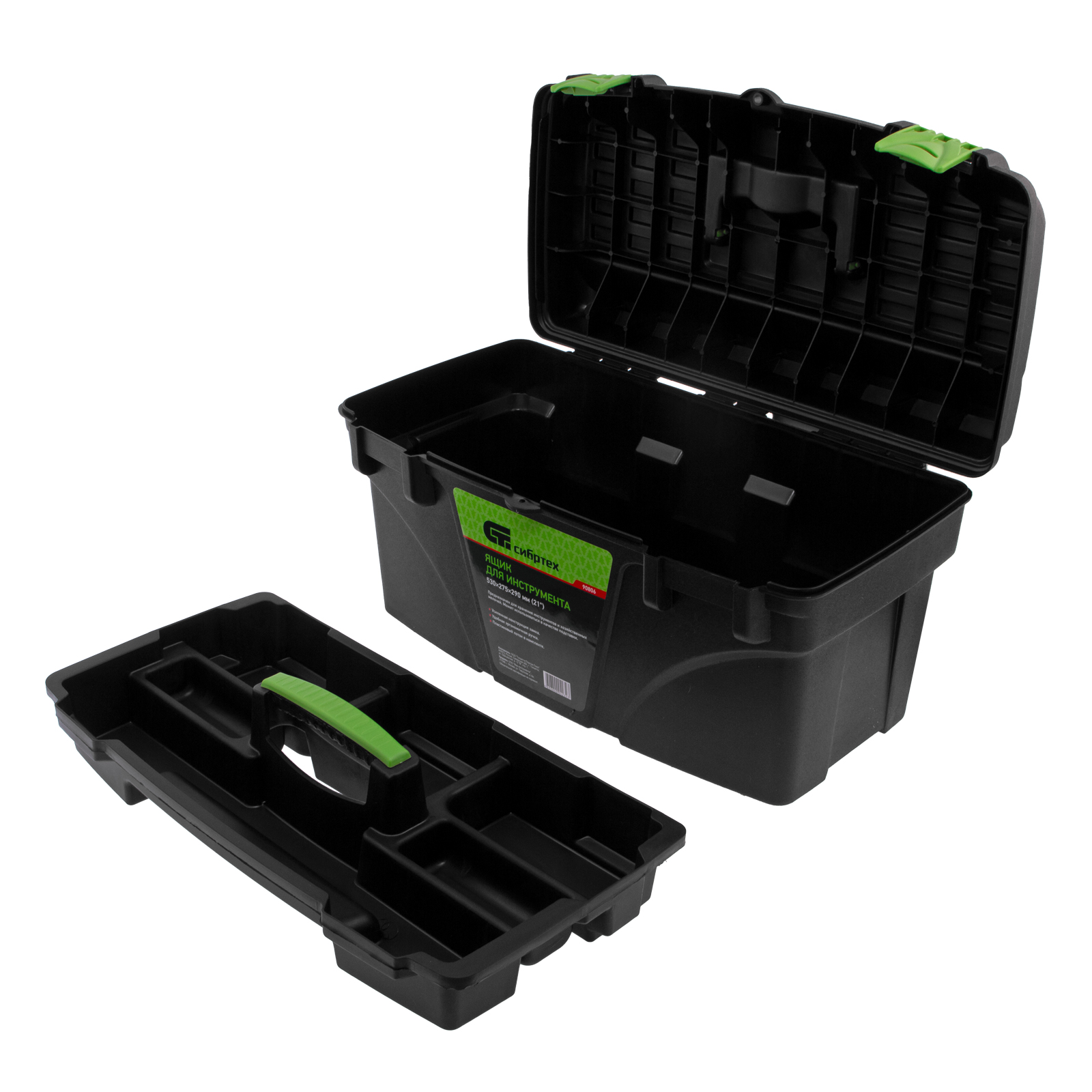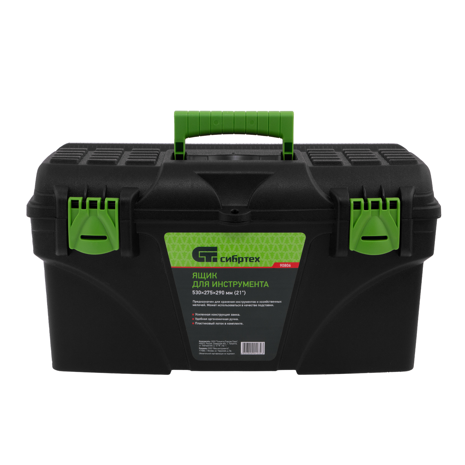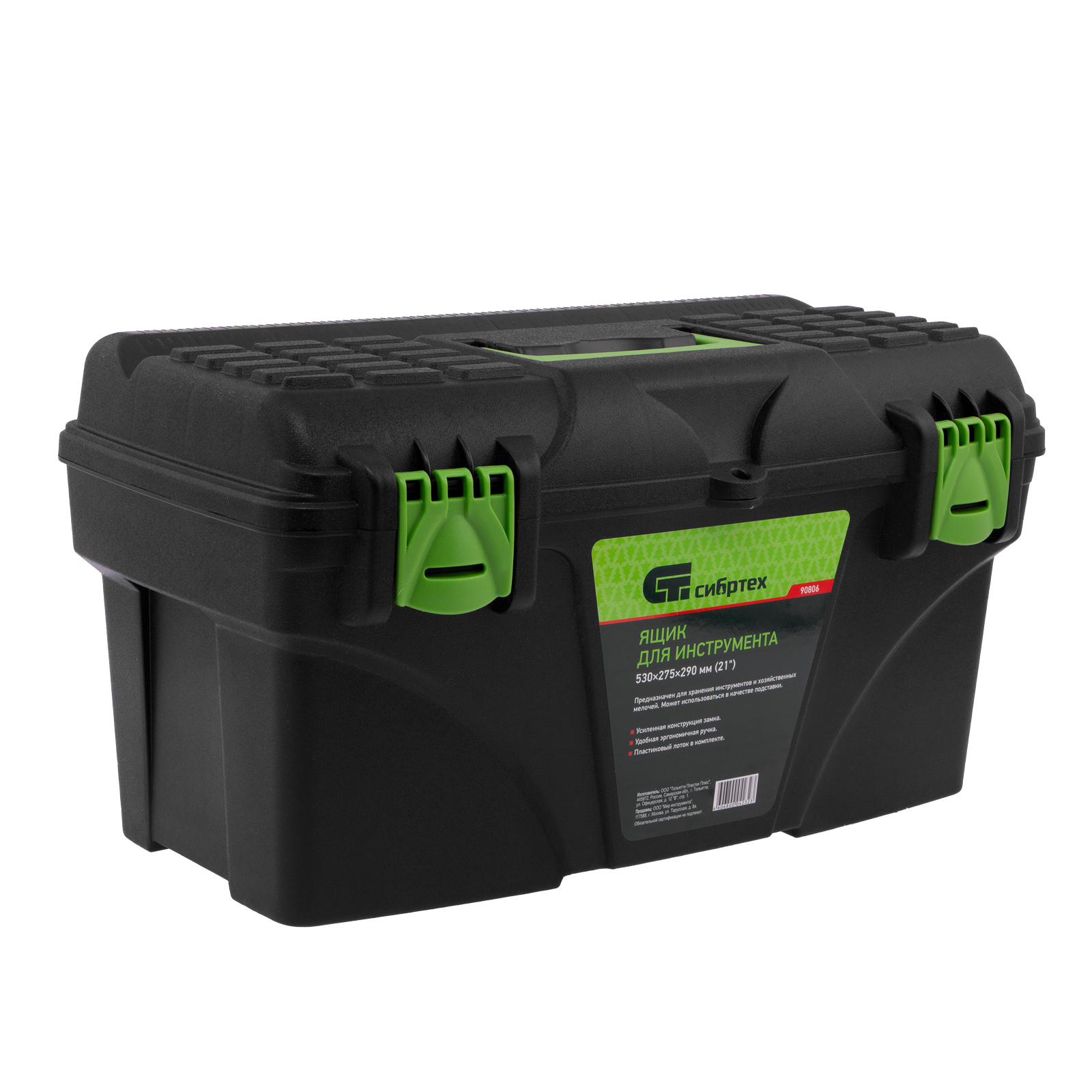 <p>Ящик для инструмента Сибртех 90806 из пластика, 21 дюйм, 530 х 275 х 290 мм, — удобное вместилище для инструментов, бытовых мелочей, рыболовных снастей. На крышку нанесена измерительная шкала в сантиметрах и дюймах, поэтому можно проводить измерения, даже если под рукой нет линейки. Ящик пригодится в поездке, на рыбалке, а также дома, на даче или в гараже.</p><h2>Преимущества</h2><ul><li>Трехрядные петли усиливают конструкцию замка и верхней крышки, поэтому в ящик можно положить много инструментов.</li><li>Съемный лоток с ручкой позволяет максимально удобно организовать пространство внутри ящика, а также использовать его для хранения метизов.</li><li>Корпус усилен ребрами жесткости, поэтому ящик устойчив к повреждениям в результате удара или падения.</li><li>Эргономичная ручка на крышке облегчает транспортировку ящика.</li></ul>