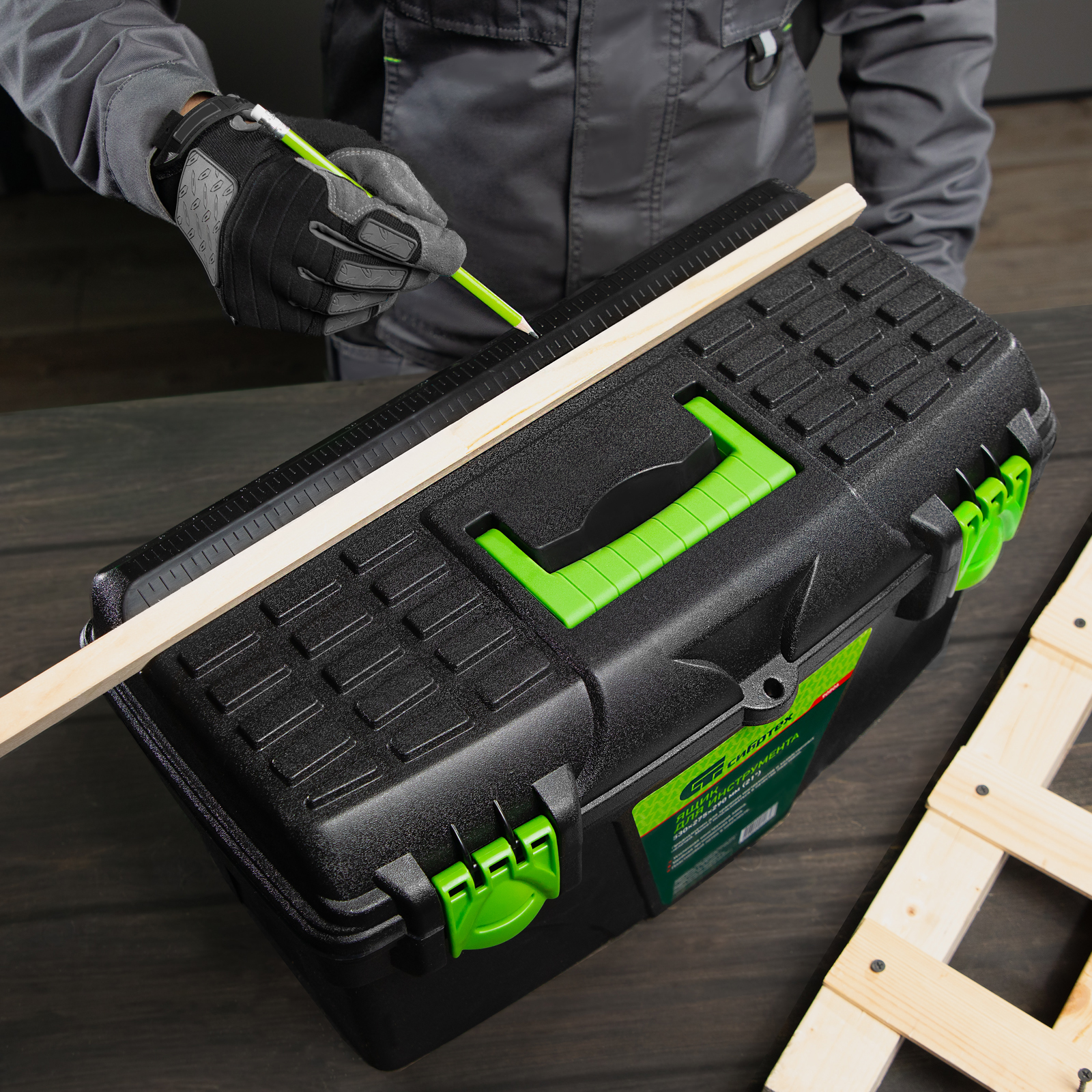 Эргономичная ручка на крышке облегчает транспортировку ящика.