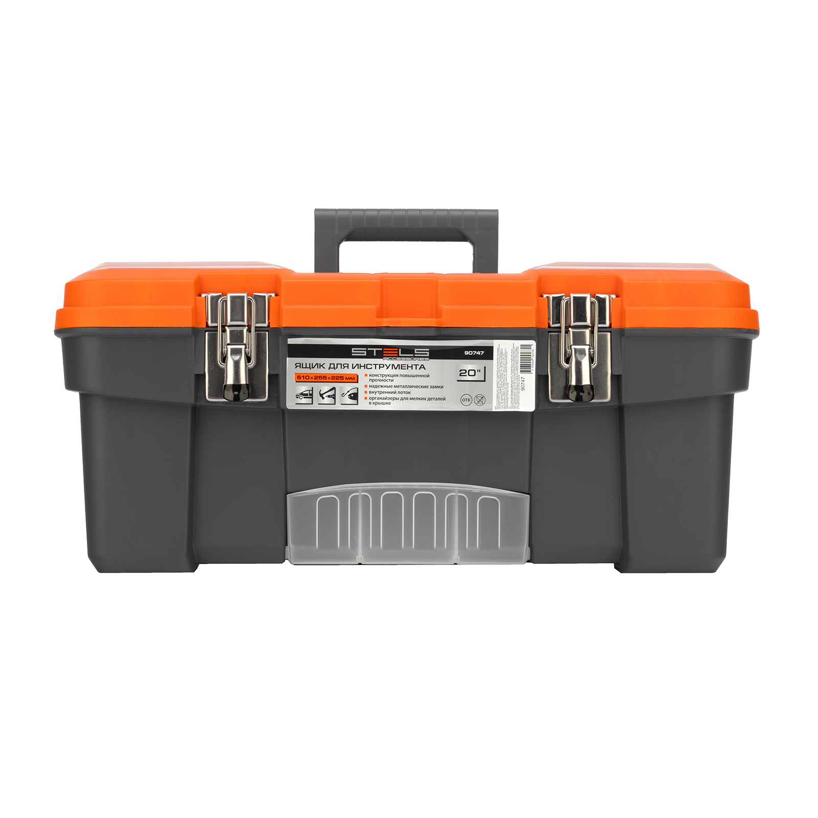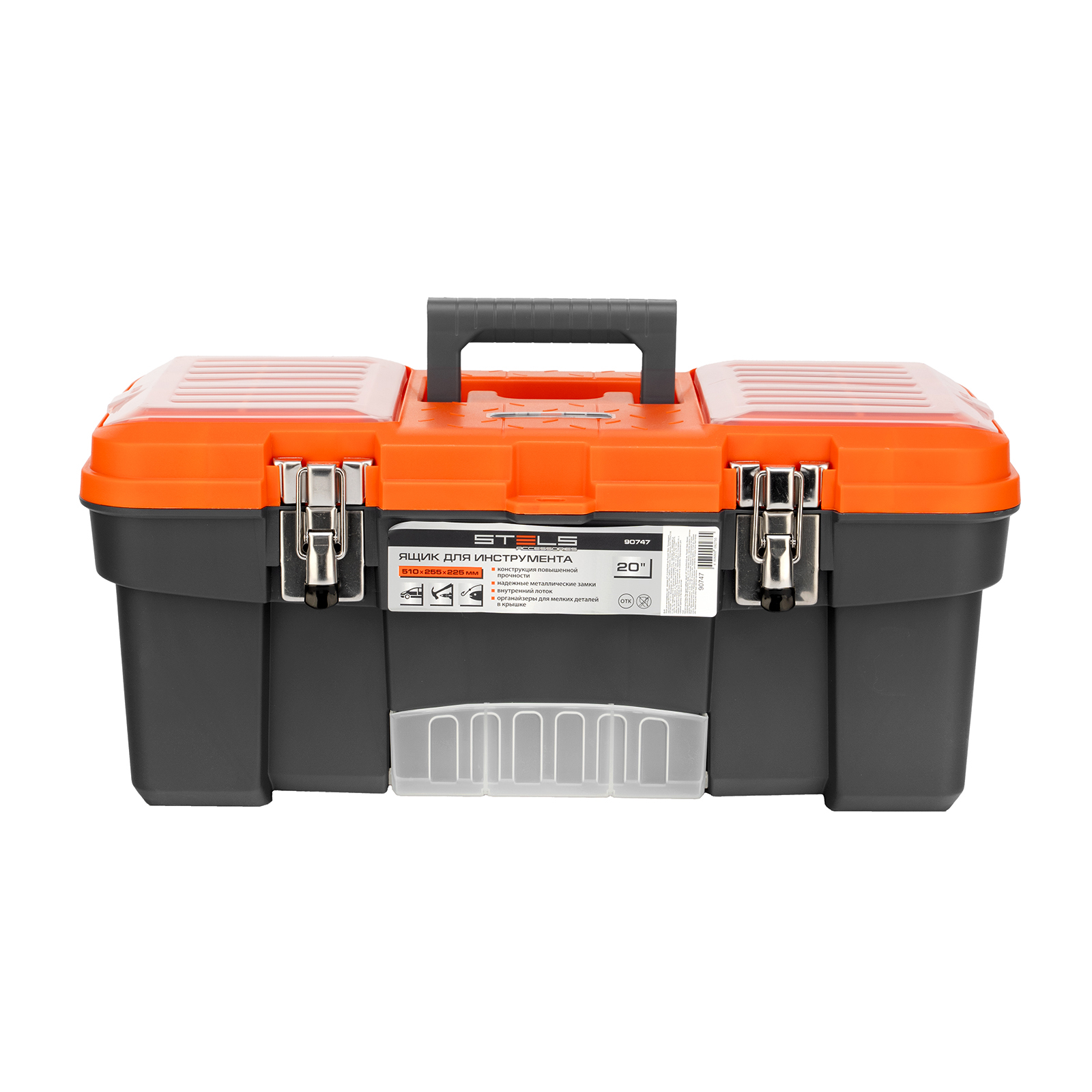 <p>Ящик для инструмента Stels 90747 размером 20" (510 х 255 х 225 мм), с металлическими замками, — альтернатива коробке для инструментов. В нем можно расположить ручной инструмент, крепеж, хозяйственные мелочи, а также рыболовные снасти. В крышке имеются встроенные органайзеры, внутри ящика — выкидной лоток с отсеками для мелких деталей, что увеличивает функциональность изделия. Ящик удобно брать в поездки, также он пригодится дома, на даче или в гараже.</p><h2>Преимущества</h2><ul><li>Конструкция повышенной прочности — ящик выдерживает значительные нагрузки, поэтому в нем можно разместить много инструментов и расходников.</li><li>Надежный металлический замок — ящик не откроется во время транспортировки или хранения.</li><li>Упорядоченное хранение инструментов — съемный лоток с ручкой позволяет рационально организовать внутреннее пространство.</li></ul>