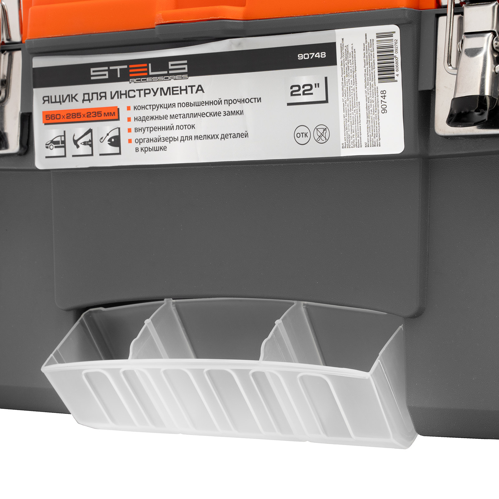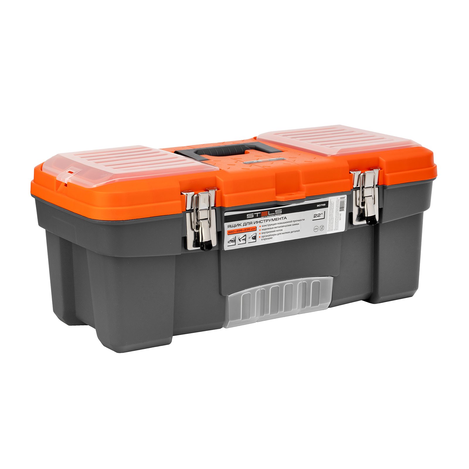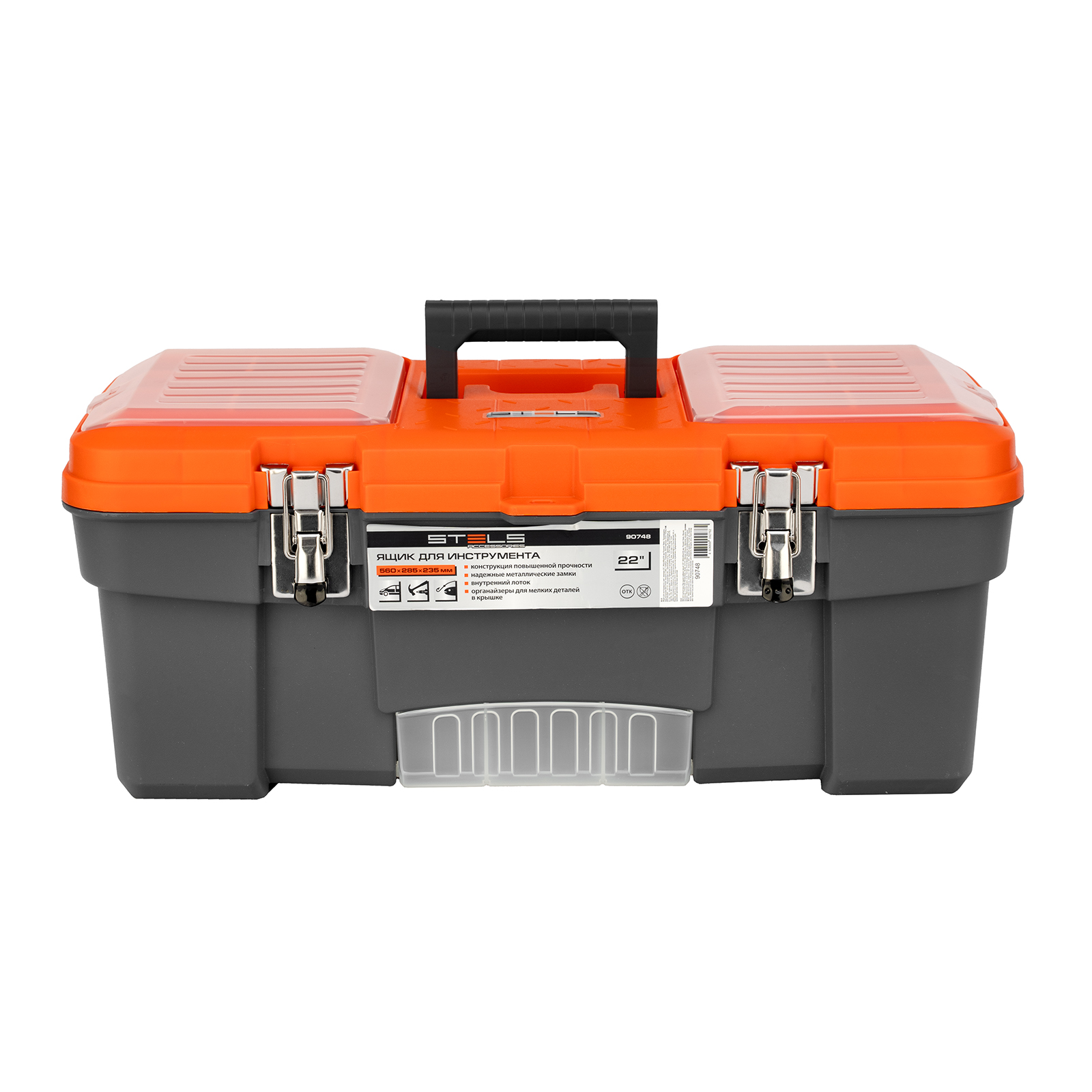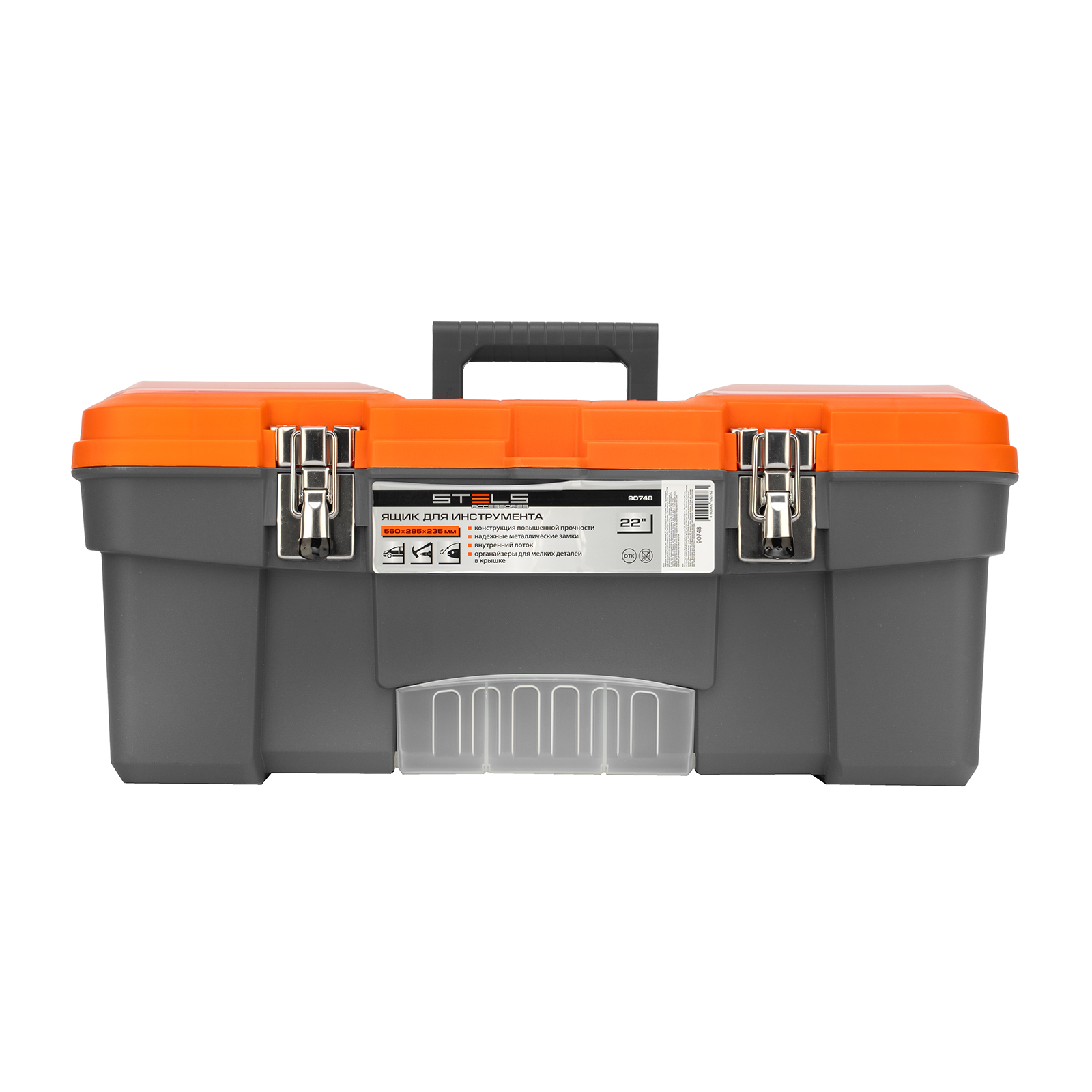 <p>Ящик для инструмента Stels 90748 размером 22" (560 х 285 х 235 мм), с металлическими замками, — альтернатива коробке для инструментов. В нем можно расположить ручной инструмент, крепеж, хозяйственные мелочи, а также рыболовные снасти. В крышке имеются встроенные органайзеры, внутри ящика — выкидной лоток с отсеками для мелких деталей, что увеличивает функциональность изделия. Ящик удобно брать в поездки, также он пригодится дома, на даче или в гараже.</p><h2>Преимущества</h2><ul><li>Конструкция повышенной прочности — ящик выдерживает значительные нагрузки, поэтому в нем можно разместить много инструментов и расходников.</li><li>Надежный металлический замок — ящик не откроется во время транспортировки или хранения.</li><li>Упорядоченное хранение инструментов — съемный лоток с ручкой позволяет рационально организовать внутреннее пространство.</li></ul>