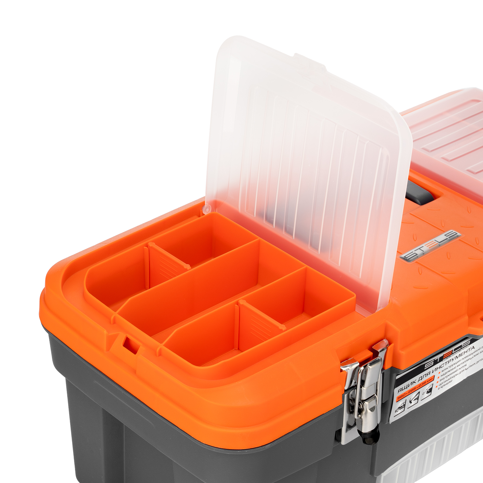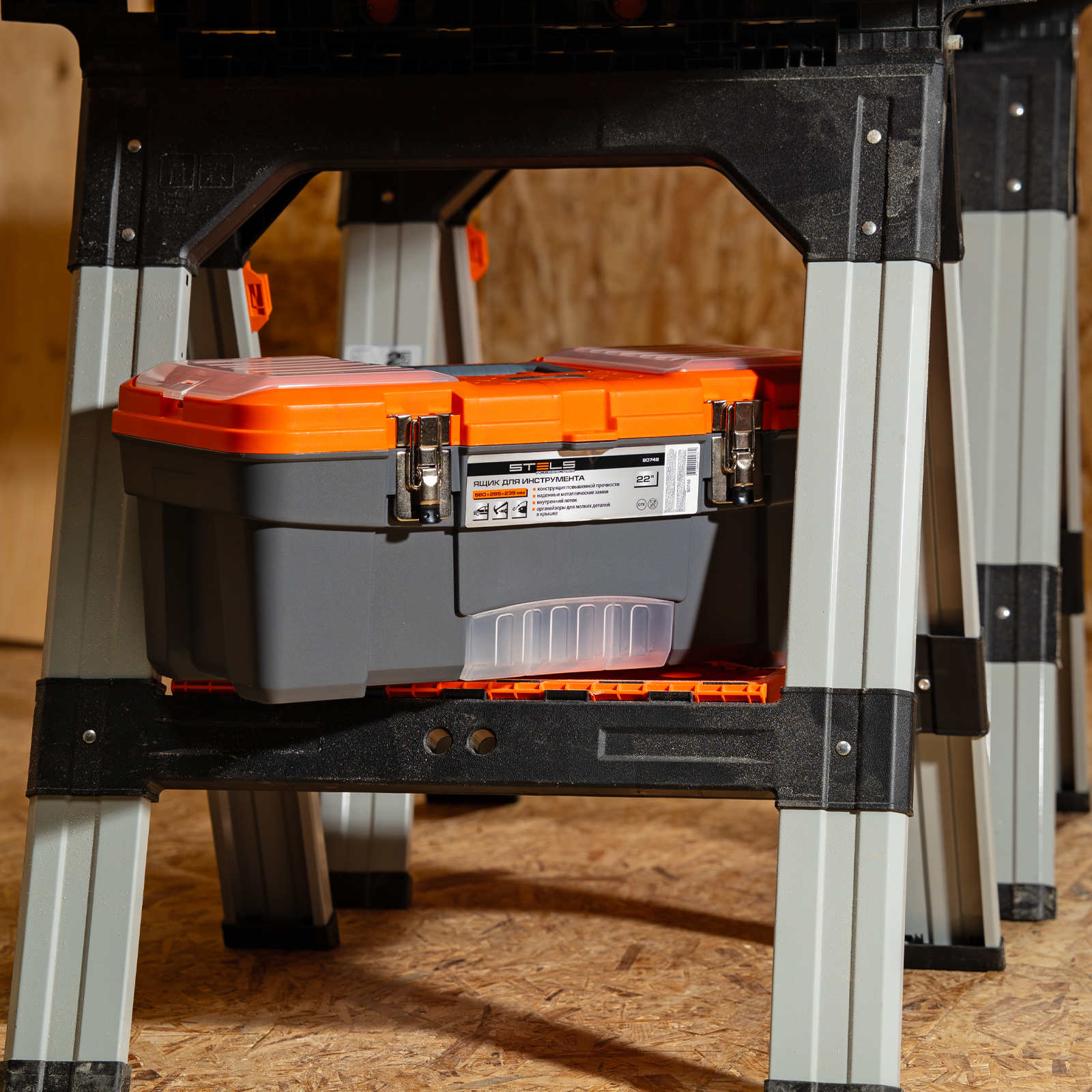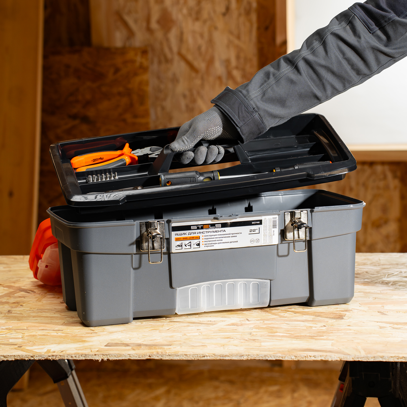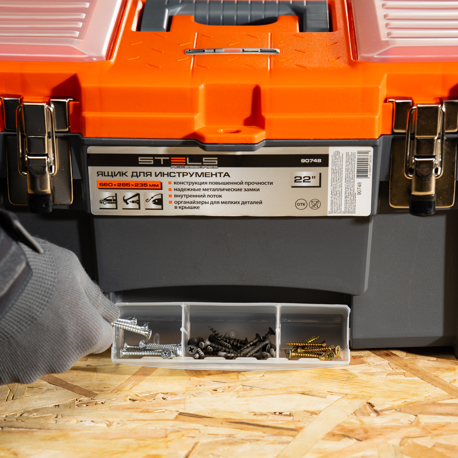 <p>Ящик для инструмента Stels 90748 размером 22" (560 х 285 х 235 мм), с металлическими замками, — альтернатива коробке для инструментов. В нем можно расположить ручной инструмент, крепеж, хозяйственные мелочи, а также рыболовные снасти. В крышке имеются встроенные органайзеры, внутри ящика — выкидной лоток с отсеками для мелких деталей, что увеличивает функциональность изделия. Ящик удобно брать в поездки, также он пригодится дома, на даче или в гараже.</p><h2>Преимущества</h2><ul><li>Конструкция повышенной прочности — ящик выдерживает значительные нагрузки, поэтому в нем можно разместить много инструментов и расходников.</li><li>Надежный металлический замок — ящик не откроется во время транспортировки или хранения.</li><li>Упорядоченное хранение инструментов — съемный лоток с ручкой позволяет рационально организовать внутреннее пространство.</li></ul>