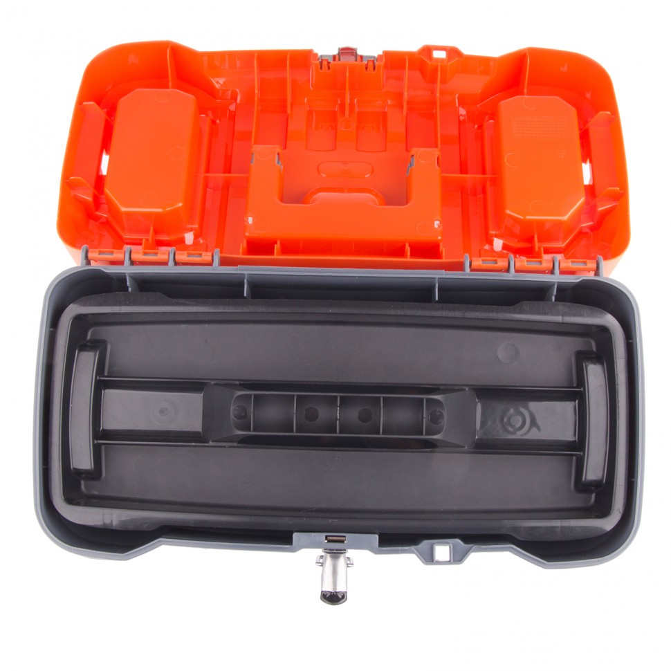 Съемный лоток с ручкой позволяет рационально организовать пространство внутри контейнера для хранения инструментов.