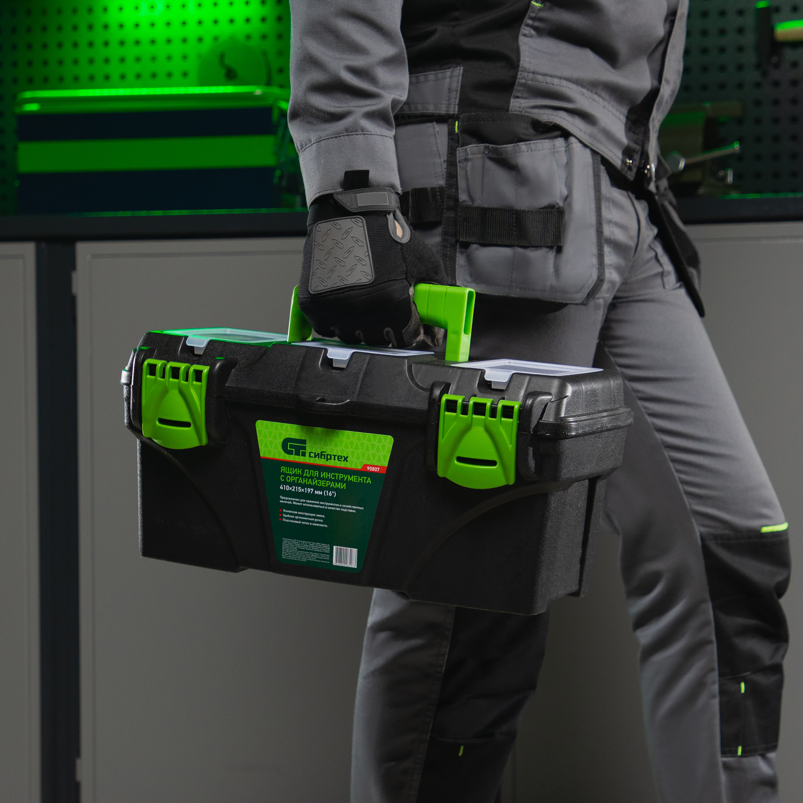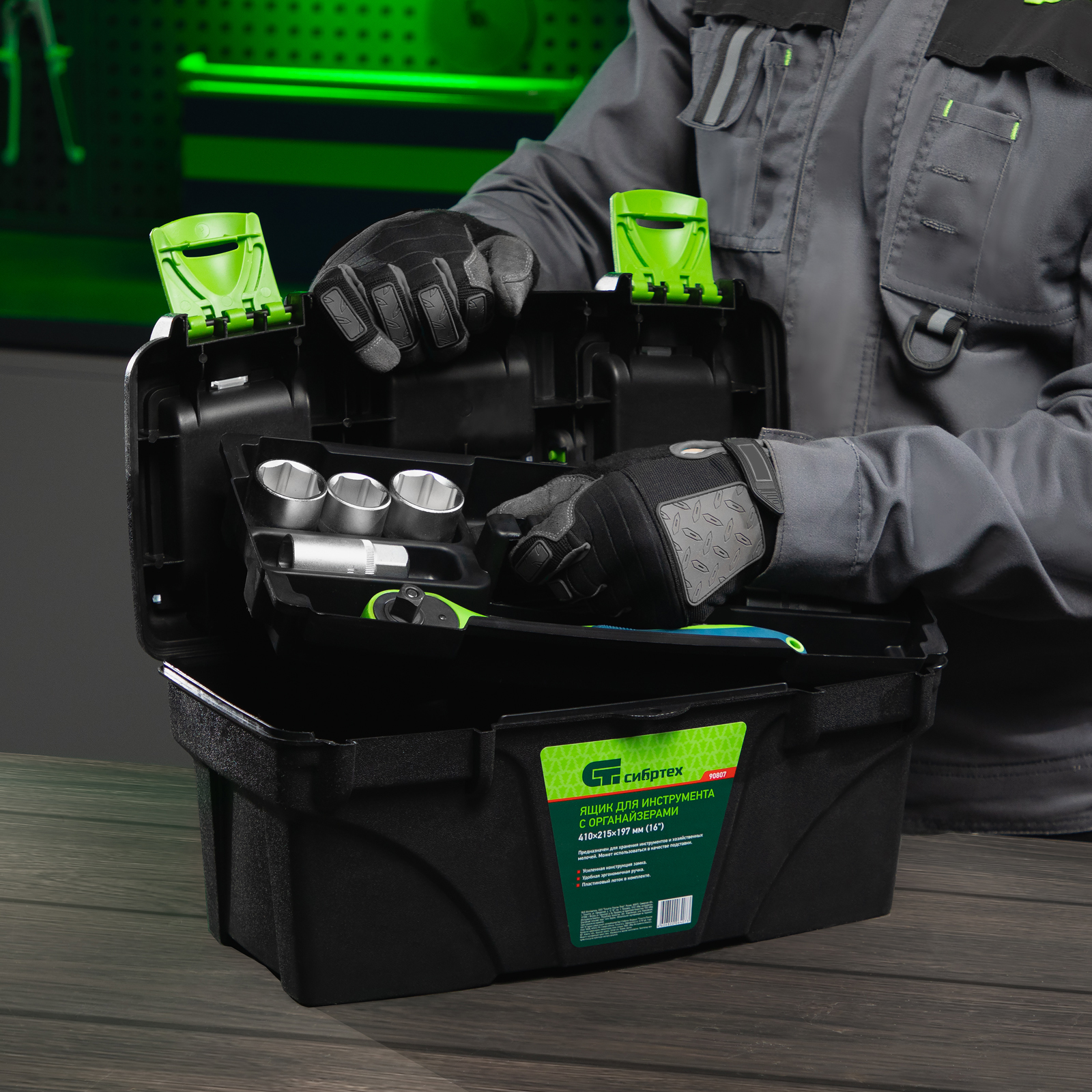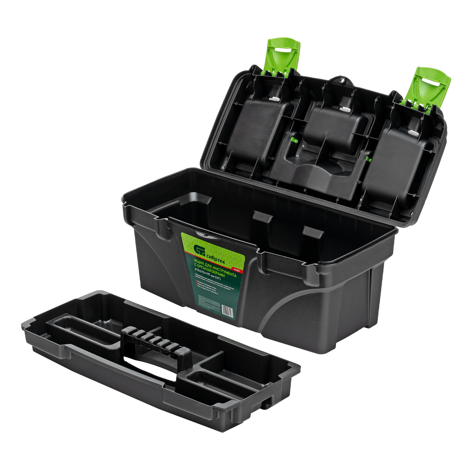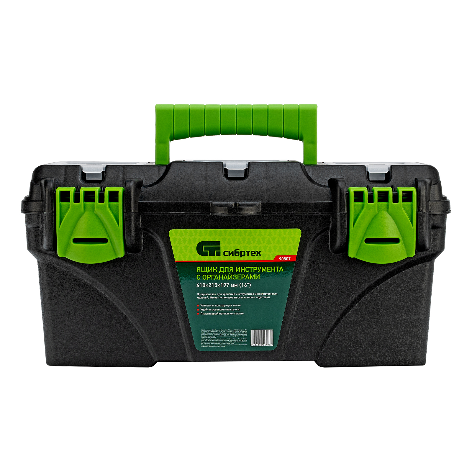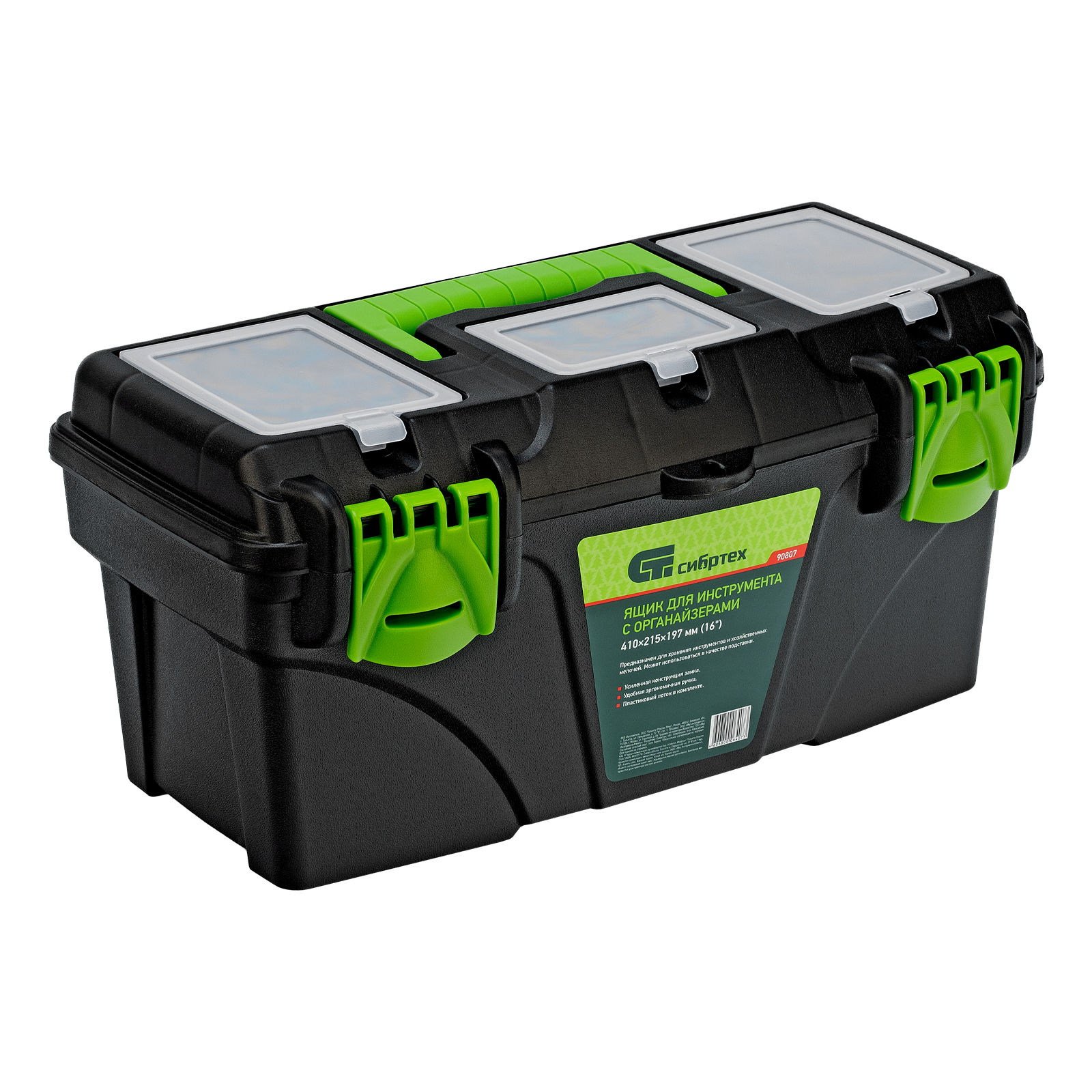 <p>Ящик Сибртех 90807 длиной 16", с органайзерами, используется для хранения и транспортировки инструментов, оснастки, крепежа, хозяйственных мелочей и других предметов. Крышка и замок усилены трехрядными петлями, поэтому ящик выдерживает вес содержимого до 30 кг. Съемный лоток позволяет оптимизировать пространство внутри ящика. Его можно брать в поездку, также он пригодится дома, на даче или в гараже.</p><h2>Преимущества</h2><ul><li>Удобное хранение крепежа и мелких деталей — в крышке имеются органайзеры.</li><li>Комфортная транспортировка — удобная рукоятка облегчает перемещение даже максимально заполненного ящика.</li><li>Возможность использования в качестве подставки — рукоятка утапливается в крышке.</li></ul>