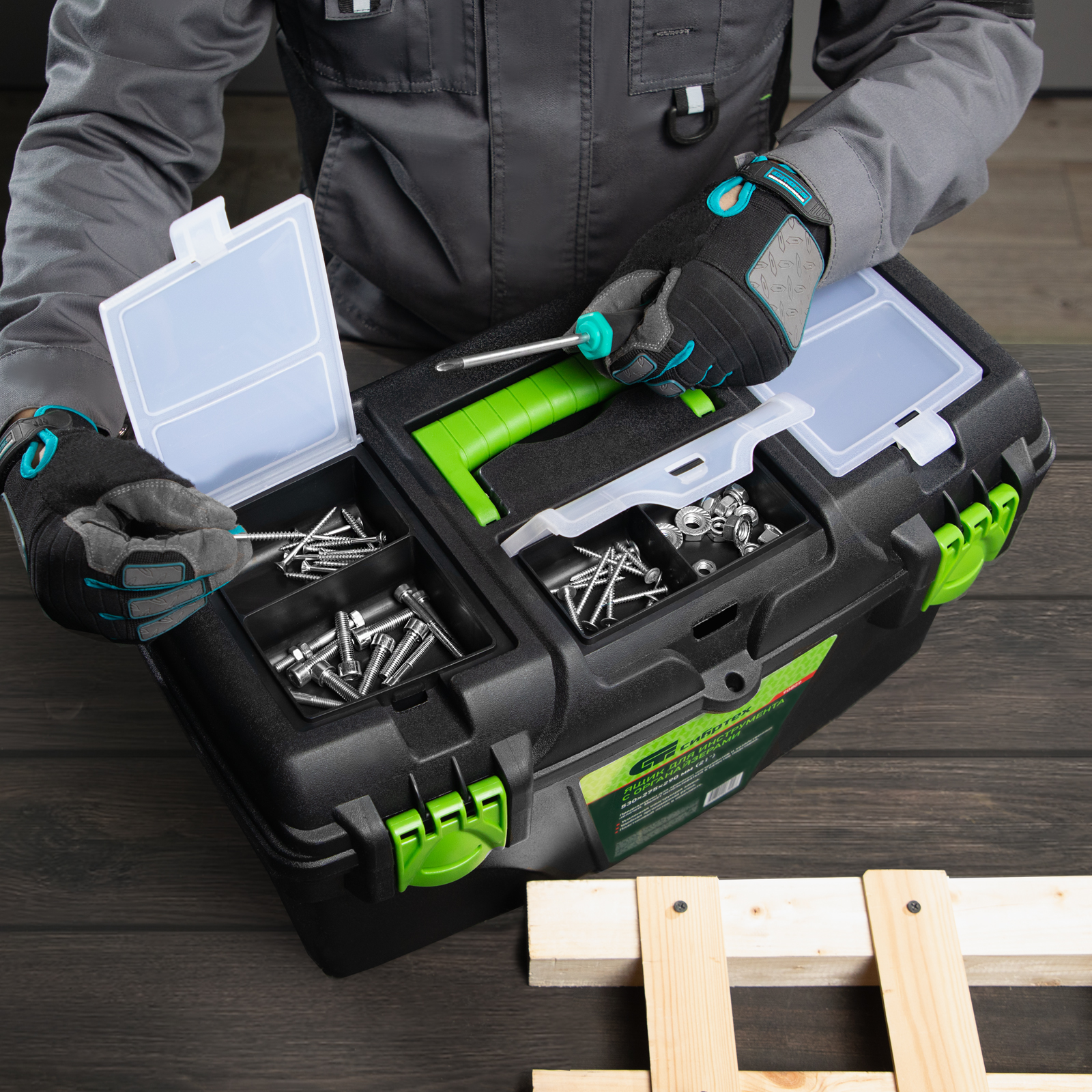 Удобное хранение крепежа и мелких деталей — в крышке имеются органайзеры.