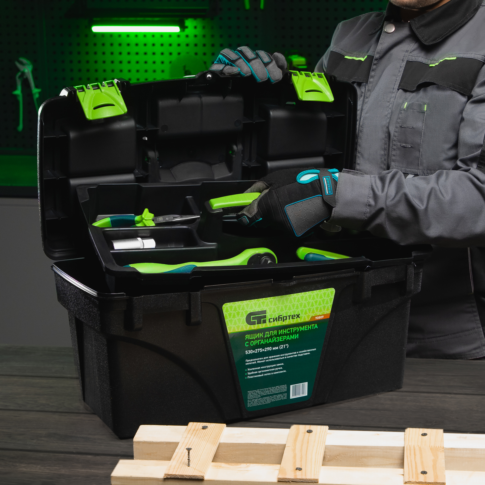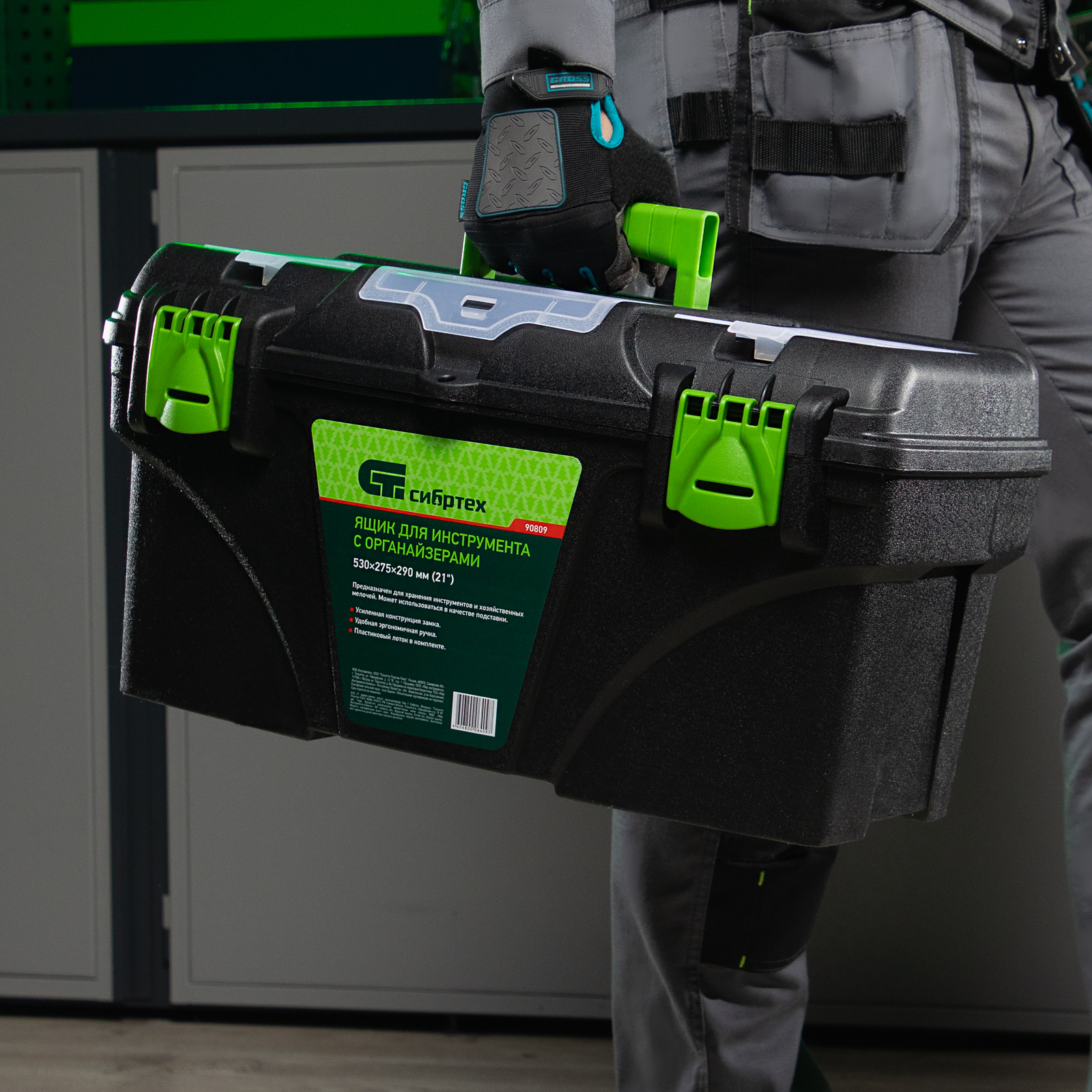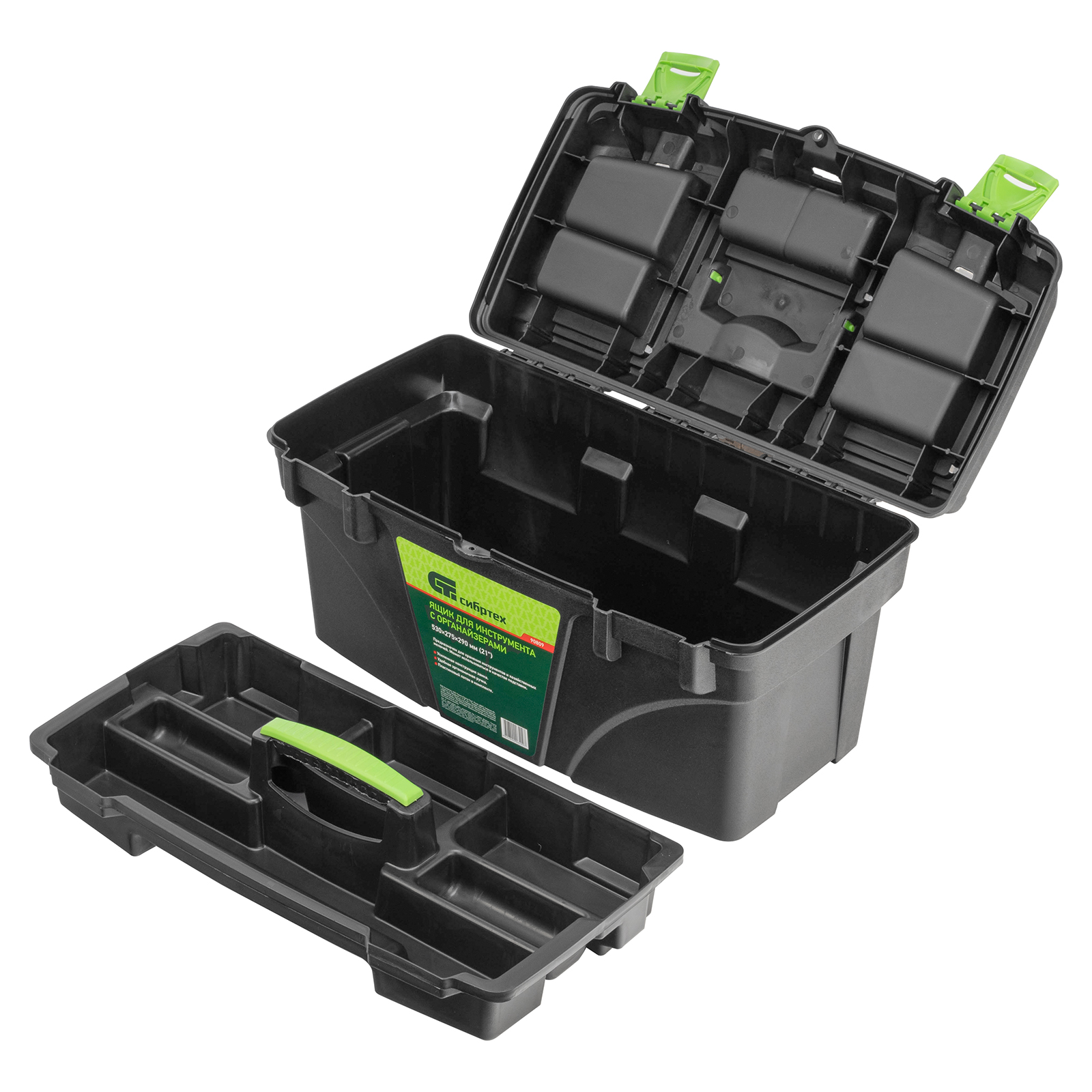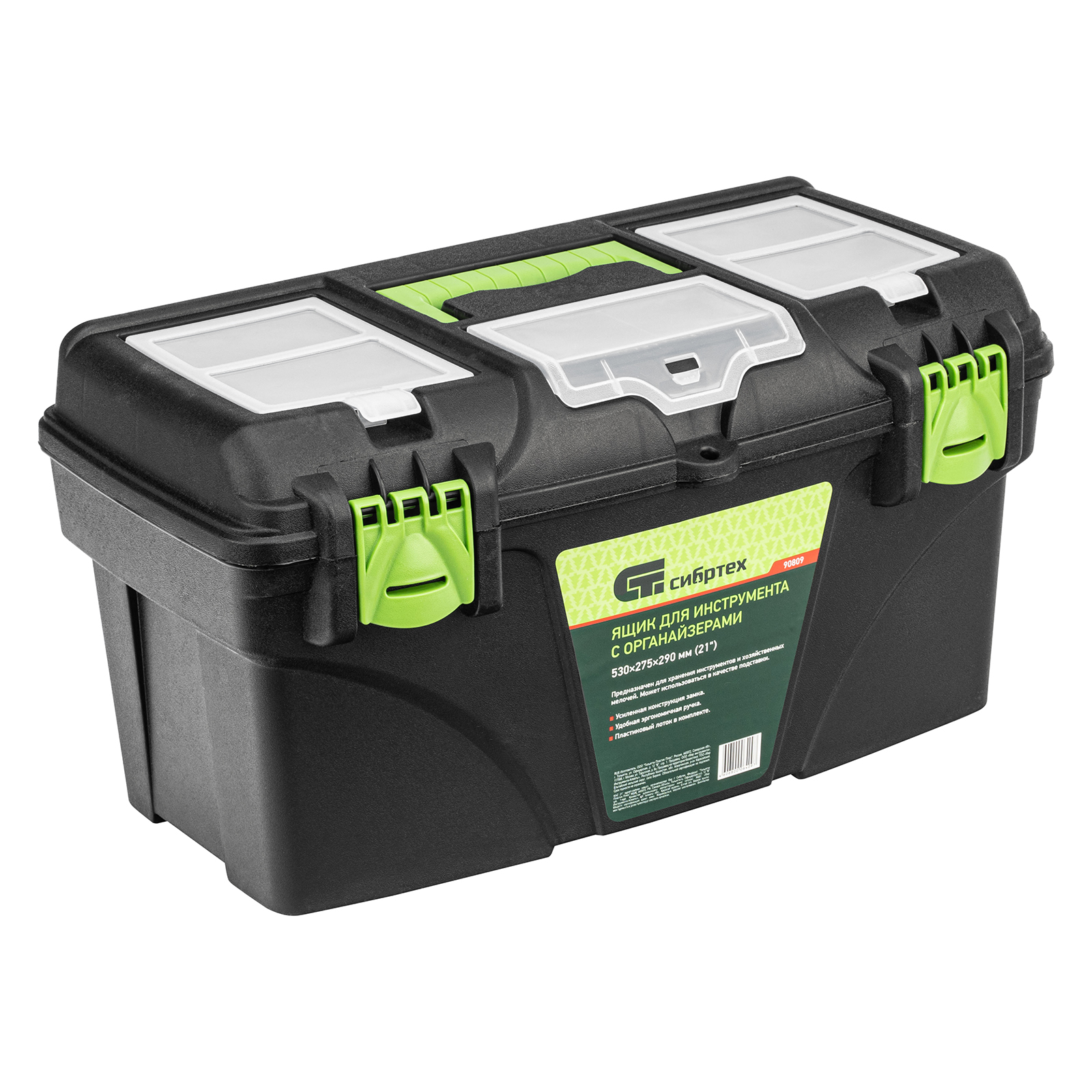 <p>Ящик Сибртех 90809 длиной 21", с органайзерами, используется для хранения и транспортировки инструментов, оснастки, крепежа, хозяйственных мелочей и других предметов. Крышка и замок усилены трехрядными петлями, поэтому ящик выдерживает вес содержимого до 50 кг. Съемный лоток позволяет оптимизировать пространство внутри ящика. Его можно брать в поездку, также он пригодится дома, на даче или в гараже.</p><h2>Преимущества</h2><ul><li>Удобное хранение крепежа и мелких деталей — в крышке имеются органайзеры.</li><li>Комфортная транспортировка — удобная рукоятка облегчает перемещение даже максимально заполненного ящика.</li><li>Возможность использования в качестве подставки — рукоятка утапливается в крышке.</li></ul>
