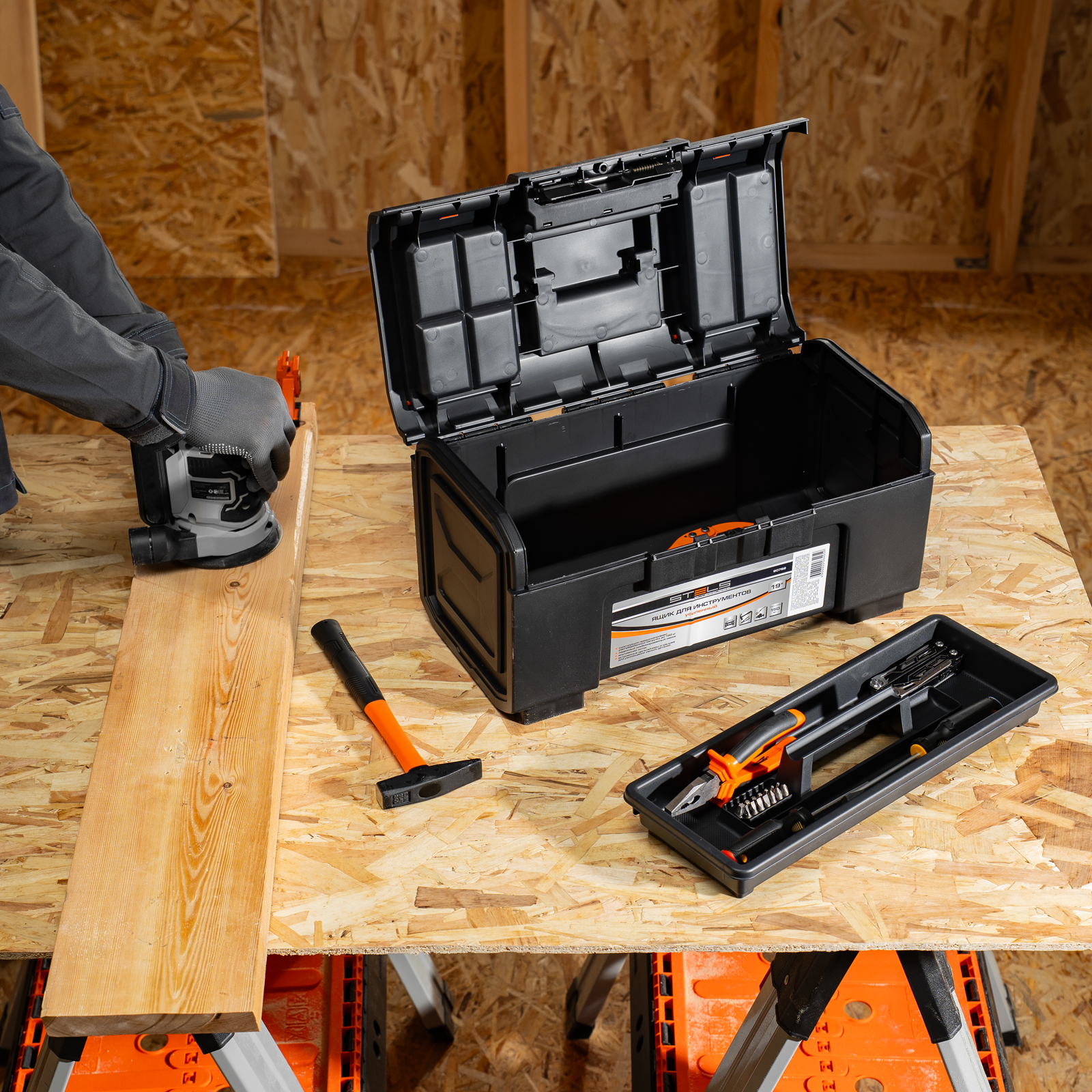 - Упорядоченное хранение крепежа и мелких деталей — в крышке имеются специальные органайзеры, также в комплект поставки входит съемный лоток с ручкой.