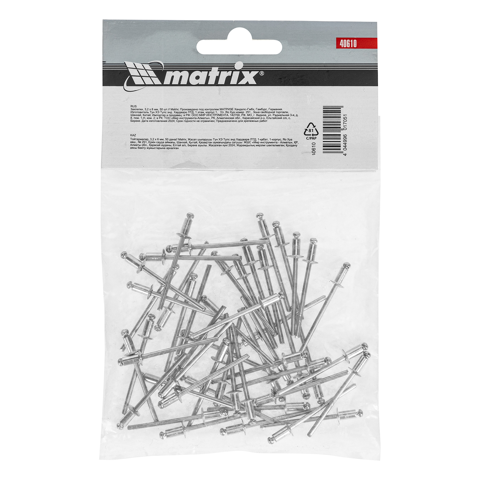 Заклепки Matrix 40610 размером 3,2 х 6 мм, 50 шт. в упаковке, предназначены для соединения листовых заготовок. Обеспечивают надежную фиксацию материалов даже при наличии доступа только с одной стороны. Используются в строительстве домов, для возведения заборов из профлиста, при производстве оборудования, будут полезны в домашней мастерской.