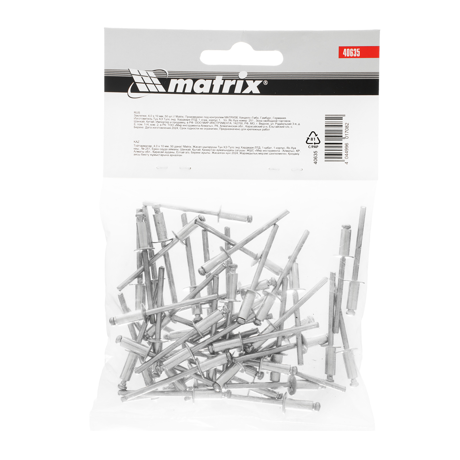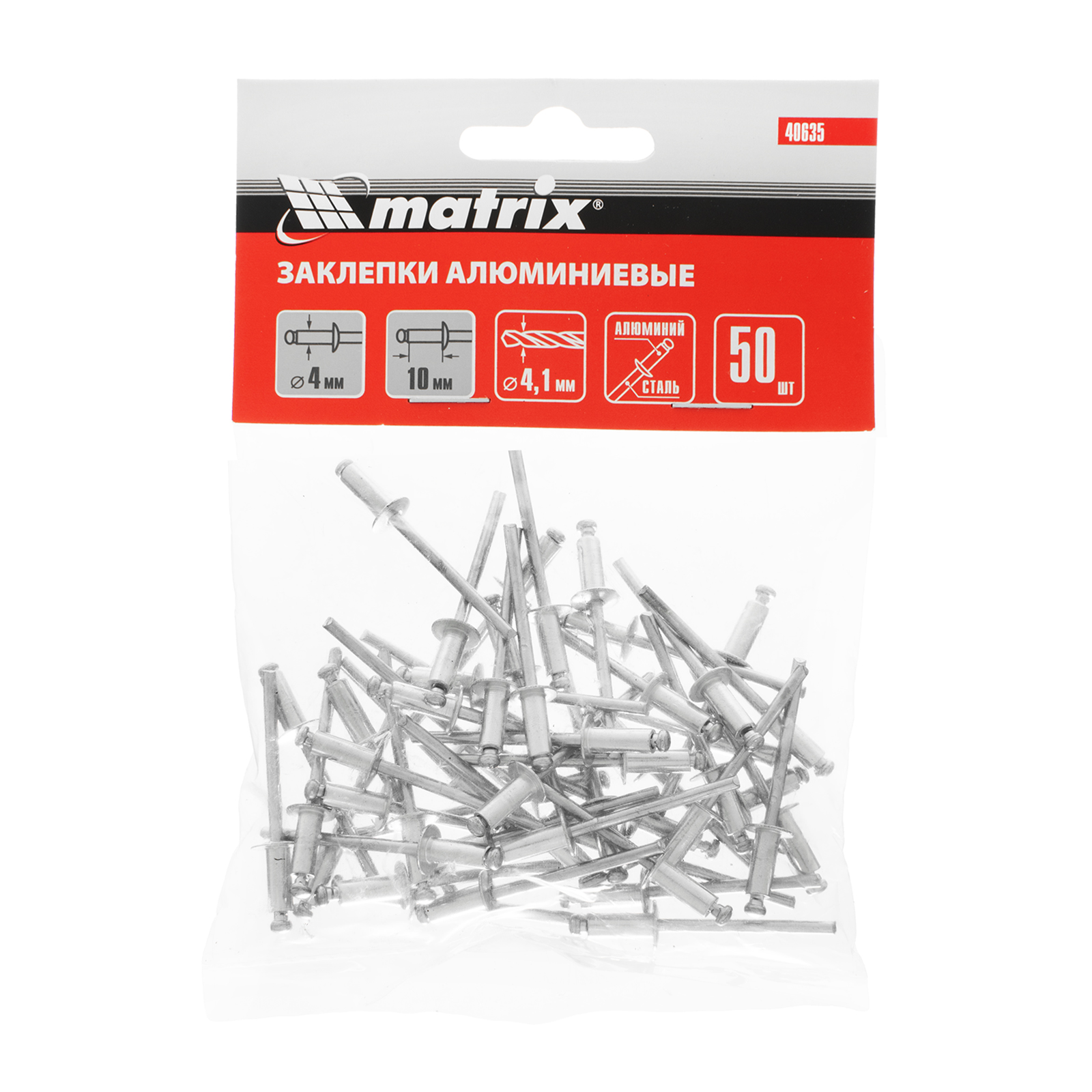 Заклепки Matrix 40635 размером 4,0 х 10 мм, 50 шт. в упаковке, предназначены для соединения листовых заготовок. Обеспечивают надежную фиксацию материалов даже при наличии доступа только с одной стороны. Используются в строительстве домов, для возведения заборов из профлиста, при производстве оборудования, будут полезны в домашней мастерской.