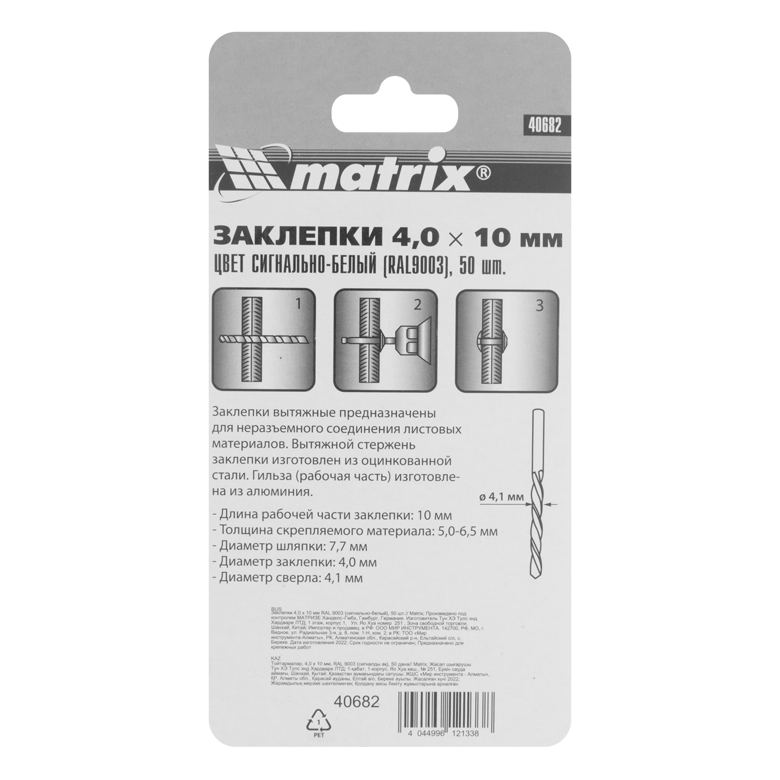 Заклепки Matrix 40682 сигнально-белого цвета (RAL 9003), размером 4,0 х 10 мм, 50 шт. в упаковке, — соединительные элементы вытяжного типа, которые используются для скрепления плоских заготовок. Позволяют создать надежное неразъемное соединение даже при одностороннем доступе к месту крепления. Применяются в профессиональной и бытовой сфере.