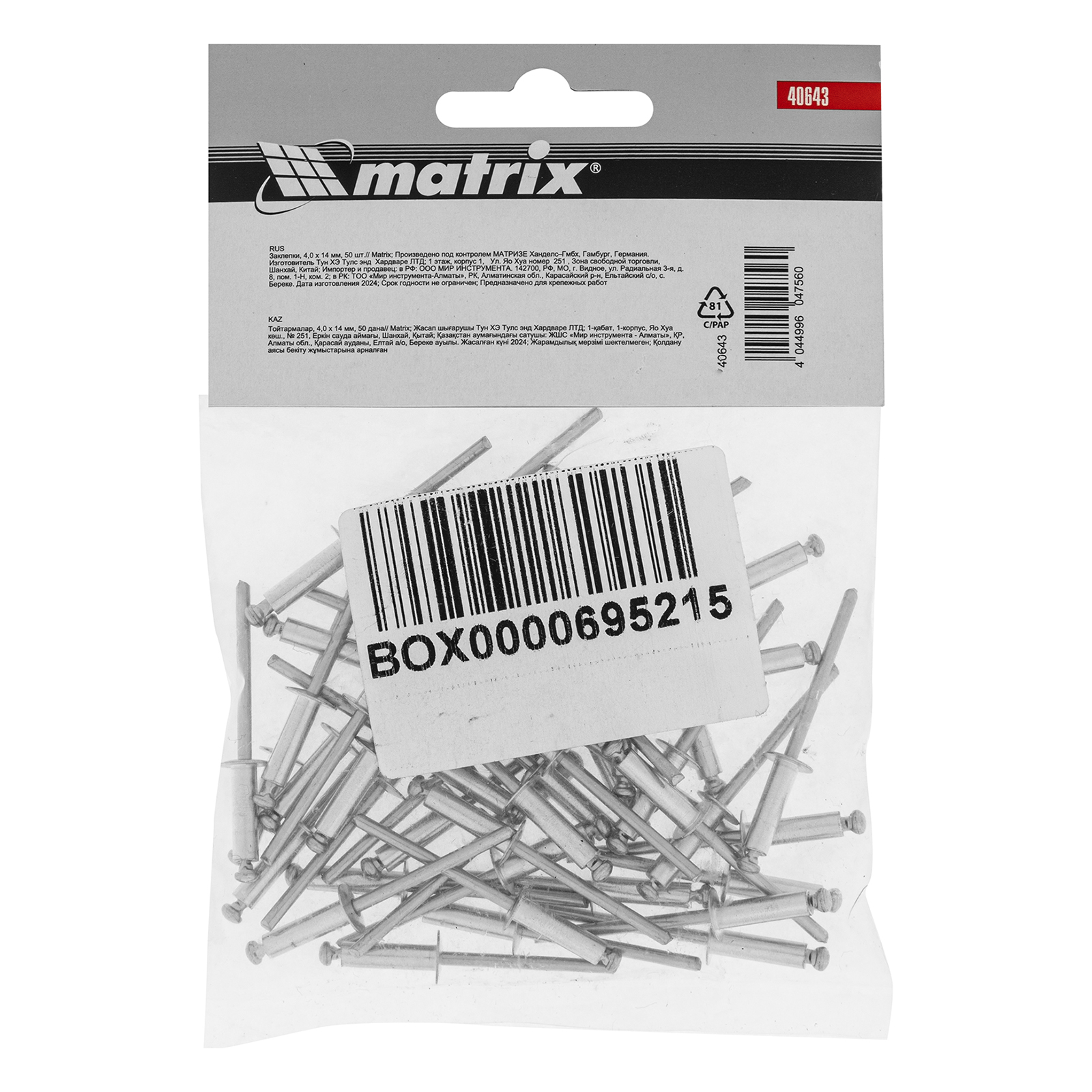 Заклепки Matrix 40643 размером 4,0 х 14 мм, 50 шт. в упаковке, предназначены для соединения листовых заготовок. Обеспечивают надежную фиксацию материалов даже при наличии доступа только с одной стороны. Используются в строительстве домов, для возведения заборов из профлиста, при производстве оборудования, будут полезны в домашней мастерской.