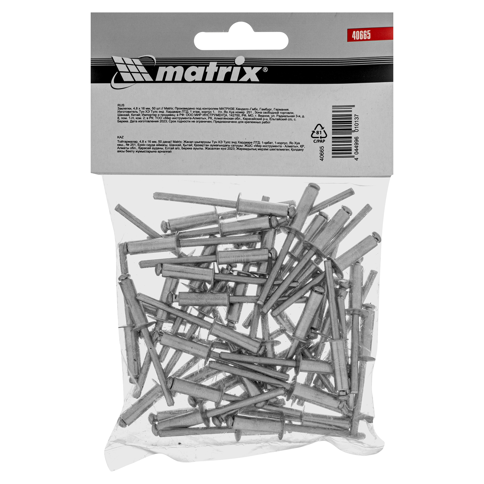 Заклепки Matrix 40665 размером 4,8 х 16 мм, 50 шт. в упаковке, предназначены для соединения листовых заготовок. Обеспечивают надежную фиксацию материалов даже при наличии доступа только с одной стороны. Используются в строительстве домов, для возведения заборов из профлиста, при производстве оборудования, будут полезны в домашней мастерской.