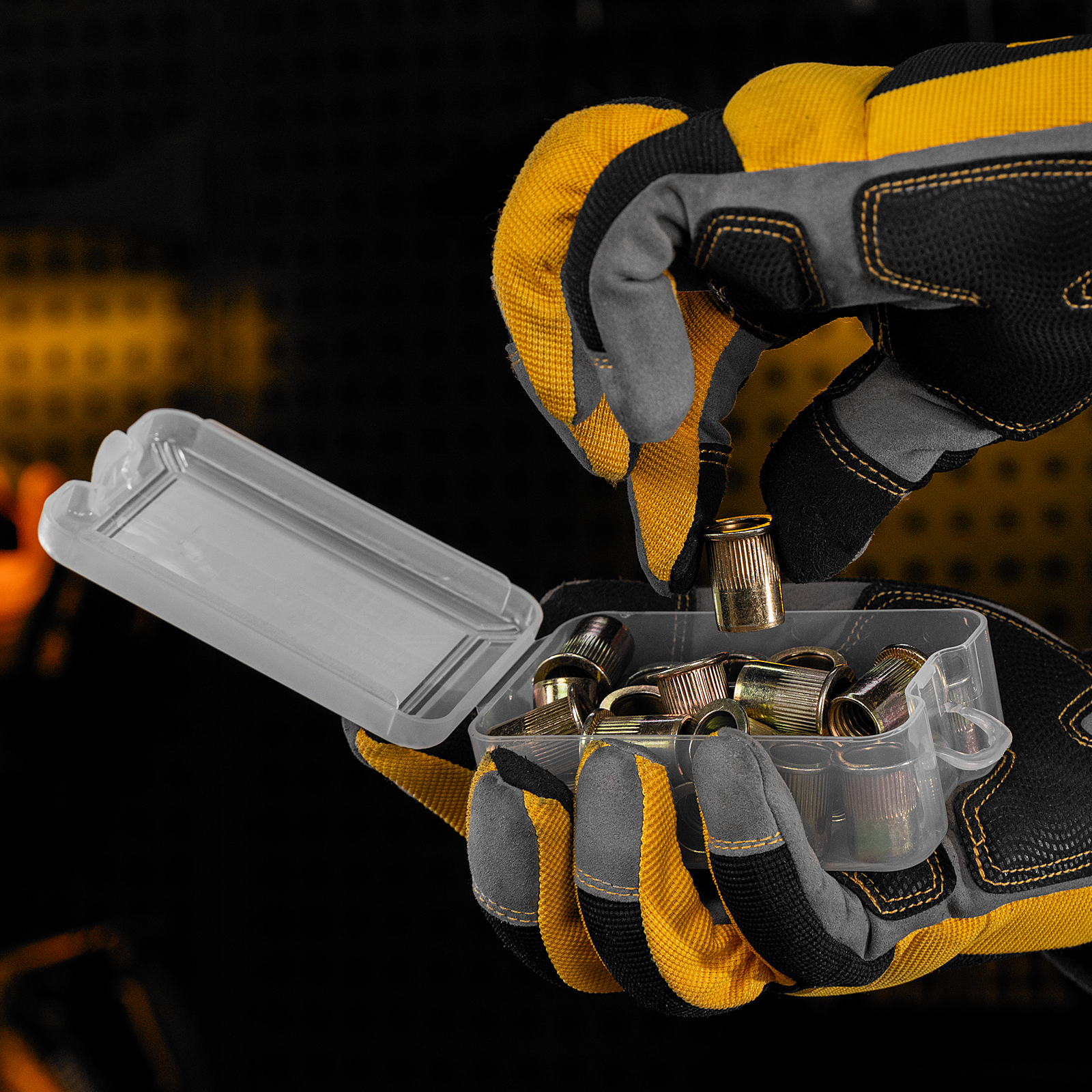 - Удобное хранение и транспортировка — заклепки поставляются в прочном пластиковом кейсе с защелкой.