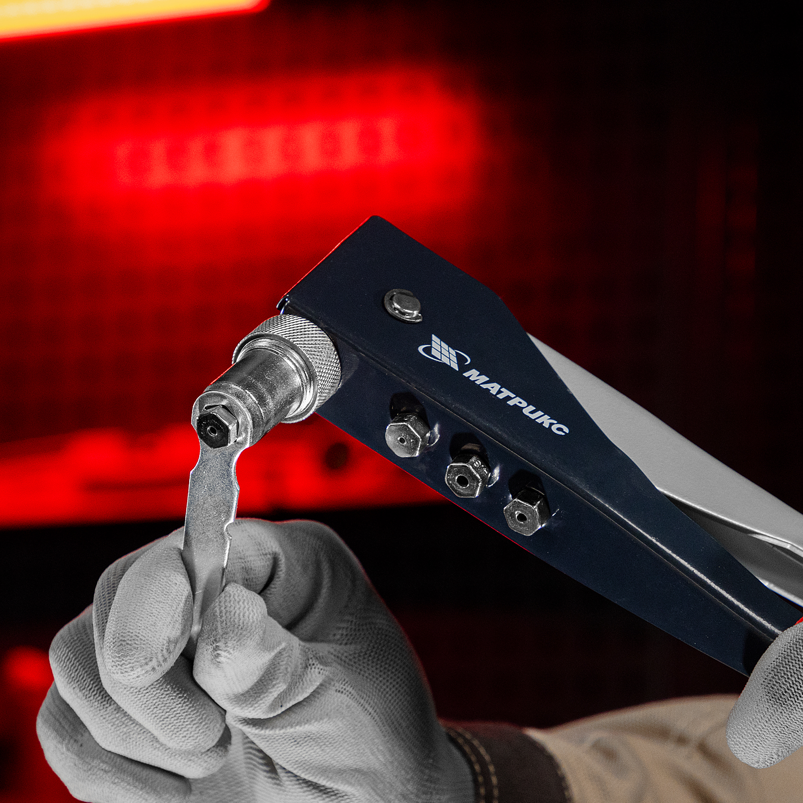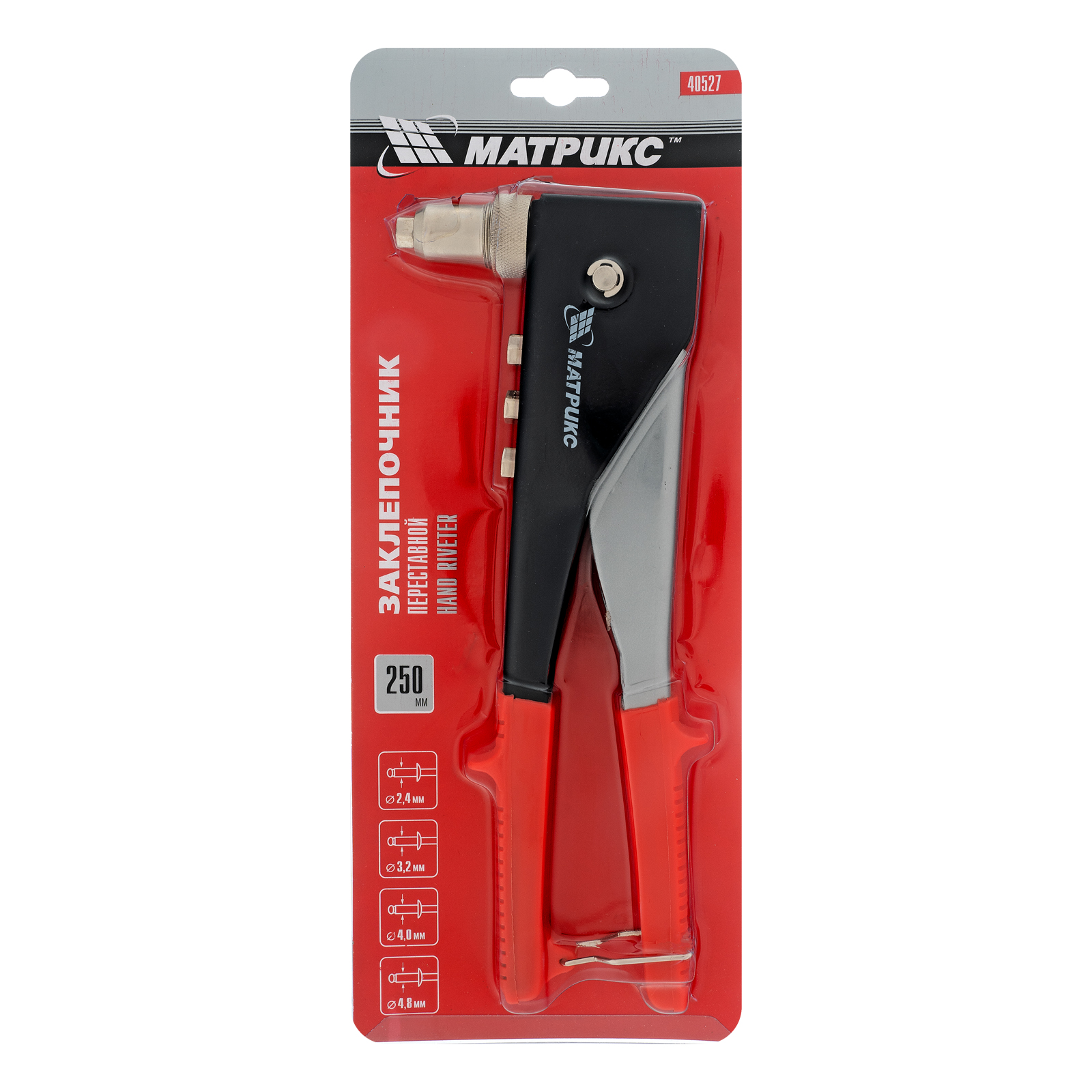 Заклепочник МАТРИКС 40527 длиной 250 мм, переставной на 0-90 градусов, предназначен для соединения листовых заготовок и плоских деталей при помощи вытяжных заклепок диаметром от 2,4 до 4,8 мм. Положение рабочей головки можно менять на 90°, что облегчает работу в труднодоступных местах. Инструмент используется в строительстве и производстве, будет полезен во время ремонта, а также дома, на даче или в гараже.