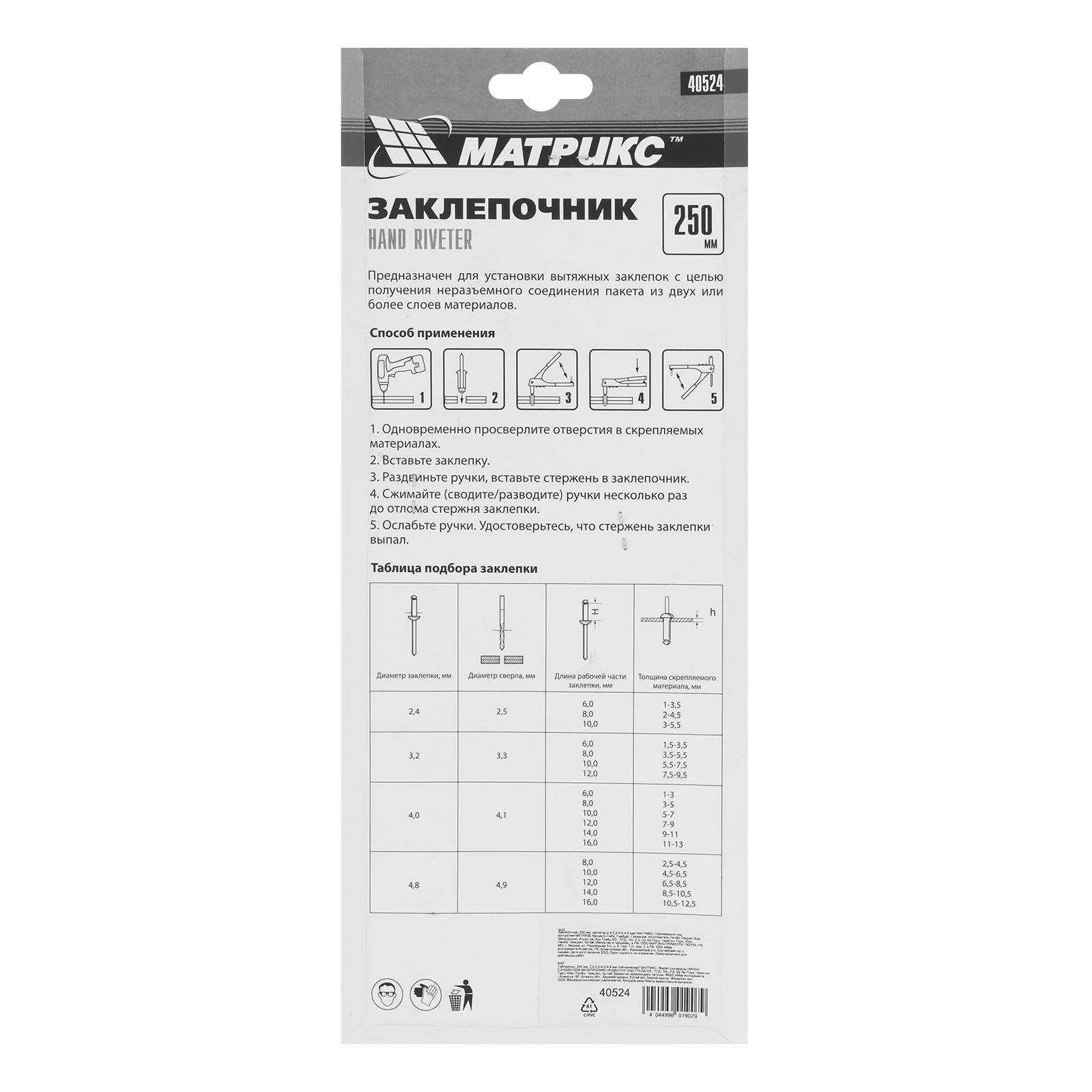 <h2>Заклепочник Матрикс 40524 длиной 250 мм используется с вытяжными заклепками диаметром от 2,4 до 4,8 мм. Инструмент применяется при работе с многослойным материалом и различными деталями из металла, пластика и т. д. В комплект входят сменные насадки для заклепок различного диаметра, фиксирующиеся на корпусе инструмента, поэтому их можно быстро менять при необходимости. Заклепочник будет полезен во время проведения строительных и ремонтных работ, пригодится также дома, в гараже или на даче.</h2><ul><li> </li><li>Преимущества</li><li>Прочность и долговечность — корпус выполнен из конструкционной стали.</li><li>Быстрая установка нужной насадки — в комплект поставки входит монтажный ключ.</li><li>Комфортная работа — рукоятки с рельефной поверхностью не выскальзывают из руки.</li><li>Удобное хранение — металлическая скоба надежно фиксирует рукоятки в нерабочем состоянии.</li></ul>