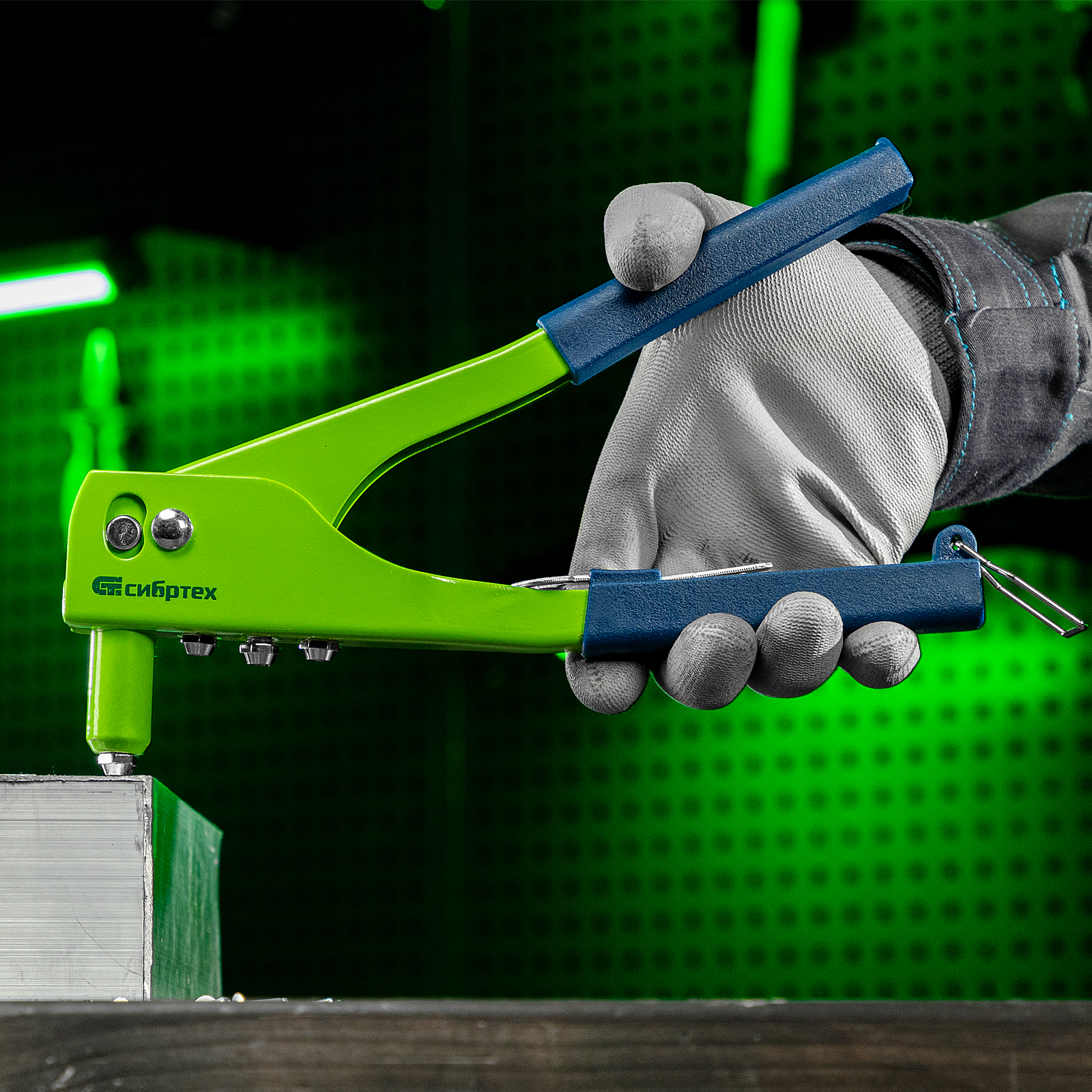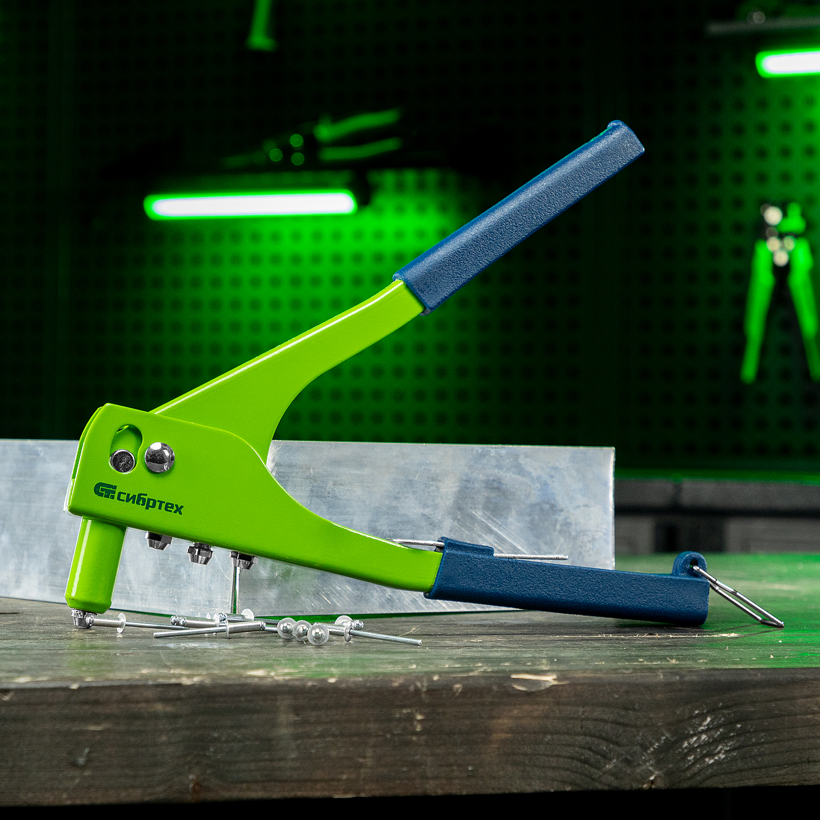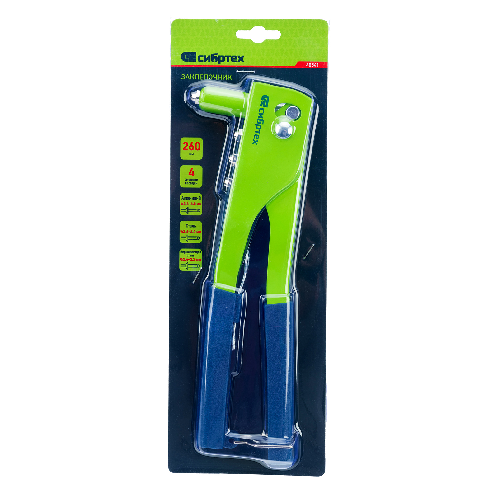 <p>Заклепочник Сибртех 40541, 260 мм, рассчитан на скрепление листовых металлических заготовок при помощи вытяжных заклепок 2,4-3,2-4,0-4,8 мм. Он обеспечивает быстрое и прочное соединение материалов. Заклепочник предназначен для непрофессионального применения, пригодится при проведении строительных и ремонтных работ.</p><h2>Преимущества</h2><ul><li>Высокий ресурс и прочность — корпус заклепочника выполнен из стали методом штамповки.</li><li>Эргономичные рукоятки из ПВХ надежно ложатся в руку и препятствуют проскальзыванию инструмента.</li><li>Небольшой вес заклепочника 608 г способствует снижению усталости при выполнении работ.</li><li>В комплекте с заклепочником идут насадки для заклепок и ключ для их замены.</li></ul>