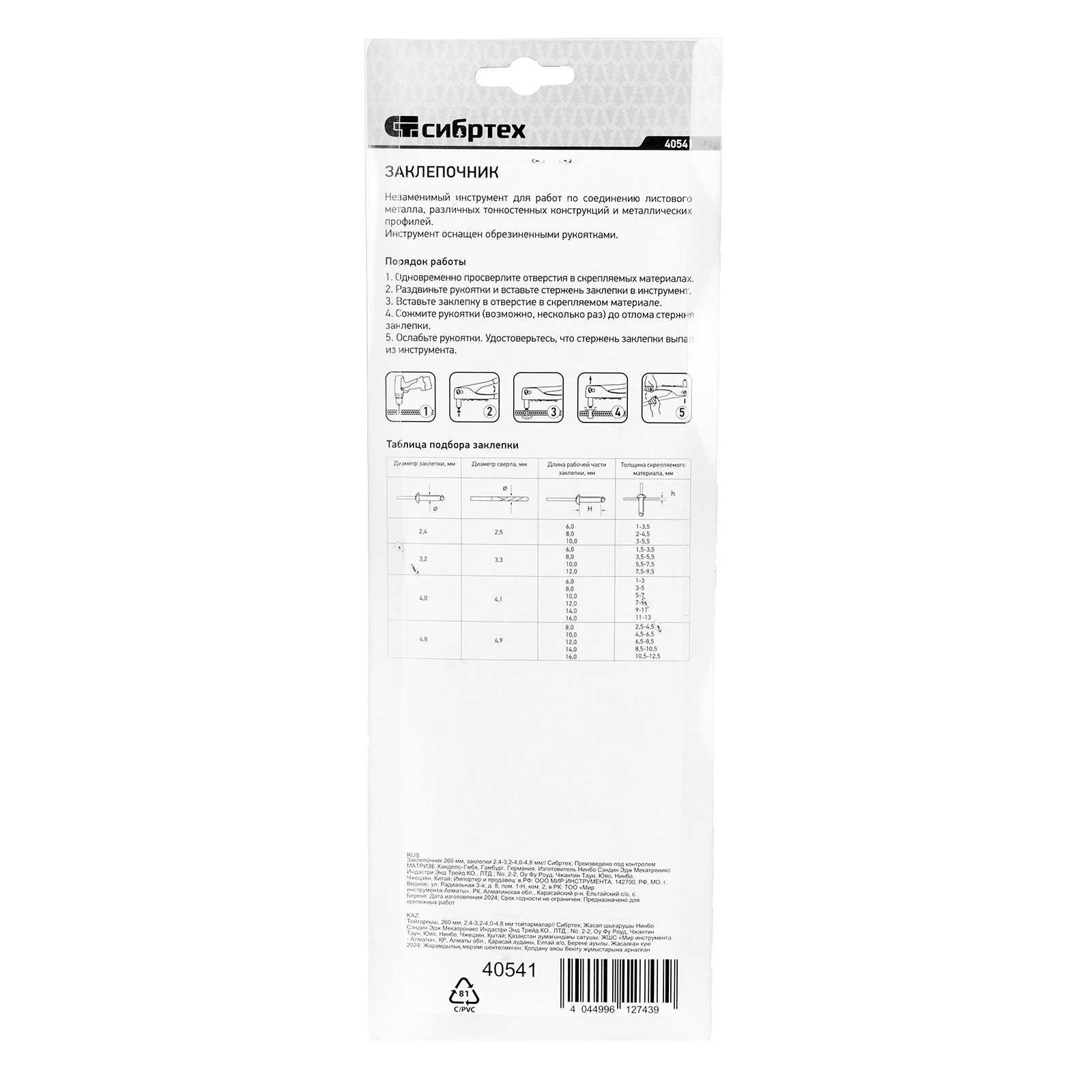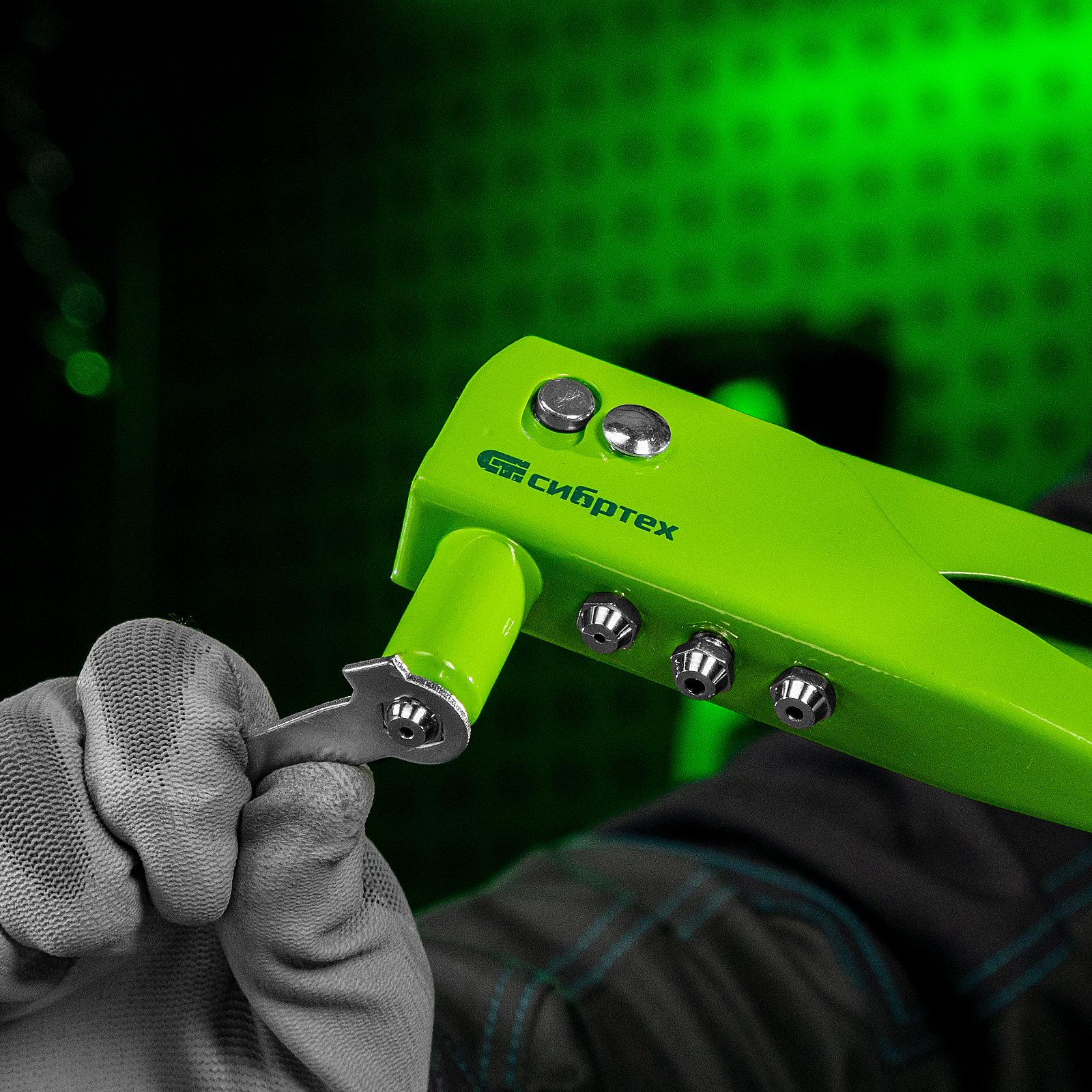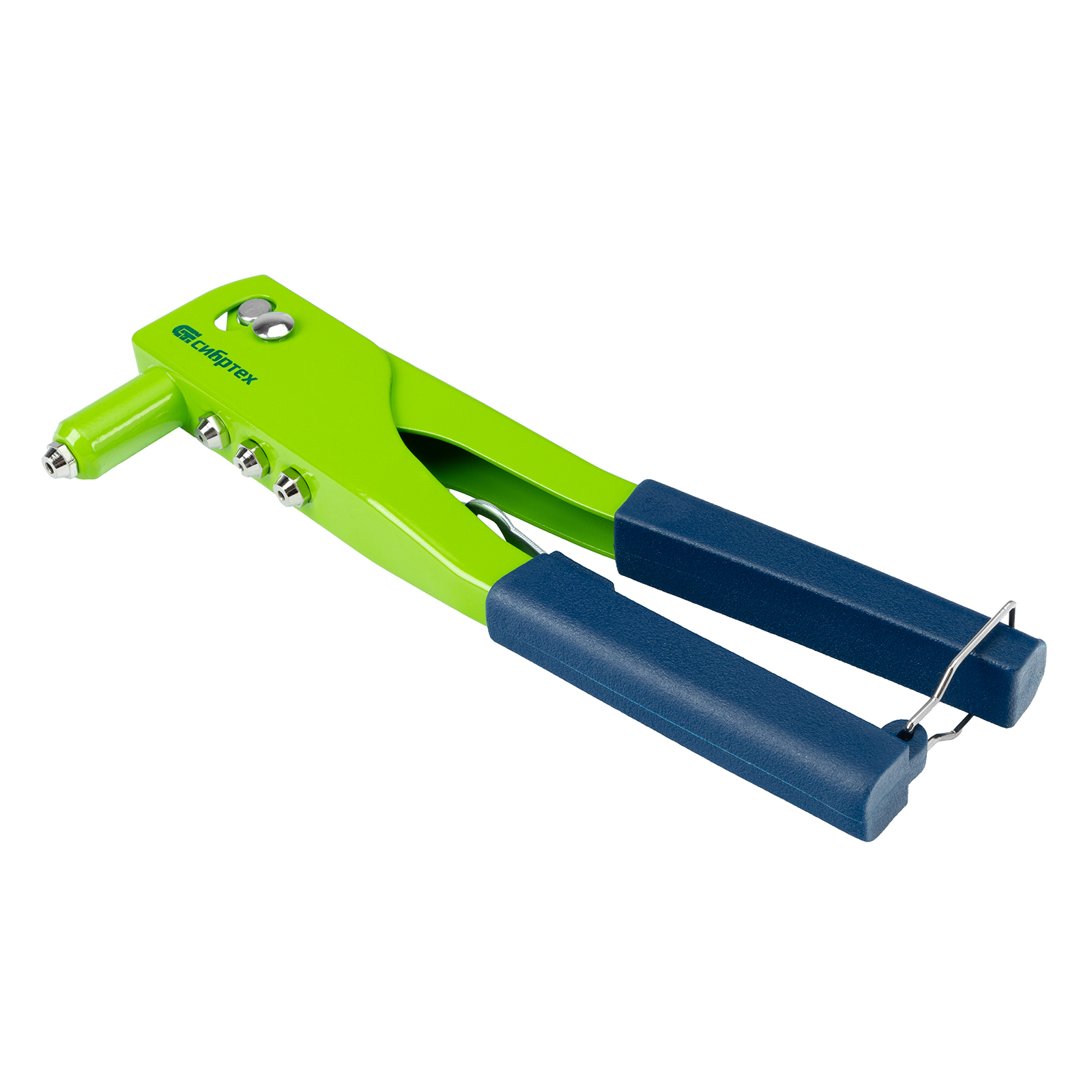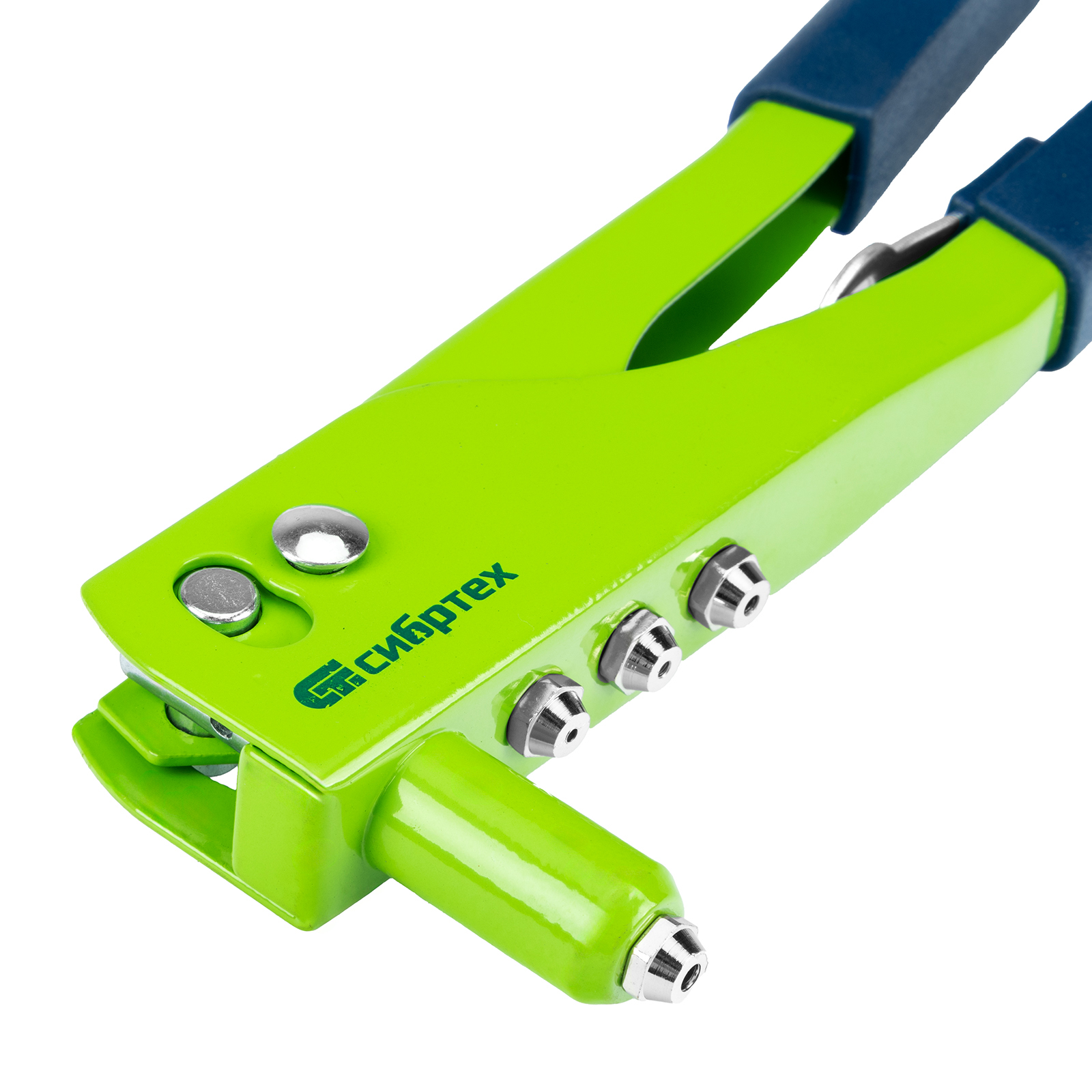 <p>Заклепочник Сибртех 40541, 260 мм, рассчитан на скрепление листовых металлических заготовок при помощи вытяжных заклепок 2,4-3,2-4,0-4,8 мм. Он обеспечивает быстрое и прочное соединение материалов. Заклепочник предназначен для непрофессионального применения, пригодится при проведении строительных и ремонтных работ.</p><h2>Преимущества</h2><ul><li>Высокий ресурс и прочность — корпус заклепочника выполнен из стали методом штамповки.</li><li>Эргономичные рукоятки из ПВХ надежно ложатся в руку и препятствуют проскальзыванию инструмента.</li><li>Небольшой вес заклепочника 608 г способствует снижению усталости при выполнении работ.</li><li>В комплекте с заклепочником идут насадки для заклепок и ключ для их замены.</li></ul>