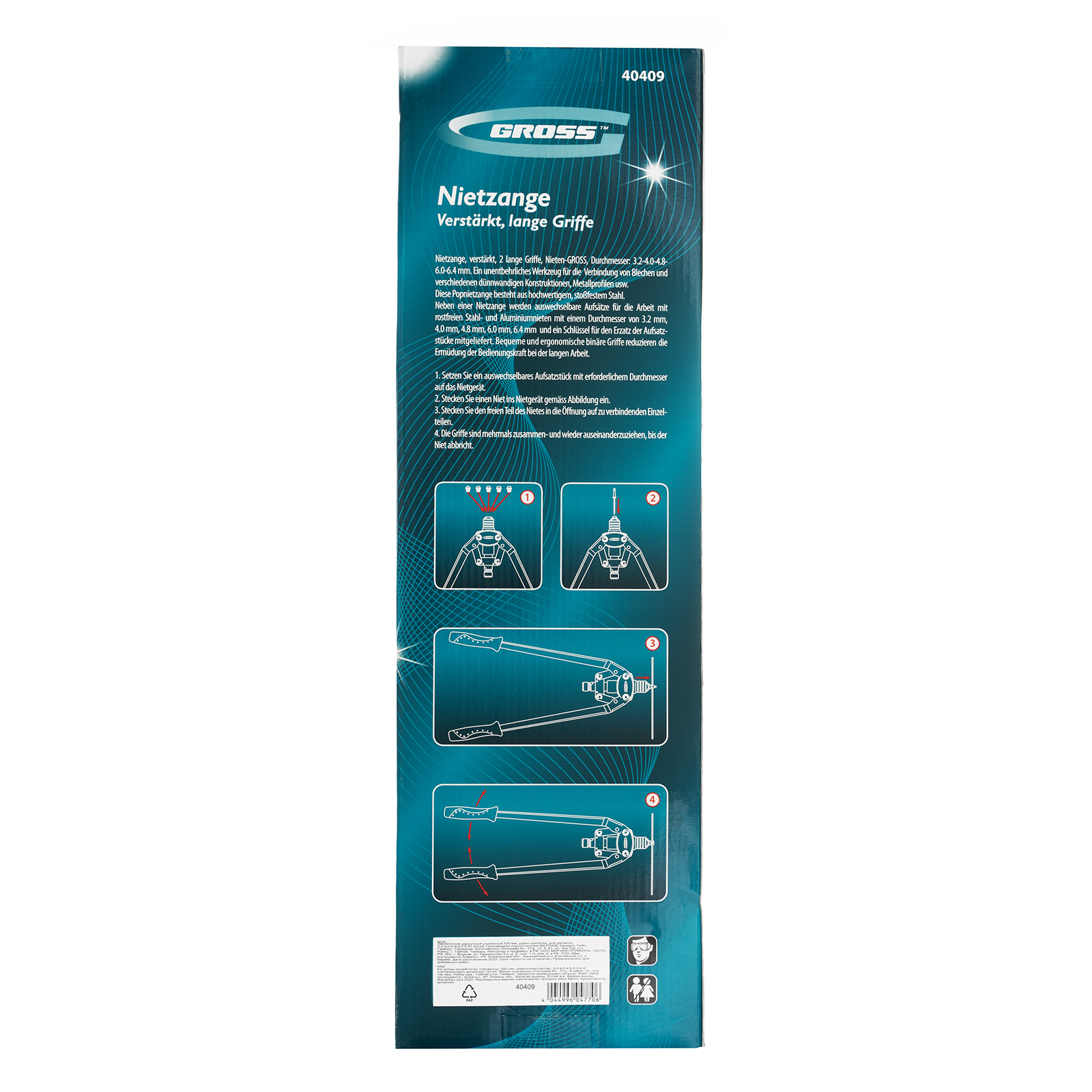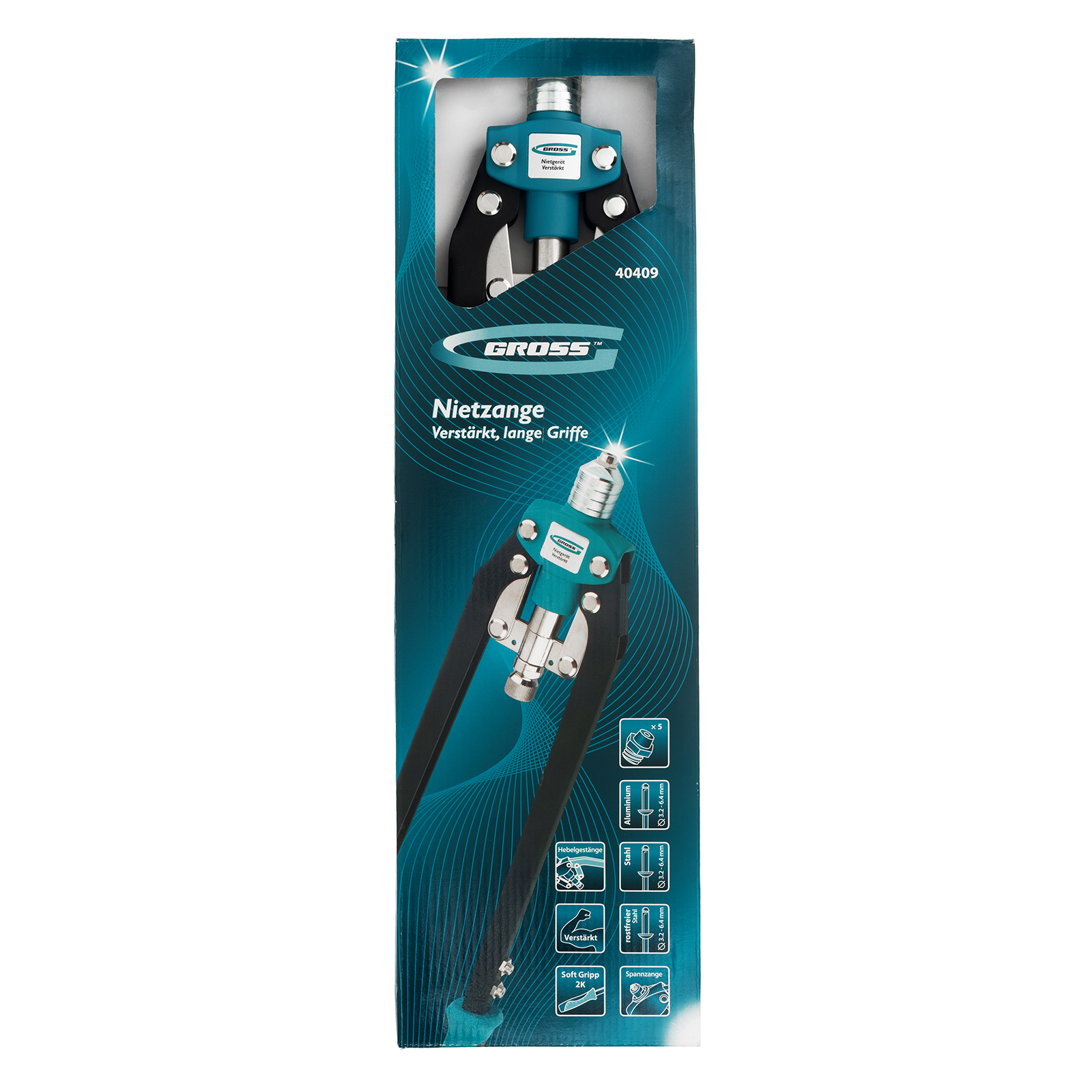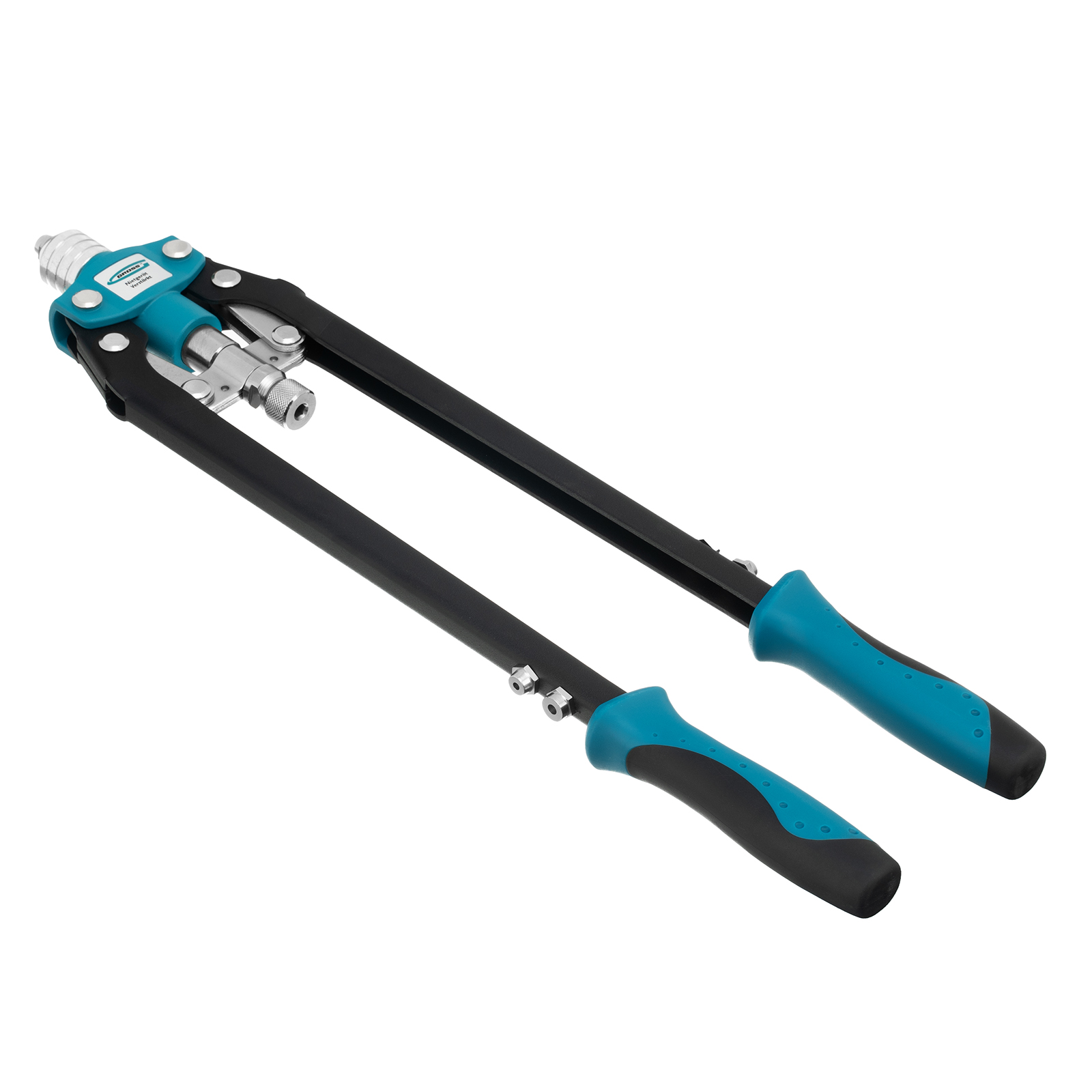 Двуручный усиленный заклепочник Gross 40409 длиной 520 мм, с удлиненными рукоятками, предназначен для соединения листовых заготовок, металлопрофиля, легких строительных конструкций и плоских деталей при помощи алюминиевых или стальных (в том числе из нержавеющей стали) заклепок размером 3,2-4,0-4,8-6,0-6,4 мм, для которых предусмотрены сменные насадки соответствующих размеров. Благодаря удлиненным рукояткам процесс клепки требует меньше усилий, чем при применении обычного инструмента. Заклепочник используется при проведении строительных и ремонтных работ, в производстве мебели, бытовой и оргтехники, а также при ремонте автомобилей.