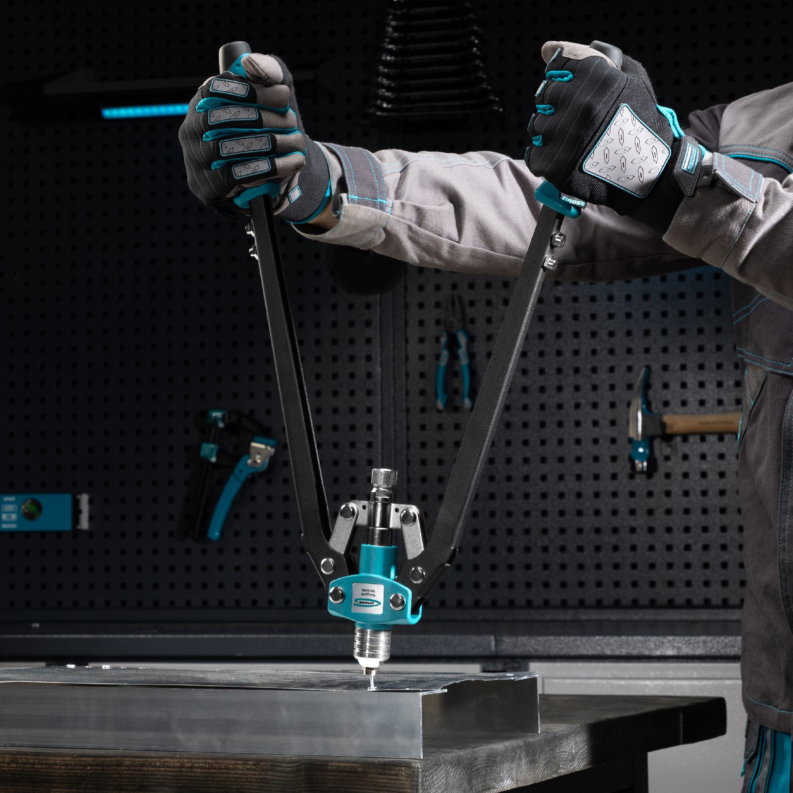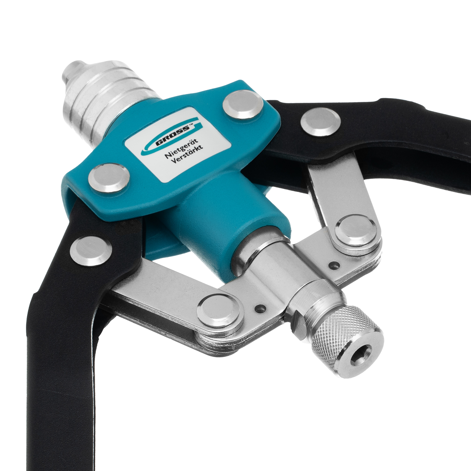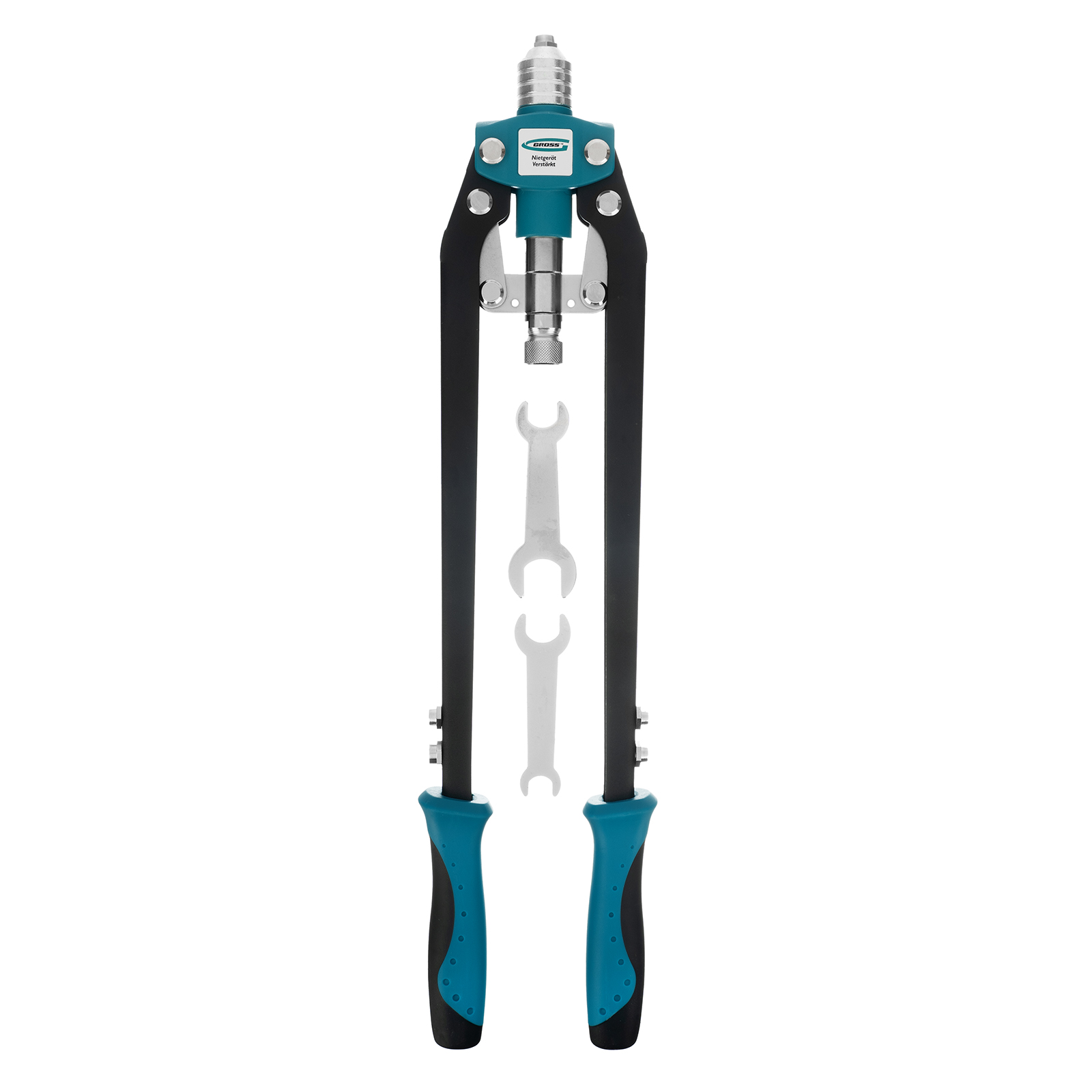 Двуручный усиленный заклепочник Gross 40409 длиной 520 мм, с удлиненными рукоятками, предназначен для соединения листовых заготовок, металлопрофиля, легких строительных конструкций и плоских деталей при помощи алюминиевых или стальных (в том числе из нержавеющей стали) заклепок размером 3,2-4,0-4,8-6,0-6,4 мм, для которых предусмотрены сменные насадки соответствующих размеров. Благодаря удлиненным рукояткам процесс клепки требует меньше усилий, чем при применении обычного инструмента. Заклепочник используется при проведении строительных и ремонтных работ, в производстве мебели, бытовой и оргтехники, а также при ремонте автомобилей.