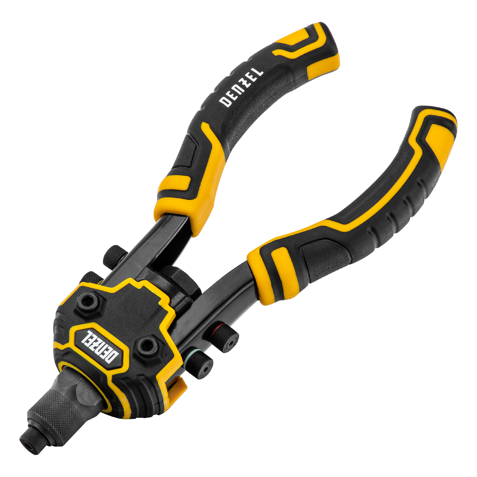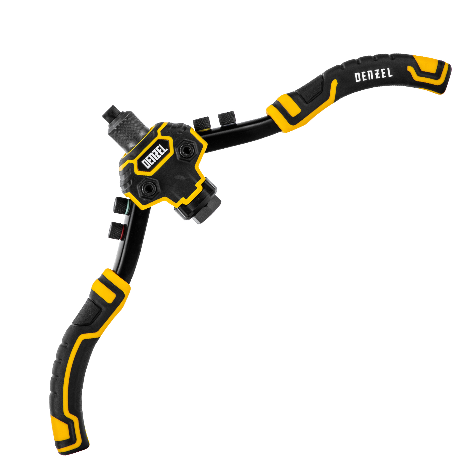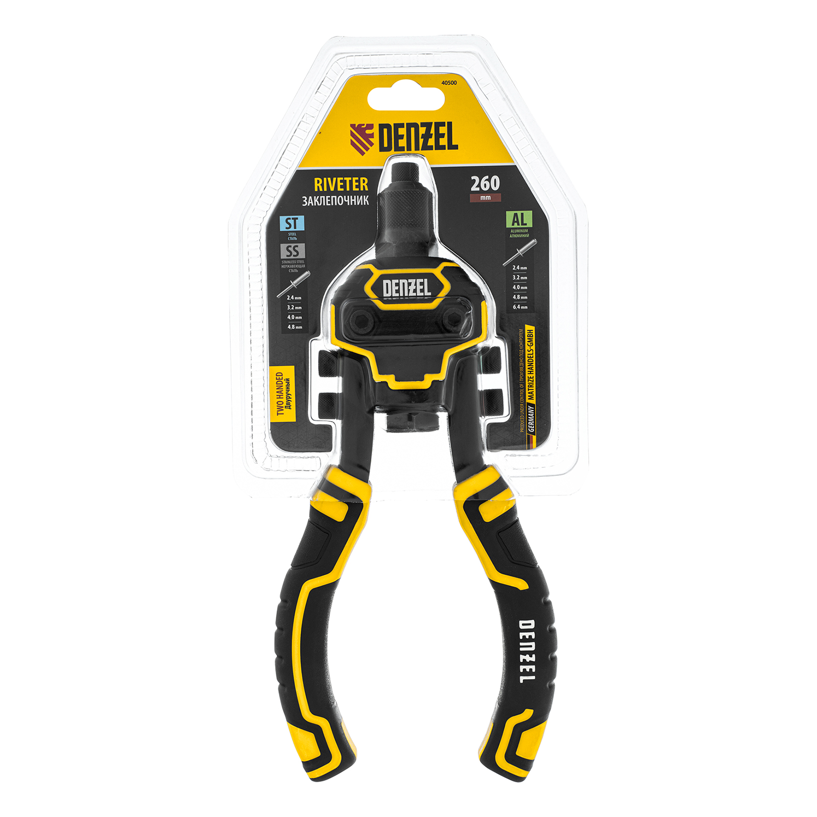 Заклепочник двуручный Denzel 40500 длиной 250 мм предназначен для работы с алюминиевыми и стальными заклепками диаметром 2,4-6,4 мм и 2,4-4,8 мм соответственно. Используется для прочного соединения листовых металлических заготовок, легких конструкций небольшой толщины и металлопрофилей. Двуручный заклепочник требует меньше усилий от пользователя для вытягивания шпильки, поэтому подходит для профессионального применения и выполнения больших объемов работ.