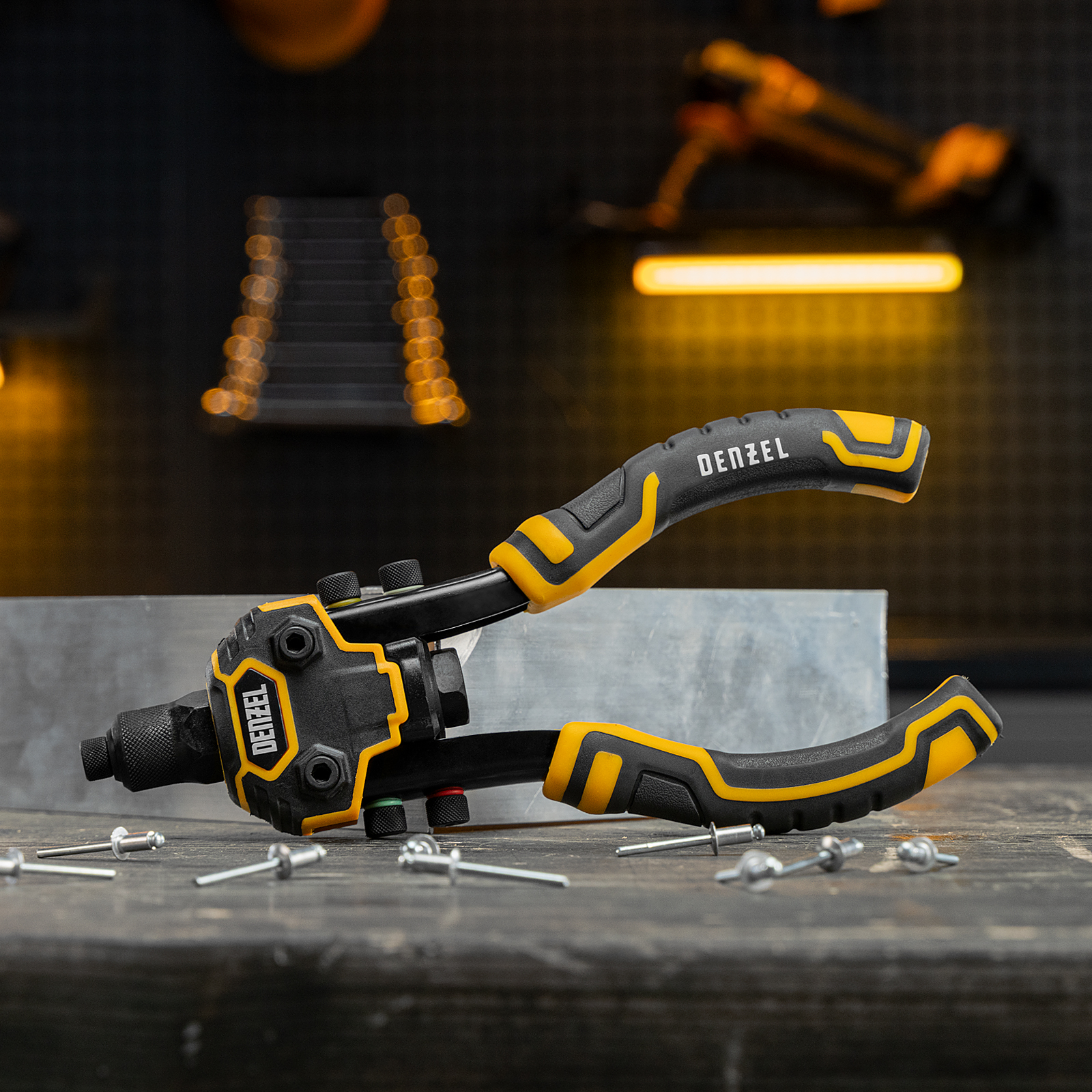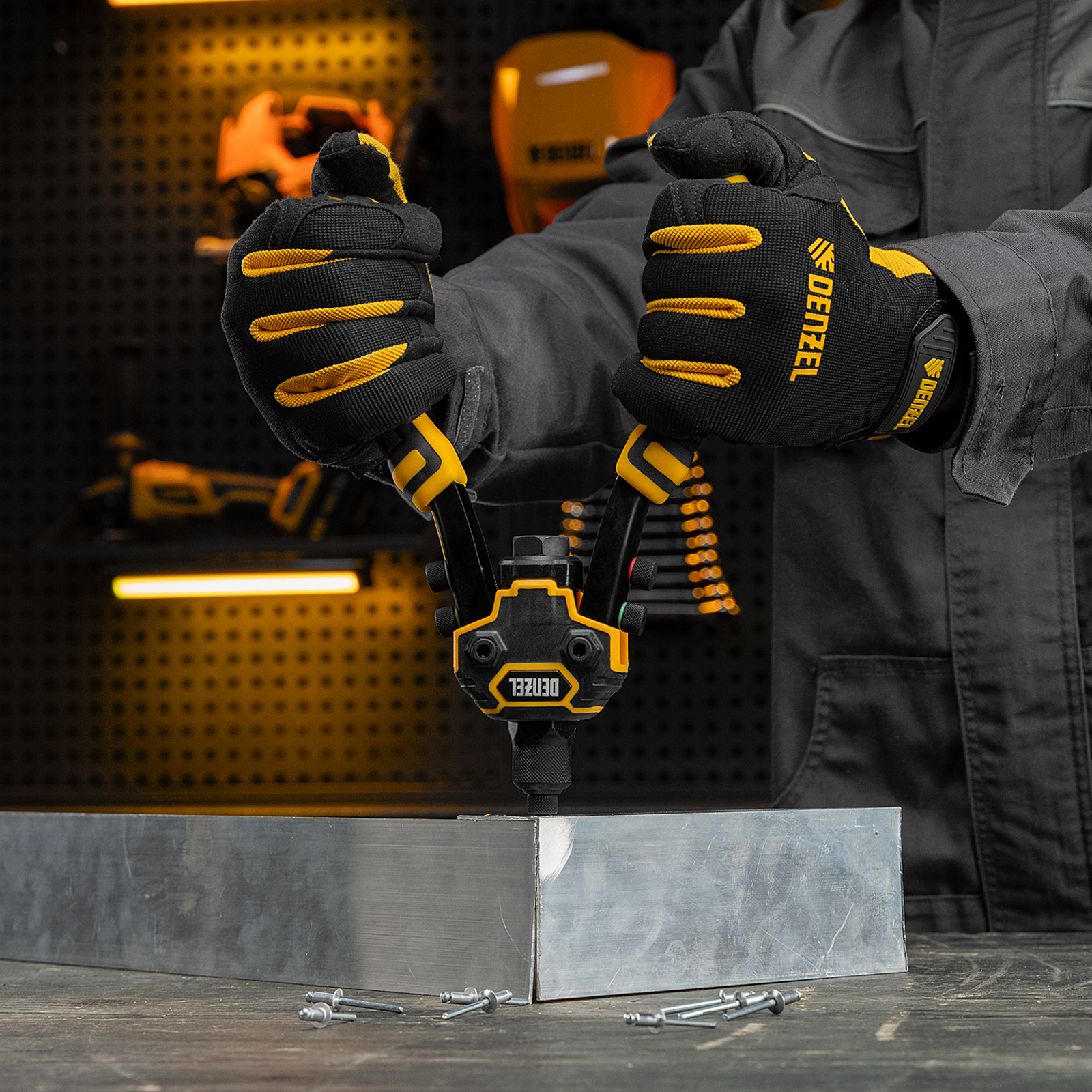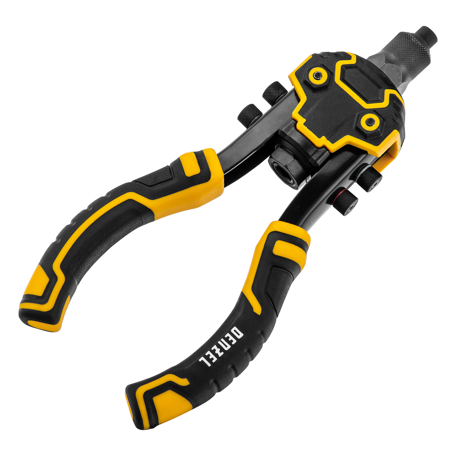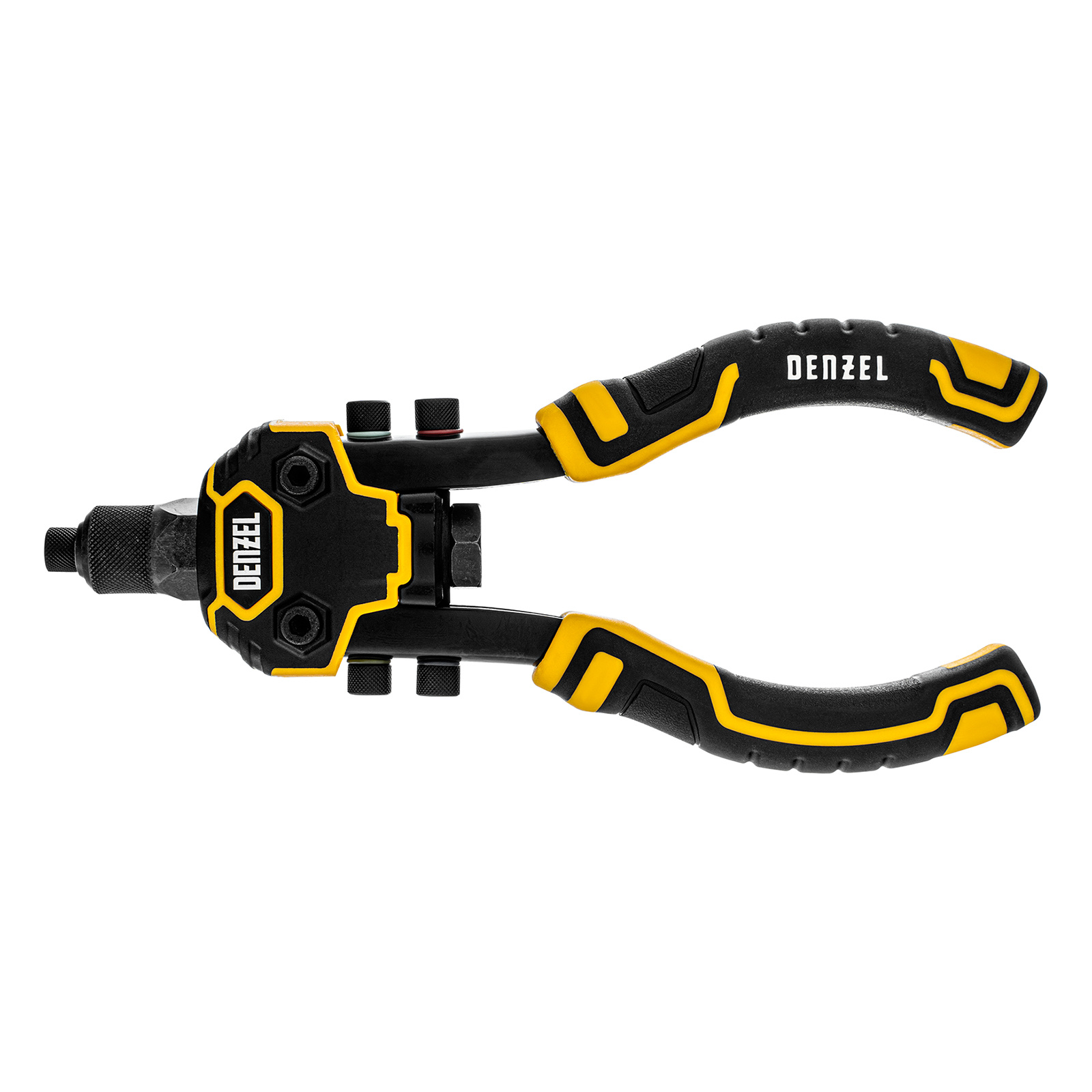 Заклепочник двуручный Denzel 40500 длиной 250 мм предназначен для работы с алюминиевыми и стальными заклепками диаметром 2,4-6,4 мм и 2,4-4,8 мм соответственно. Используется для прочного соединения листовых металлических заготовок, легких конструкций небольшой толщины и металлопрофилей. Двуручный заклепочник требует меньше усилий от пользователя для вытягивания шпильки, поэтому подходит для профессионального применения и выполнения больших объемов работ.