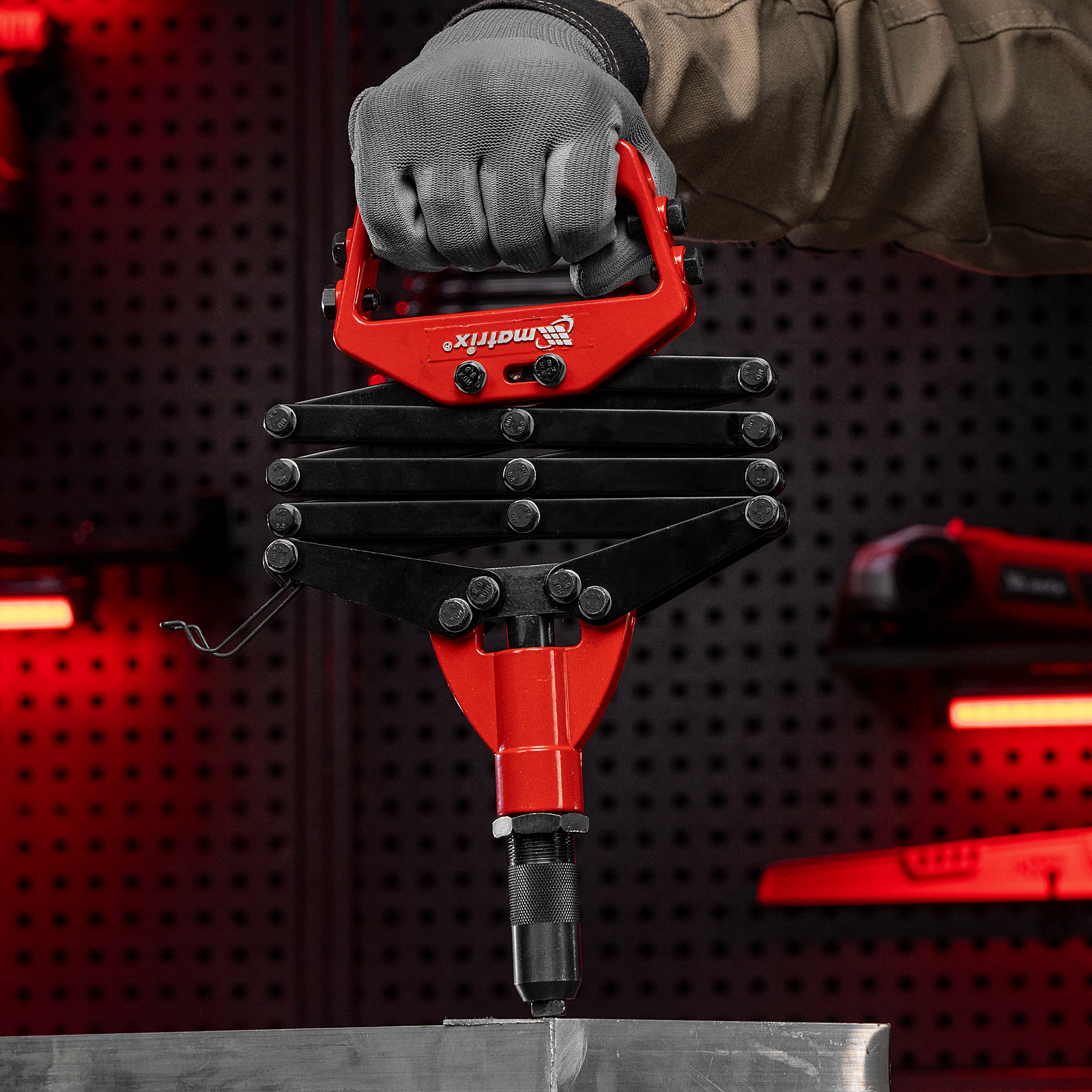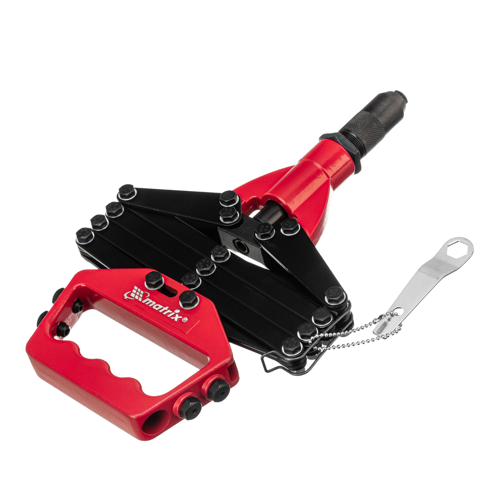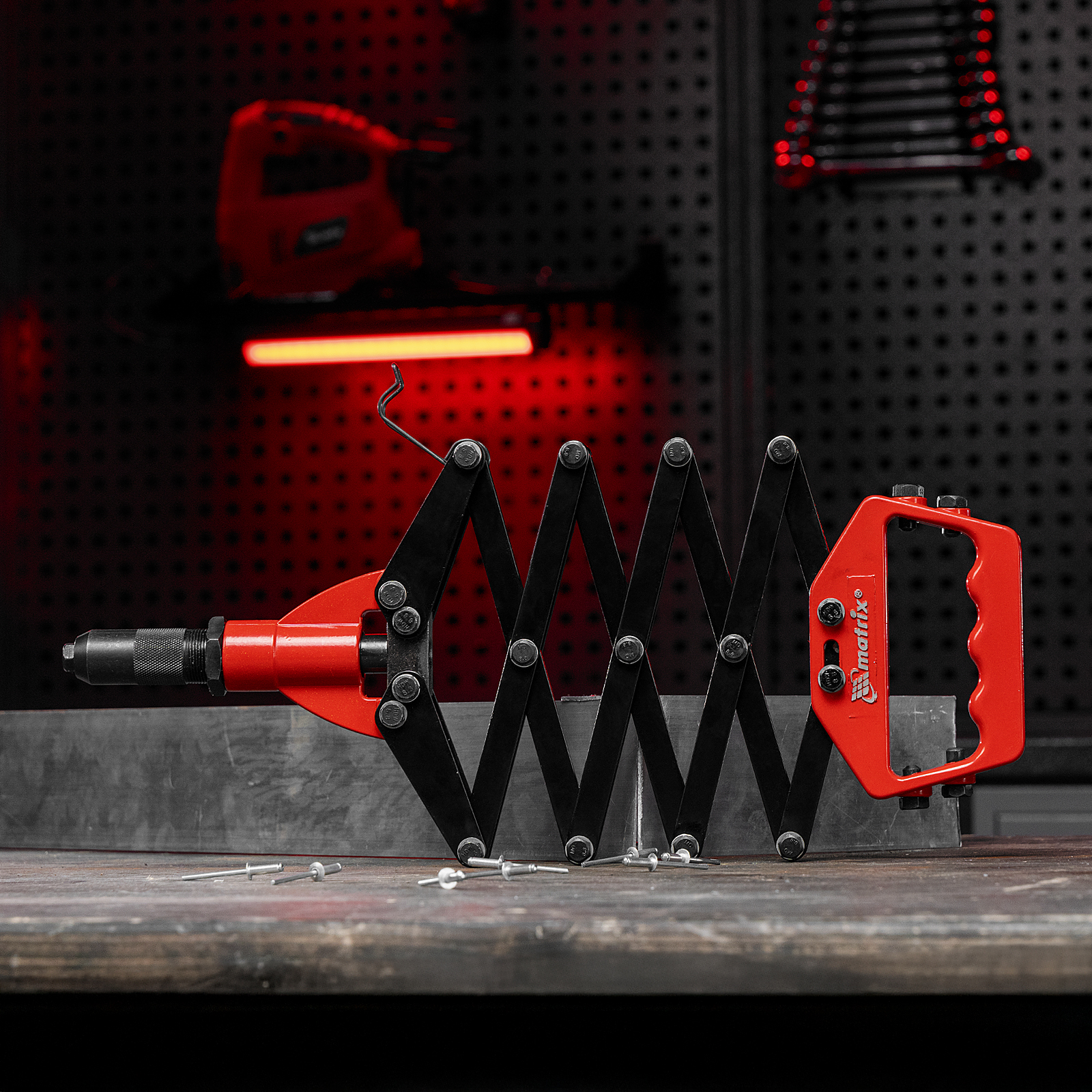 <p>Усиленный заклепочник Matrix «Гармошка» 405505 длиной 800 мм позволяет соединять металлические листы и профили при помощи вытяжных заклепок диаметром 3,2-4,0-4,8-6,0-6,4 мм. В комплект поставки входят сменные головки соответствующих размеров. Прижимной механизм в виде пантографа экономит усилия, облегчая интенсивную работу. Инструмент используется в строительстве, на производстве и в ремонтных мастерских, а также пригодится в быту.</p><h2>Преимущества</h2><ul><li>Прочность и долговечность — литой корпус изготовлен из алюминиевого сплава, а цанговый механизм — из прочной хромомолибденовой стали.</li><li>Надежная фиксация крепежа — трехлепестковый зажимной механизм крепко удерживает вытяжной стержень заклепки</li><li>Удобное хранение и транспортировка — прижимной механизм удерживается в сложенном состоянии при помощи металлической скобы.</li></ul>