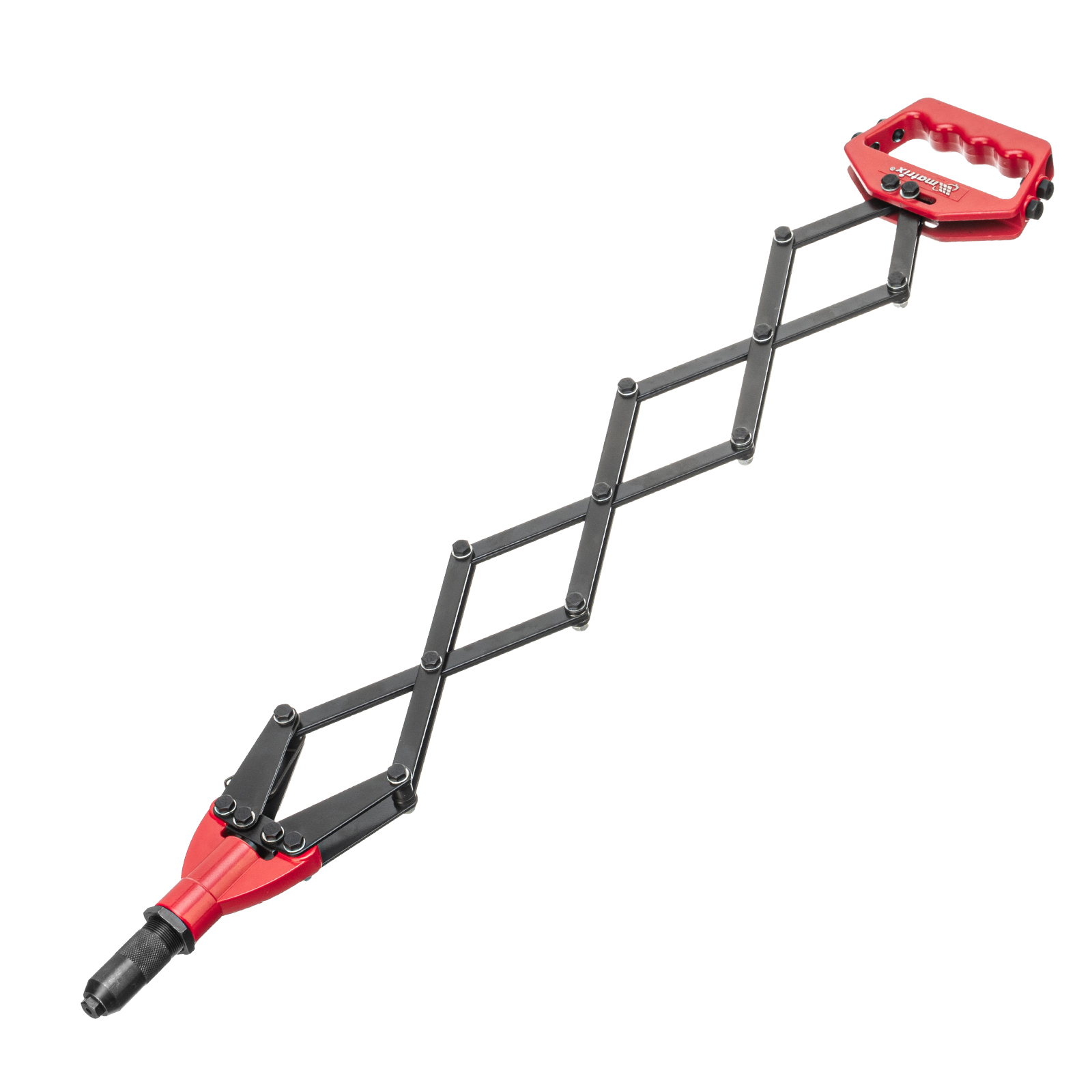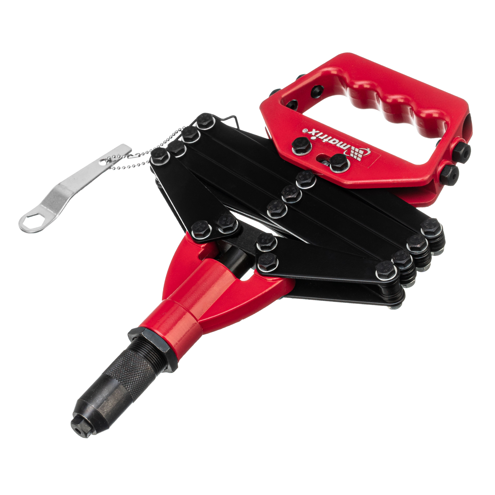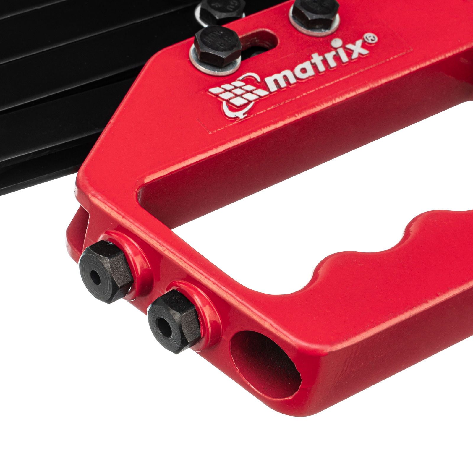 <p>Усиленный заклепочник Matrix «Гармошка» 405505 длиной 800 мм позволяет соединять металлические листы и профили при помощи вытяжных заклепок диаметром 3,2-4,0-4,8-6,0-6,4 мм. В комплект поставки входят сменные головки соответствующих размеров. Прижимной механизм в виде пантографа экономит усилия, облегчая интенсивную работу. Инструмент используется в строительстве, на производстве и в ремонтных мастерских, а также пригодится в быту.</p><h2>Преимущества</h2><ul><li>Прочность и долговечность — литой корпус изготовлен из алюминиевого сплава, а цанговый механизм — из прочной хромомолибденовой стали.</li><li>Надежная фиксация крепежа — трехлепестковый зажимной механизм крепко удерживает вытяжной стержень заклепки</li><li>Удобное хранение и транспортировка — прижимной механизм удерживается в сложенном состоянии при помощи металлической скобы.</li></ul>