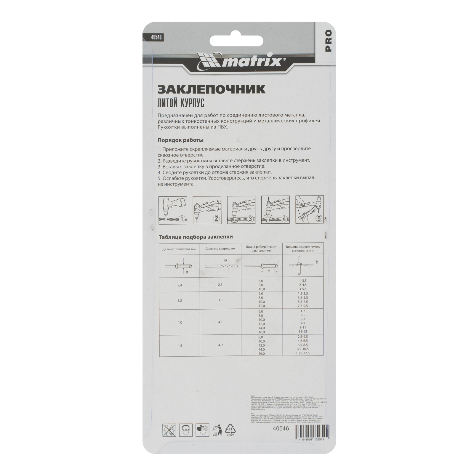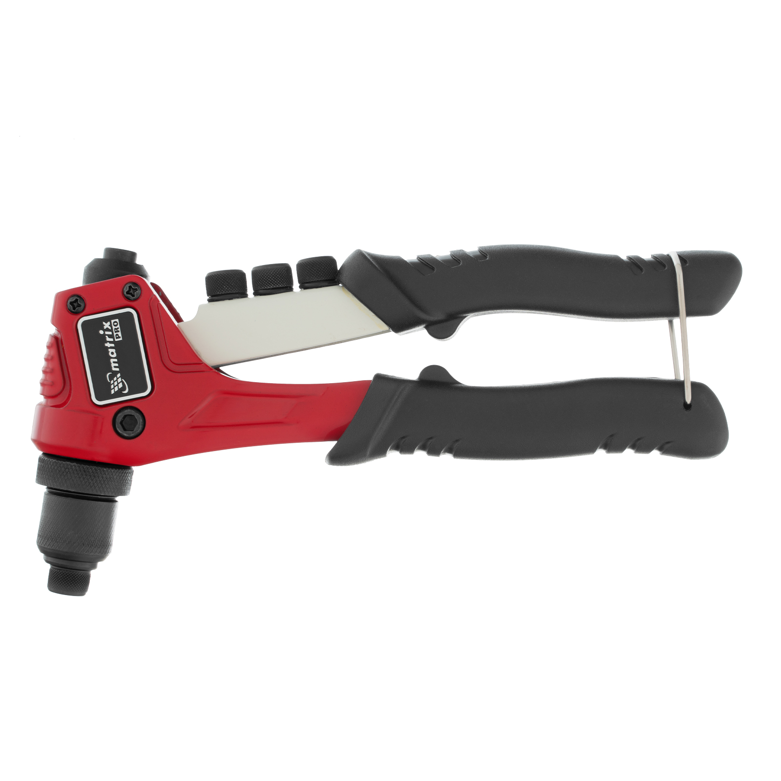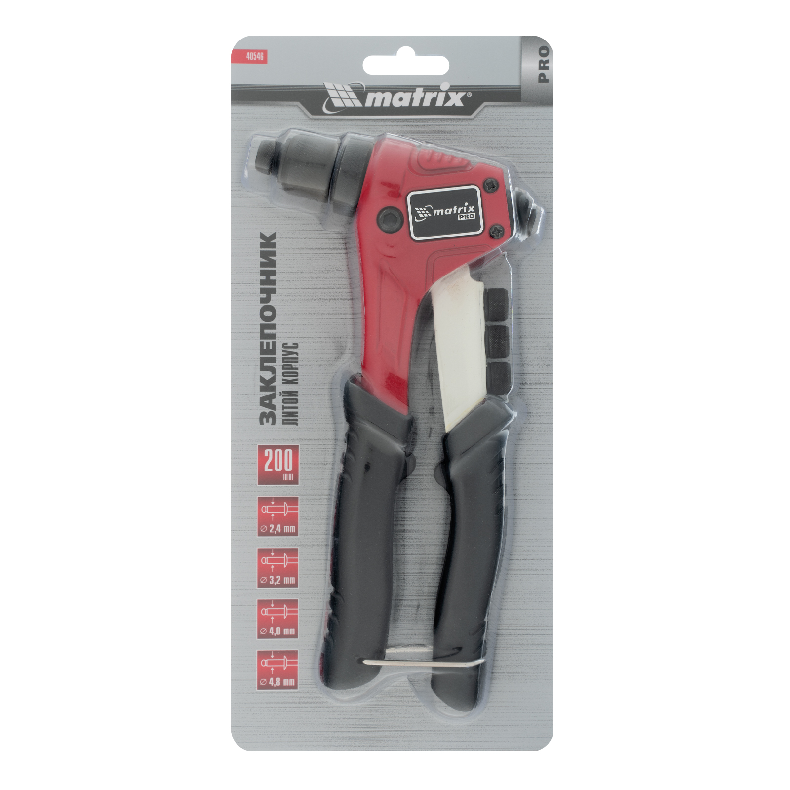 Ручной литой заклепочник Matrix PRO 40546 длиной 200 мм позволяет выполнять скрепление металлических заготовок с помощью вытяжных заклепок диаметром 2,4-3,2-4,0-4,8 мм. Метод сквозного монтажа на вытяжные заклепки обеспечивает прочность и надежность соединений. Инструмент пригодится как частным мастерам, так и профессионалам при проведении ремонта, установке забора и т.д.