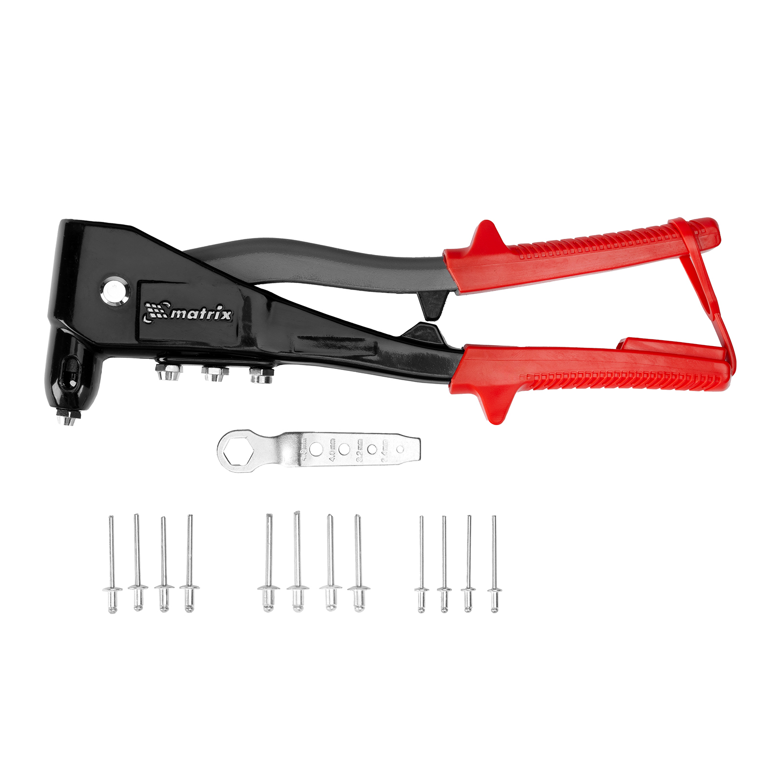Литой заклепочник Matrix 40552 длиной 260 мм, с набором заклепок диаметром 2,4-3,2-4,0-4,8 мм, формирует прочные неразъемные соединения металлических листов и профилей. Используется с заклепками разного размера, для которых предусмотрены сменные насадки. Инструмент применяется в строительстве, во время ремонта, сборки мебели и техники, а также полезен в быту.