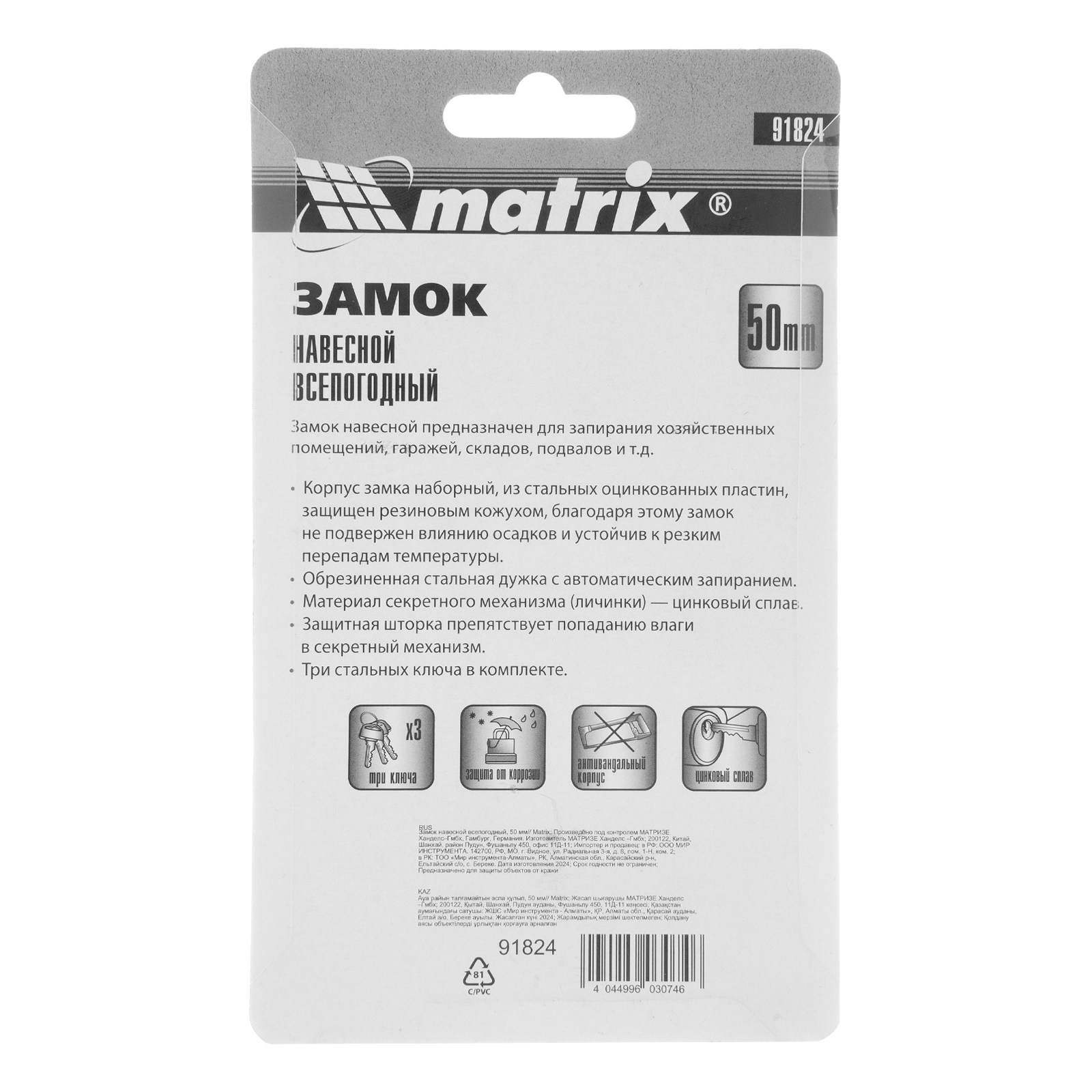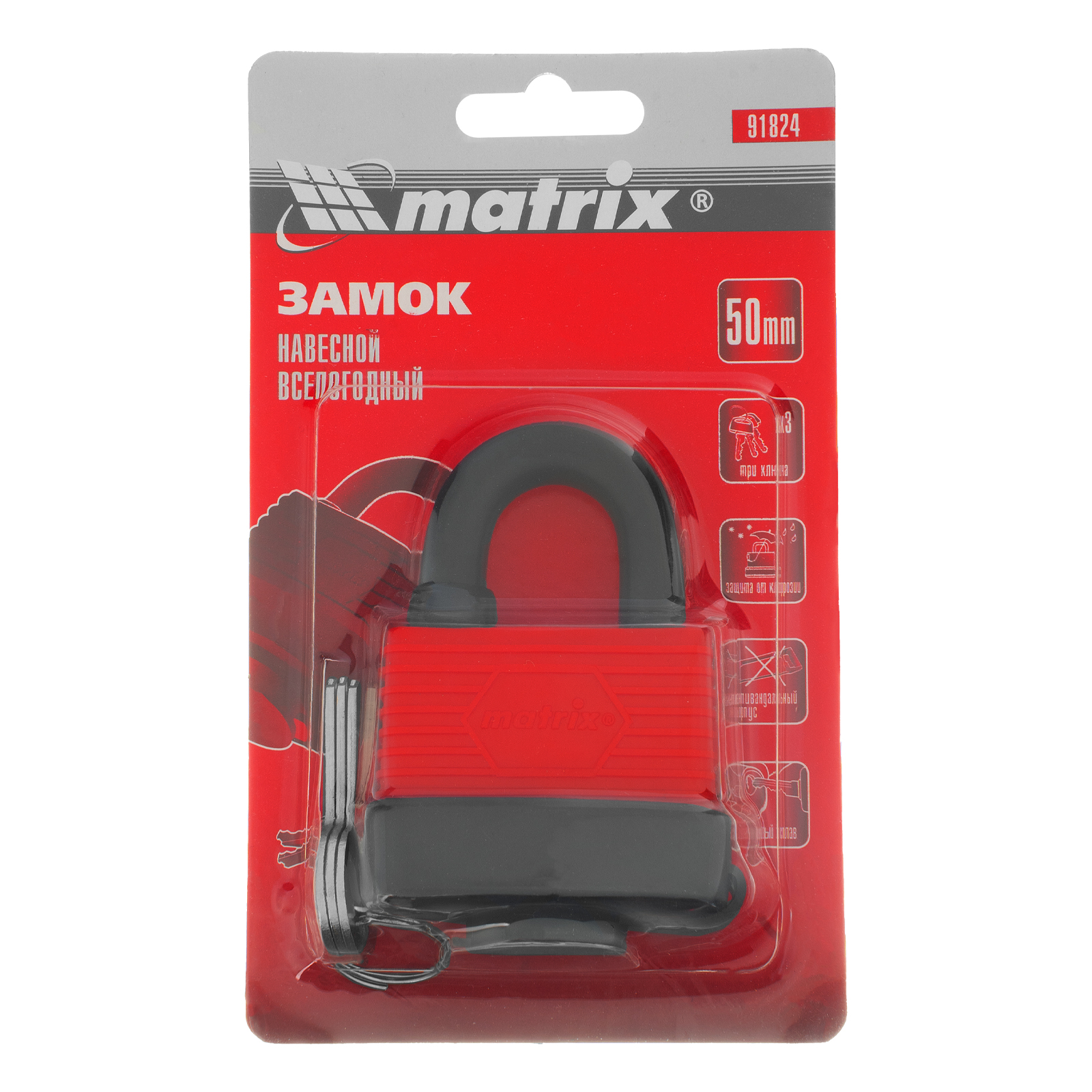 Навесной всепогодный замок Matrix 91824 шириной 50 мм вешается на дверь и обеспечивает сохранность имущества. Поможет защитить от несанкционированного проникновения сарай, гараж, подвал и другие помещения.