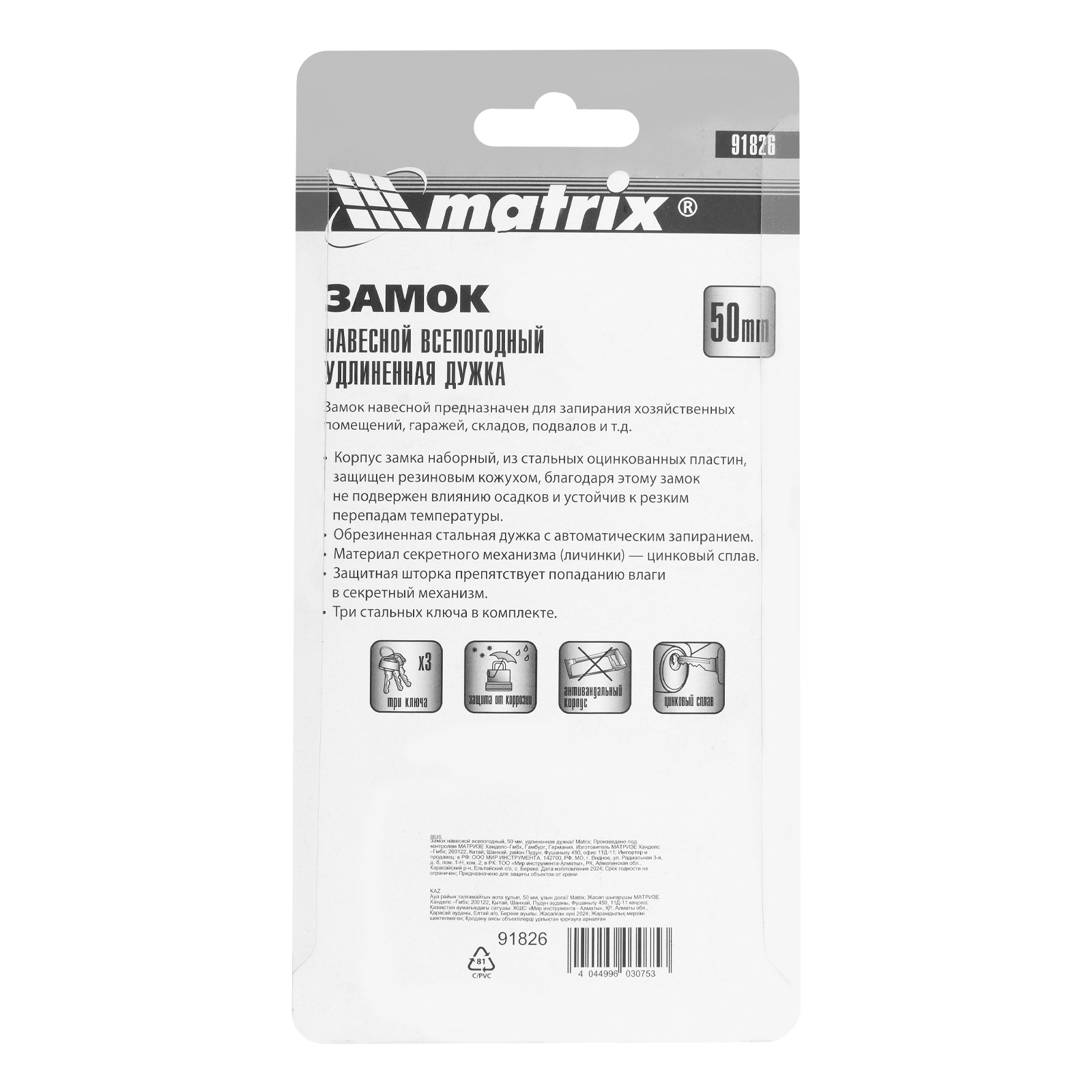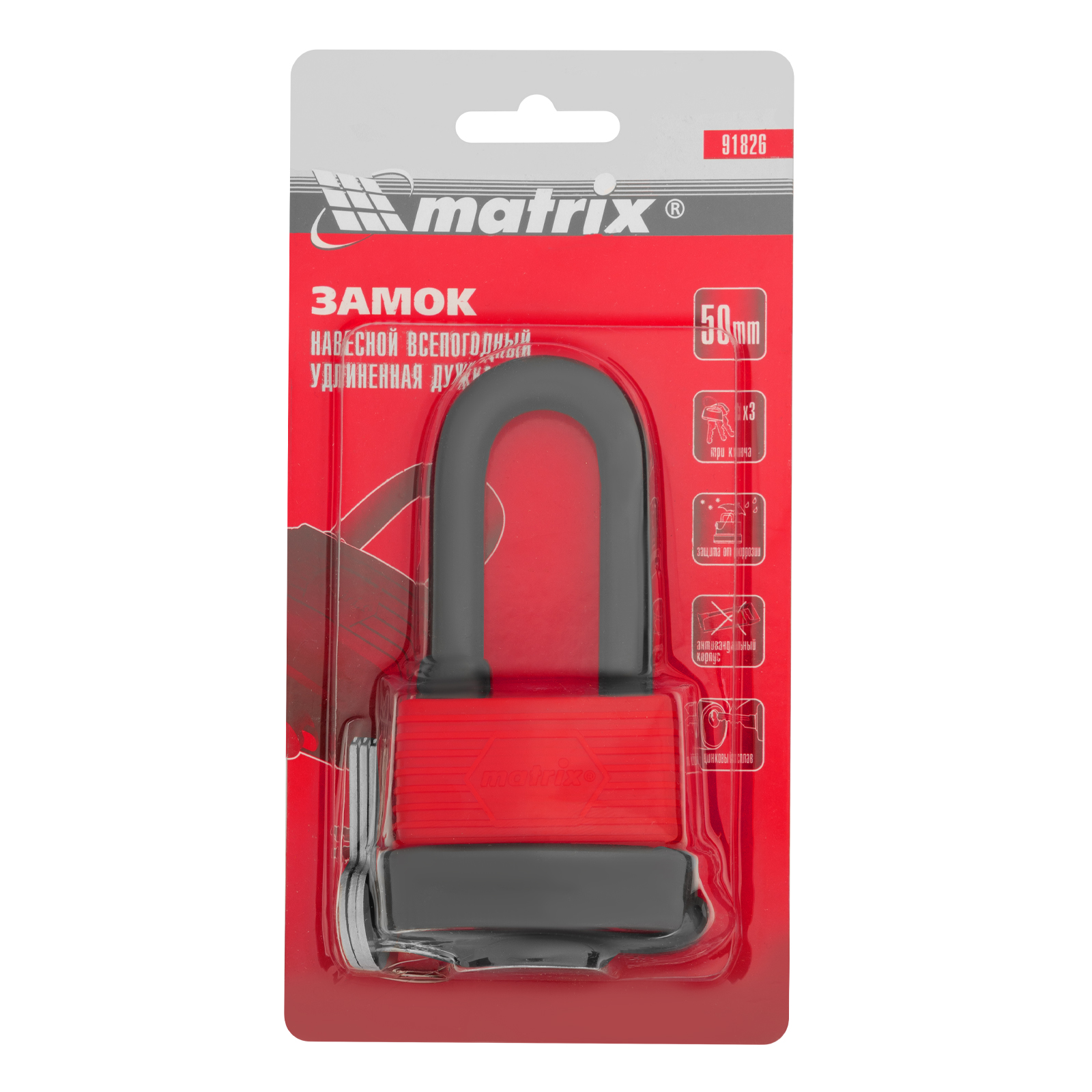 Навесной всепогодный замок Matrix 91826 шириной 50 мм, с удлиненной дужкой, вешается на дверь и обеспечивает сохранность имущества. Поможет защитить от несанкционированного проникновения сарай, гараж, подвал и другие помещения, подходит для высоких запорных петель.