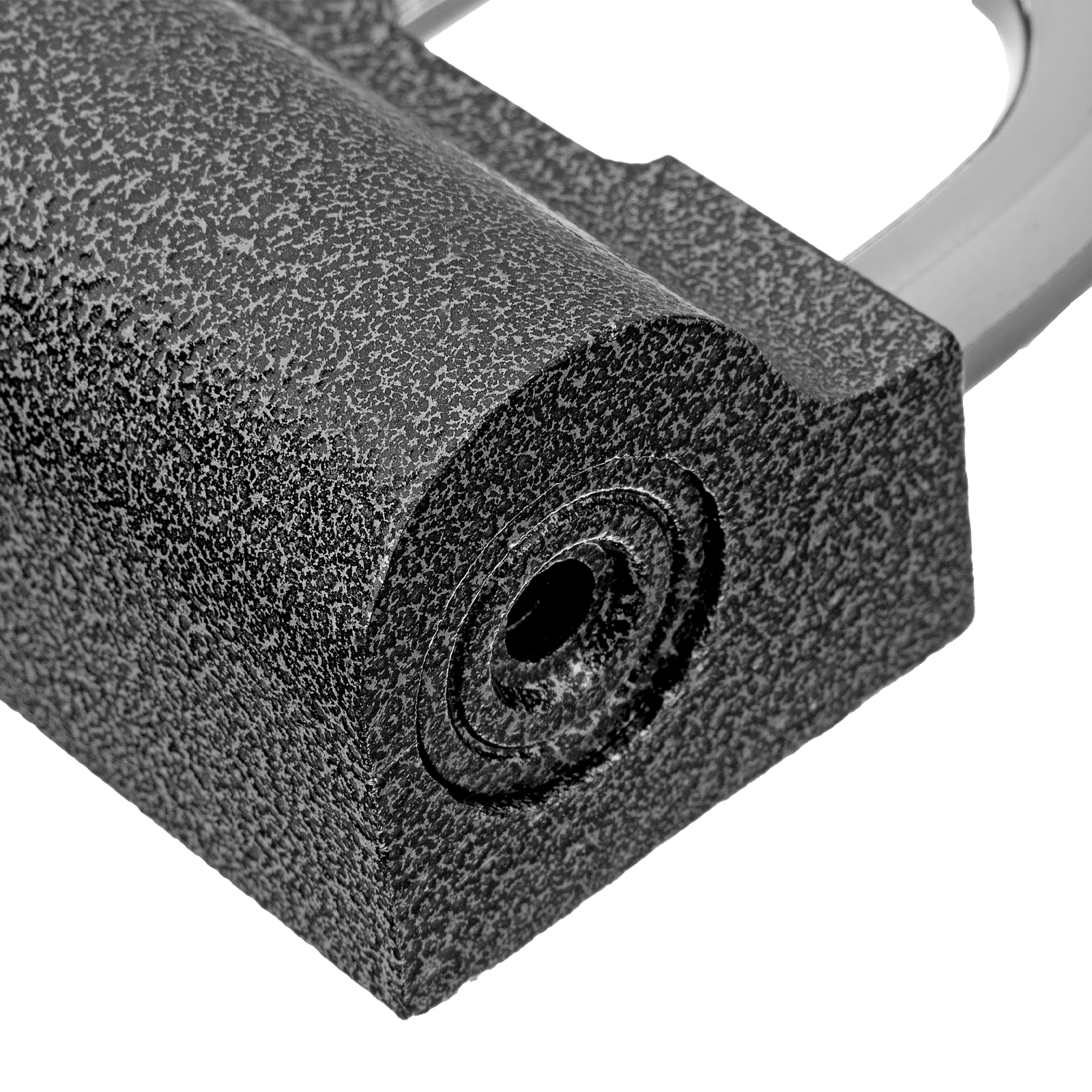 - Прочная конструкция — стальную закаленную дужку диаметром 12 мм сложно распилить, чугунный корпус рассчитан на длительную эксплуатацию.