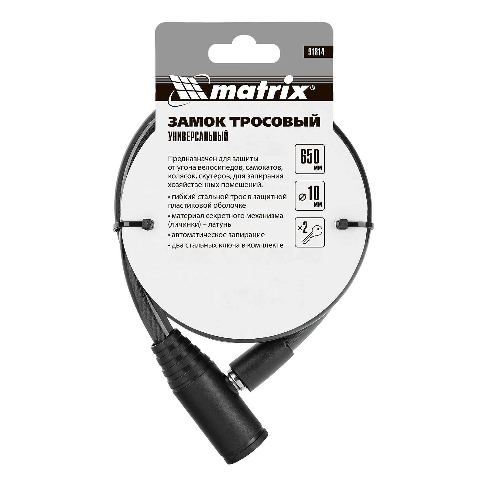 Универсальный тросовый замок Matrix 91814 размером 10 х 650 мм используется для защиты личных вещей от кражи. С его помощью можно пристегнуть коляску, велосипед, санки, мопед и т.д. Трос легко сворачивается и помещается в сумку, поэтому замок удобно брать с собой.