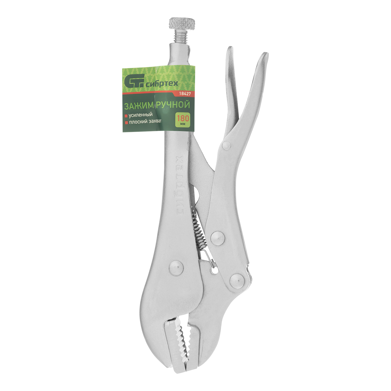 Усиленный ручной зажим Сибртех 18427 длиной 180 мм, с плоским захватом, используется для удержания различных предметов при проведении слесарно-монтажных и сварочных работ. Губки захватывают деталь, а фиксатор блокирует их в необходимом положении. Зажим популярен в профессиональной и бытовой сфере.
