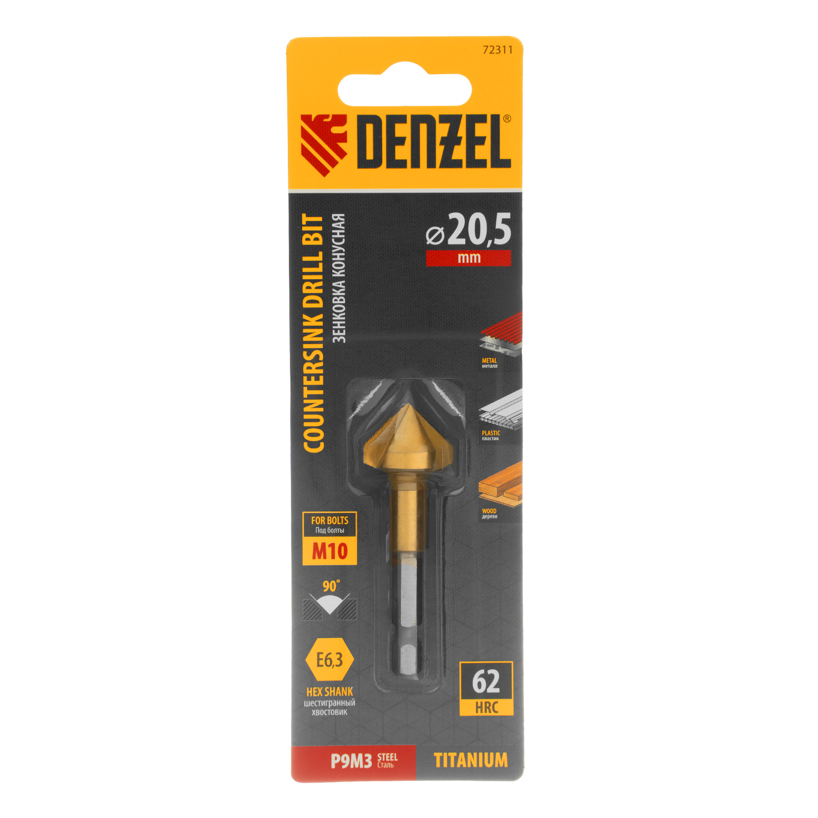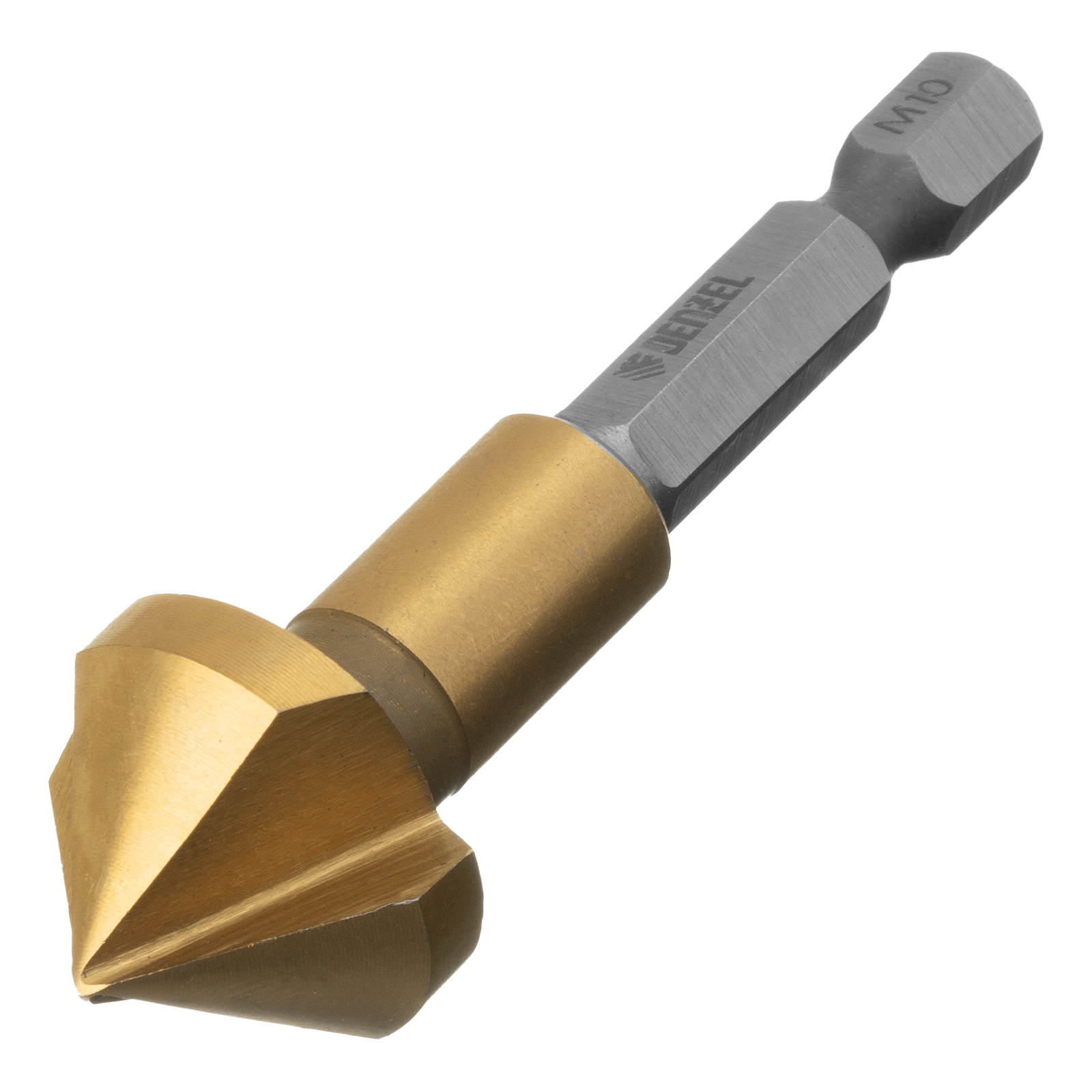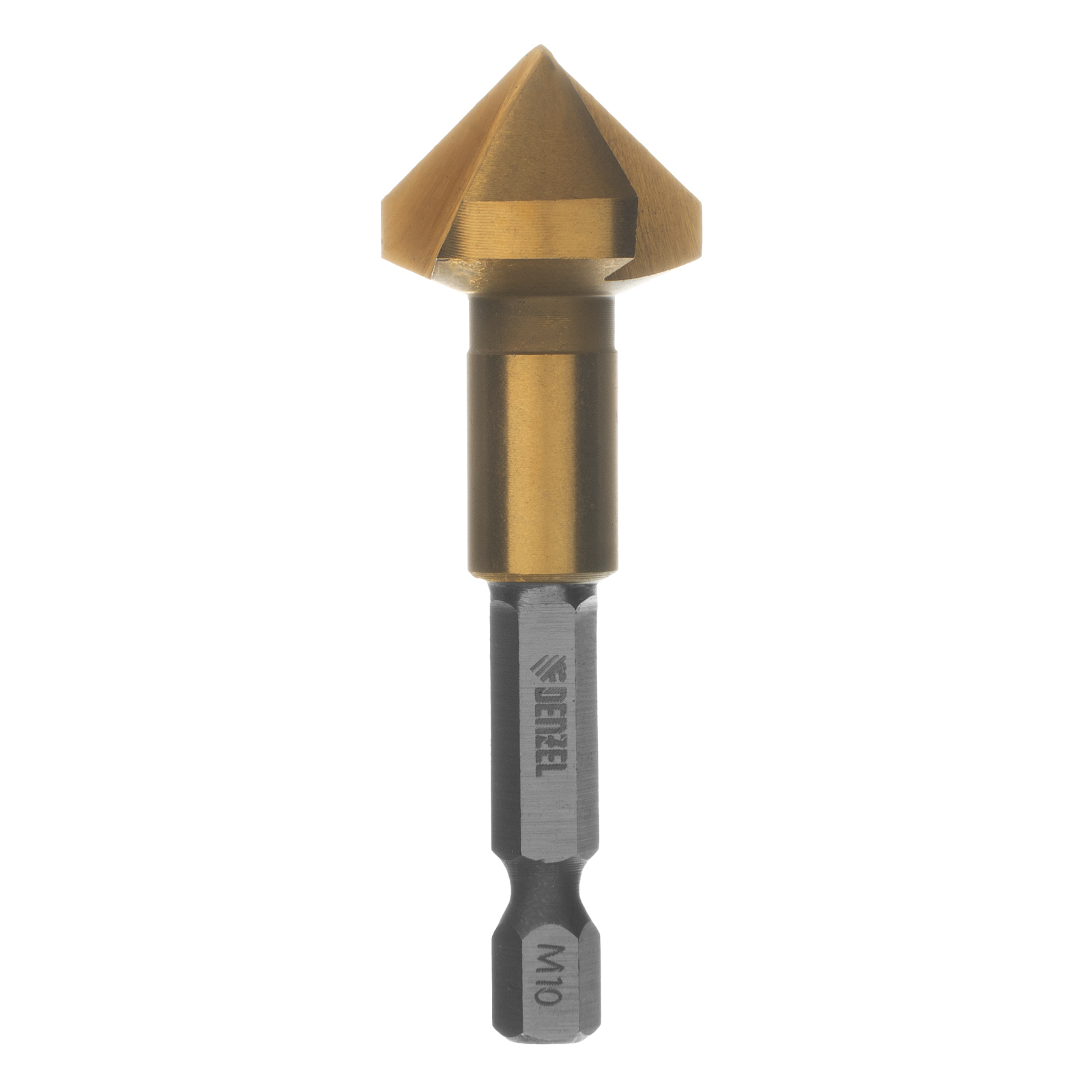 Конусная зенковка Denzel 72311 под болт M10, с 6-гранным хвостовиком, применяется для выполнения конических отверстий и снятия фасок в стали, цветных металлах, древесине и пластике. Устанавливается в патрон дрели или сверлильного станка. Три режущие кромки и идеальные углы заточки 90° обеспечивают точную и быструю обработку отверстий. Оснастка используется во время выполнения слесарных работ.