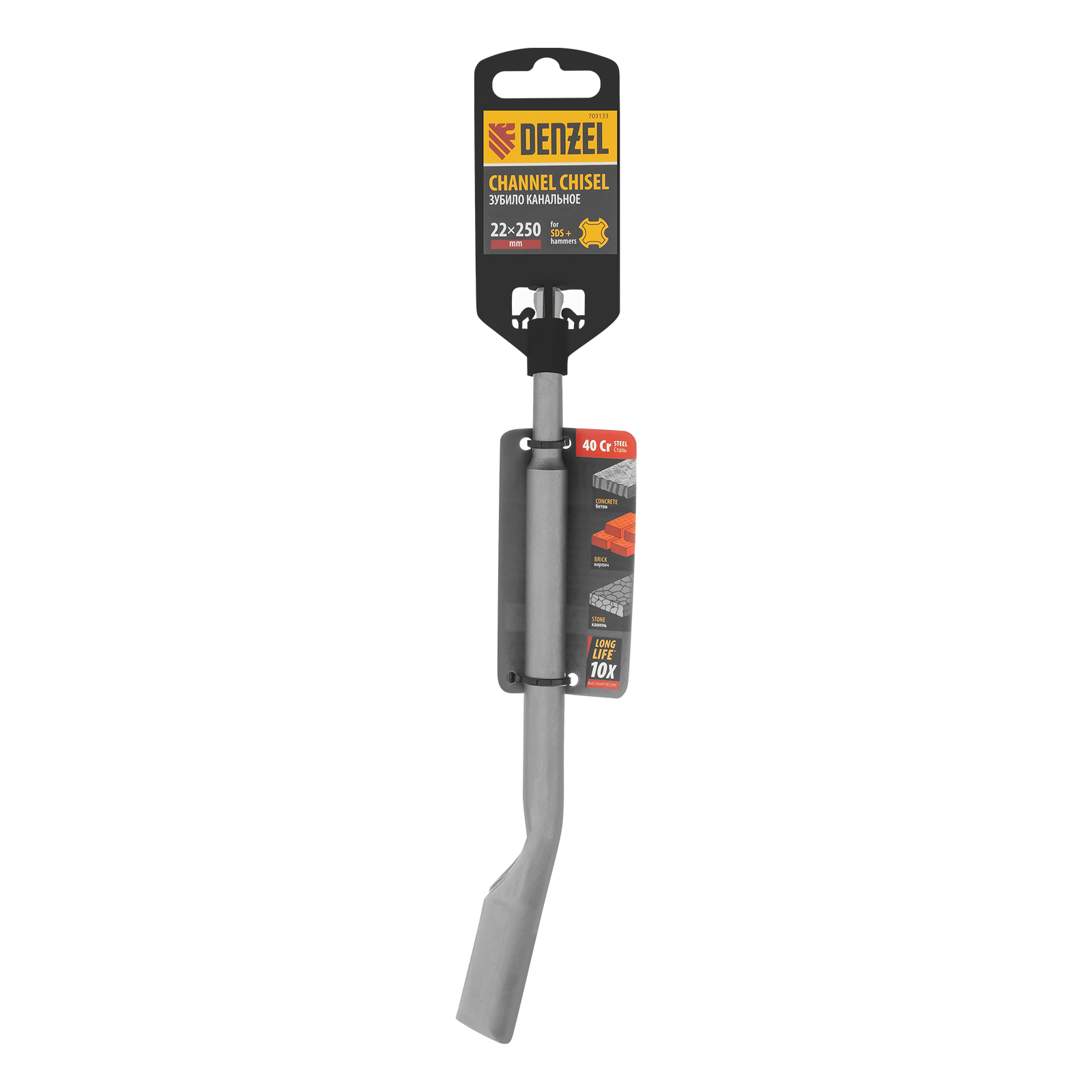Канальное зубило Denzel 703133 размером 14 x 22 x 250 мм, из стали 40Cr, с хвостовиком SDS-plus — оснастка для перфоратора. Предназначено для штробления канавок и пазов в твердых материалах, таких как камень, бетон, кирпич. Пригодится на строительной площадке.