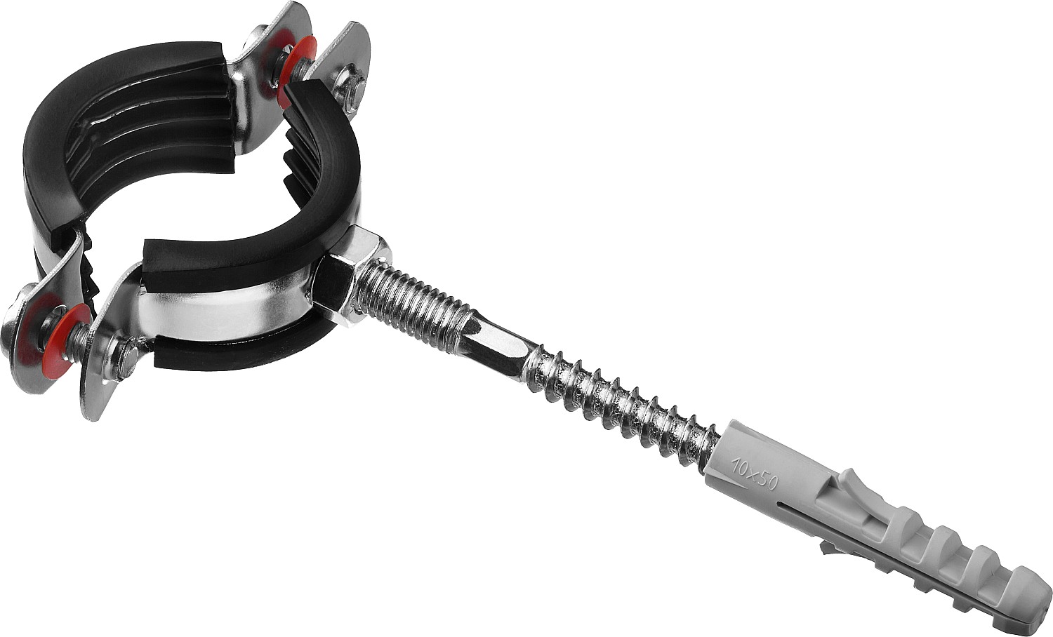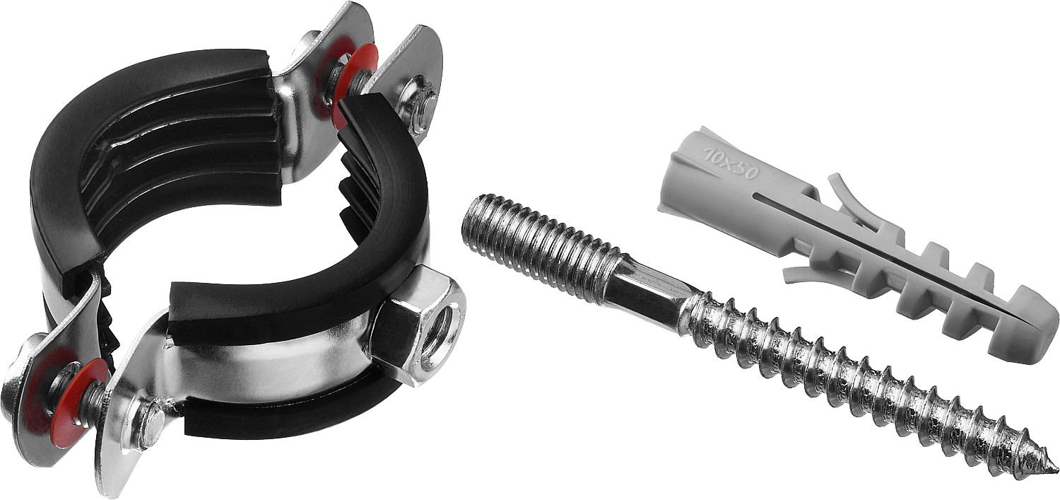 - Комплектность набора позволяет крепить хомут как с помощью гайки, так и с использованием шпильки и дюбеля