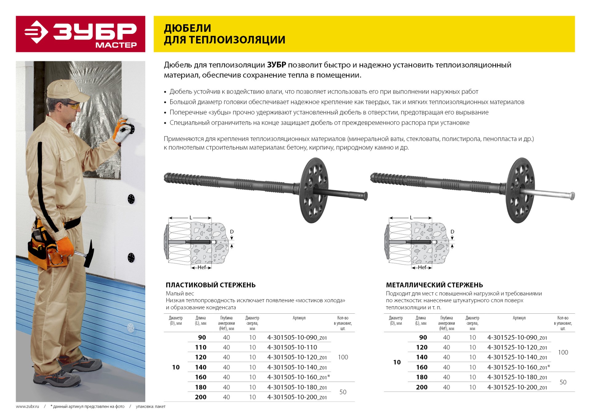 Дюбели для теплоизоляции изготовлены из высококачественных материалов. Большой диаметр головки дюбеля позволяет крепить как твердые, так и мягкие теплоизоляционные материалы (минеральную вату, стекловату, полистирол, пенопласт и др.), препятствуя их разрыву или повреждению в месте крепления.