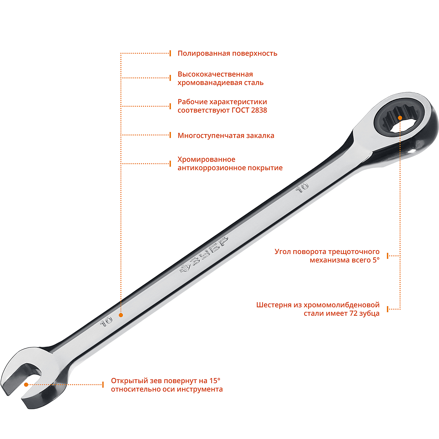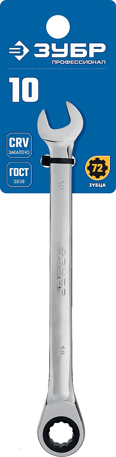 ЗУБР 10 мм, комбинированный трещоточный гаечный ключ, Профессионал (27074-10)
