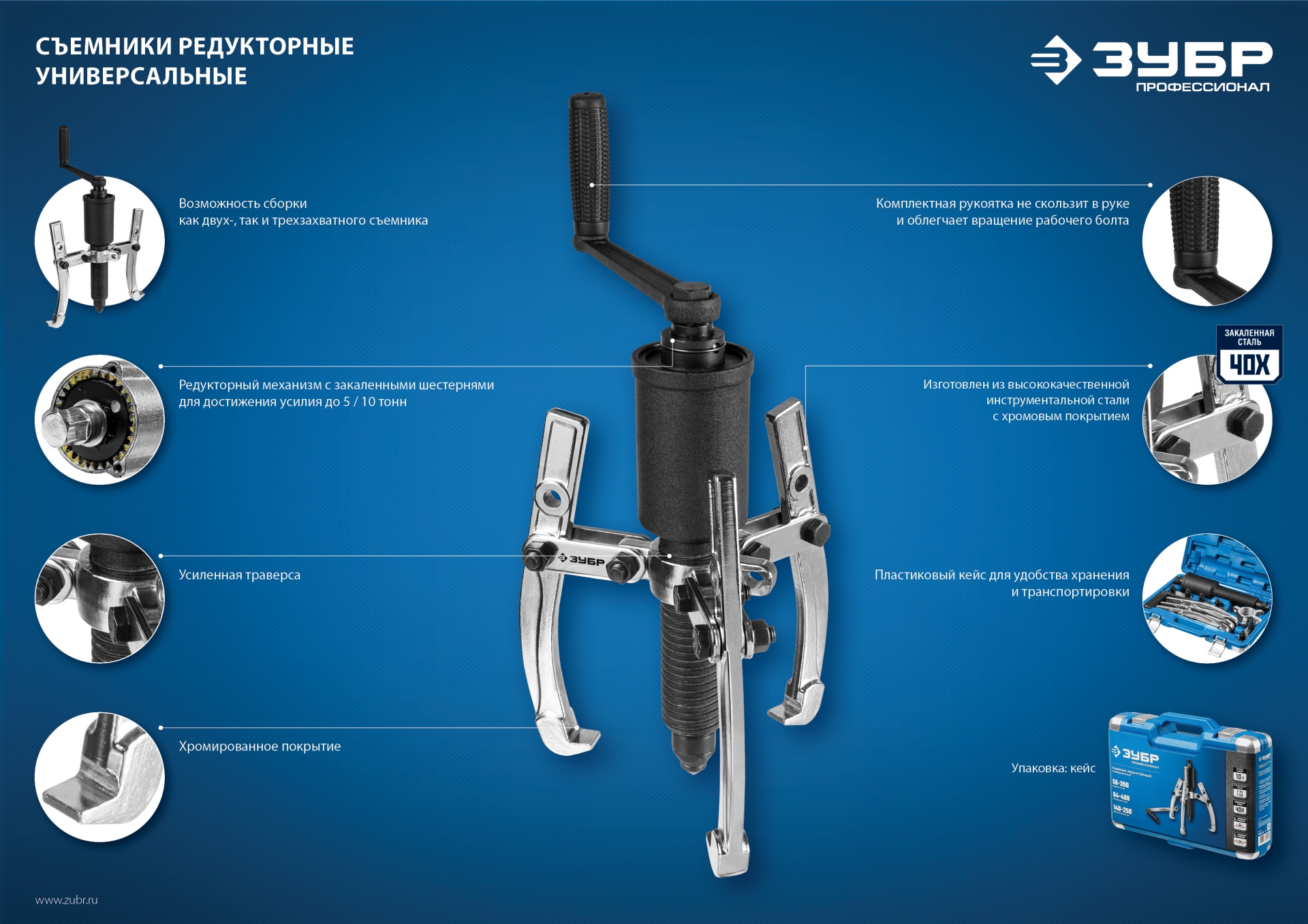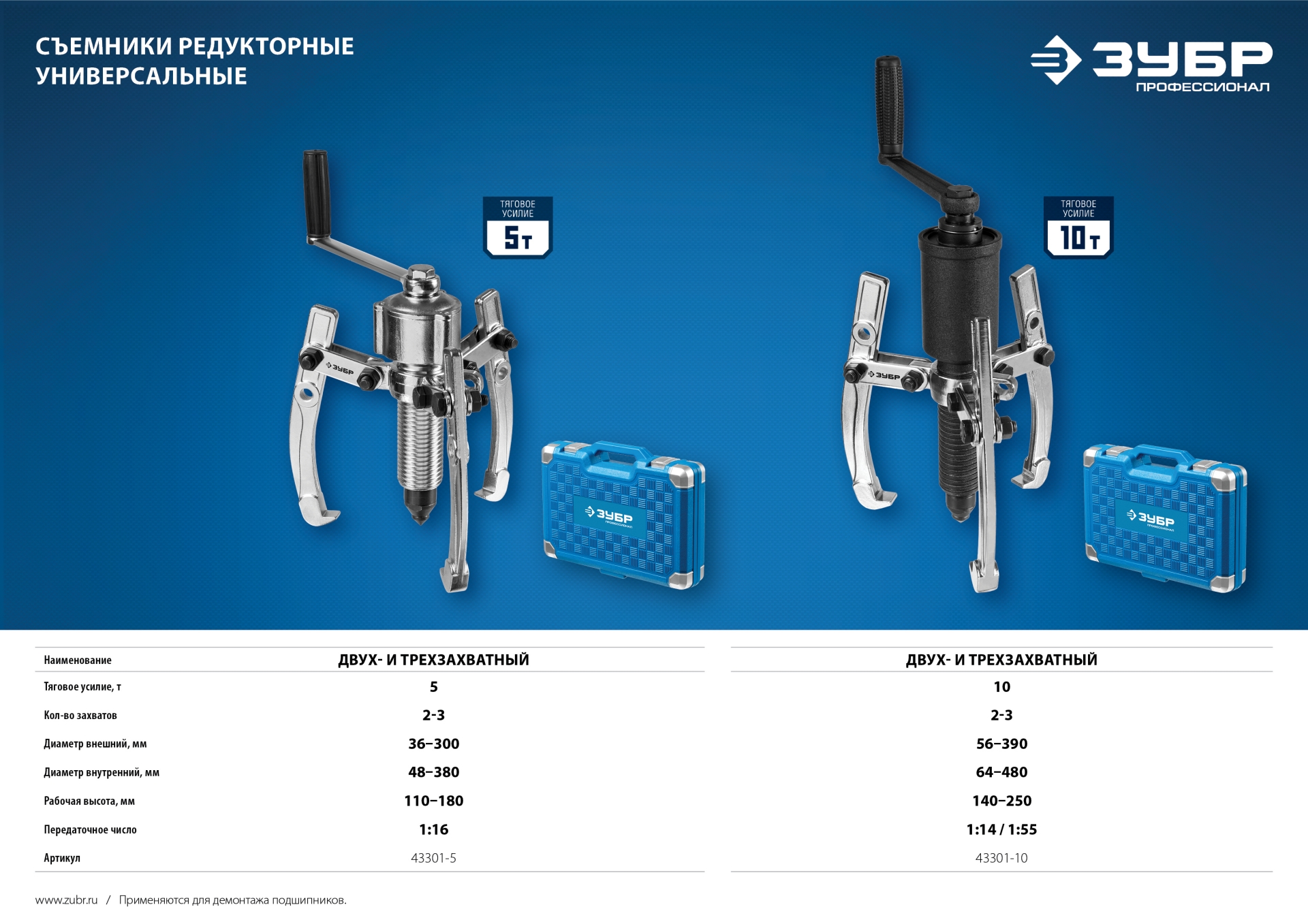 Усиленный съемник применяется для работ с применением повышенных нагрузок. Тяговое усилие до 10 т.