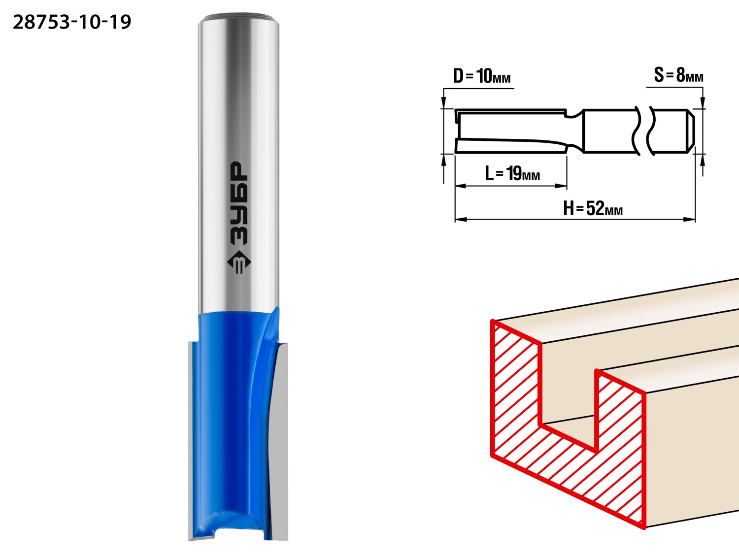 ЗУБР 10 x 19 мм, хвостовик 8 мм, фреза пазовая прямая, Профессионал (28753-10-19)
