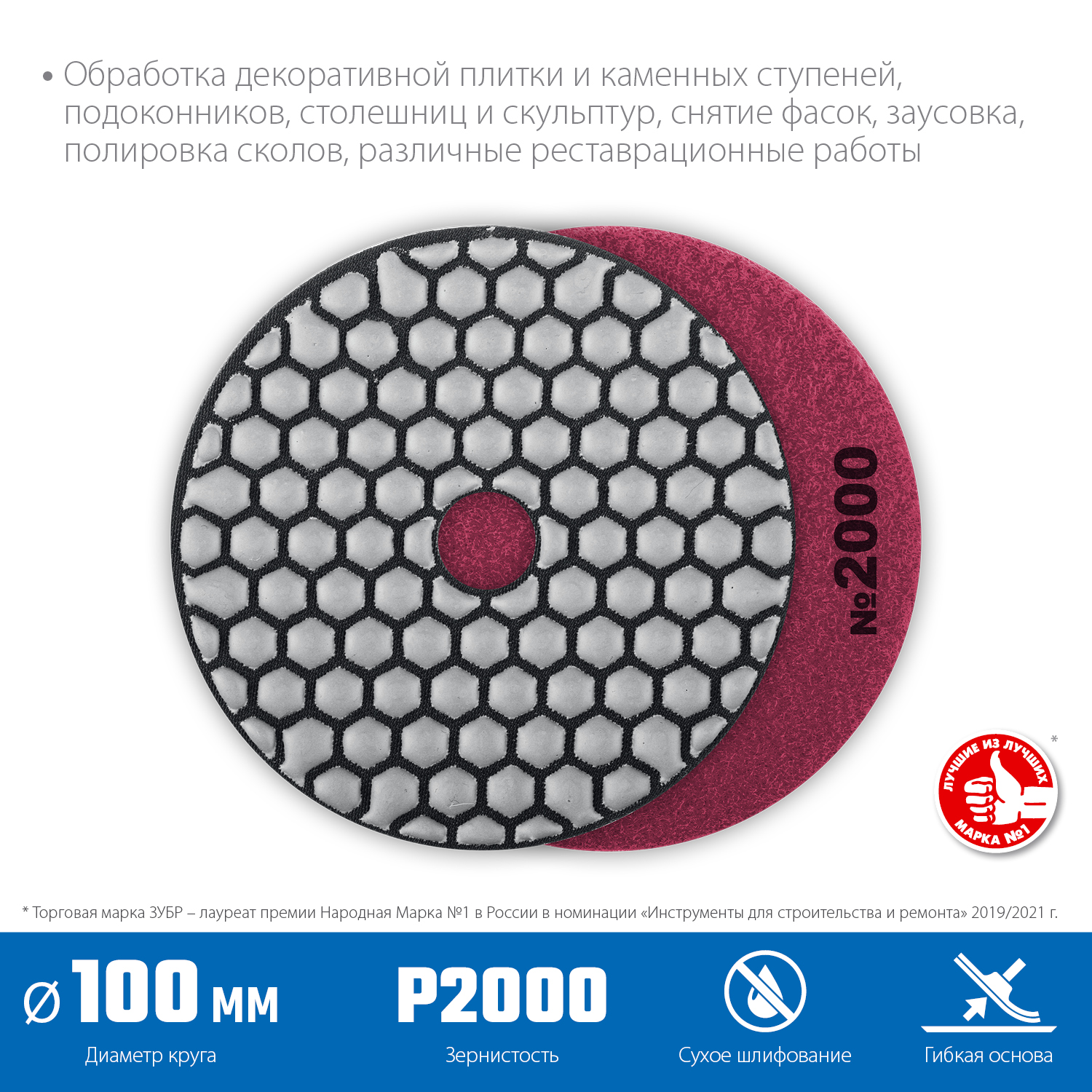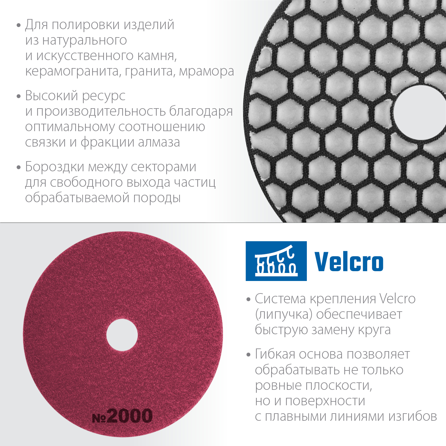 Для сухой шлифовки и полировки изделий из натурального и искуственного камня, керамогранита, гранита, мрамора. Используется на ручном электроинструменте (УШМ, полировальные машины, дрели) с насадкой адаптером под липучку Velcro. Охлаждение водой повышает ресурс инструмента.