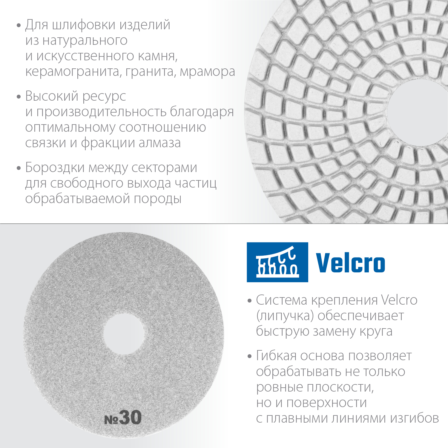 Для шлифовки и полировки изделий из натурального и искуственного камня, керамогранита, гранита, мрамора с применением водяного охлаждения. Используется на ручном электроинструменте (УШМ, полировальные машины, дрели) с насадкой адаптером под липучку Velcro.