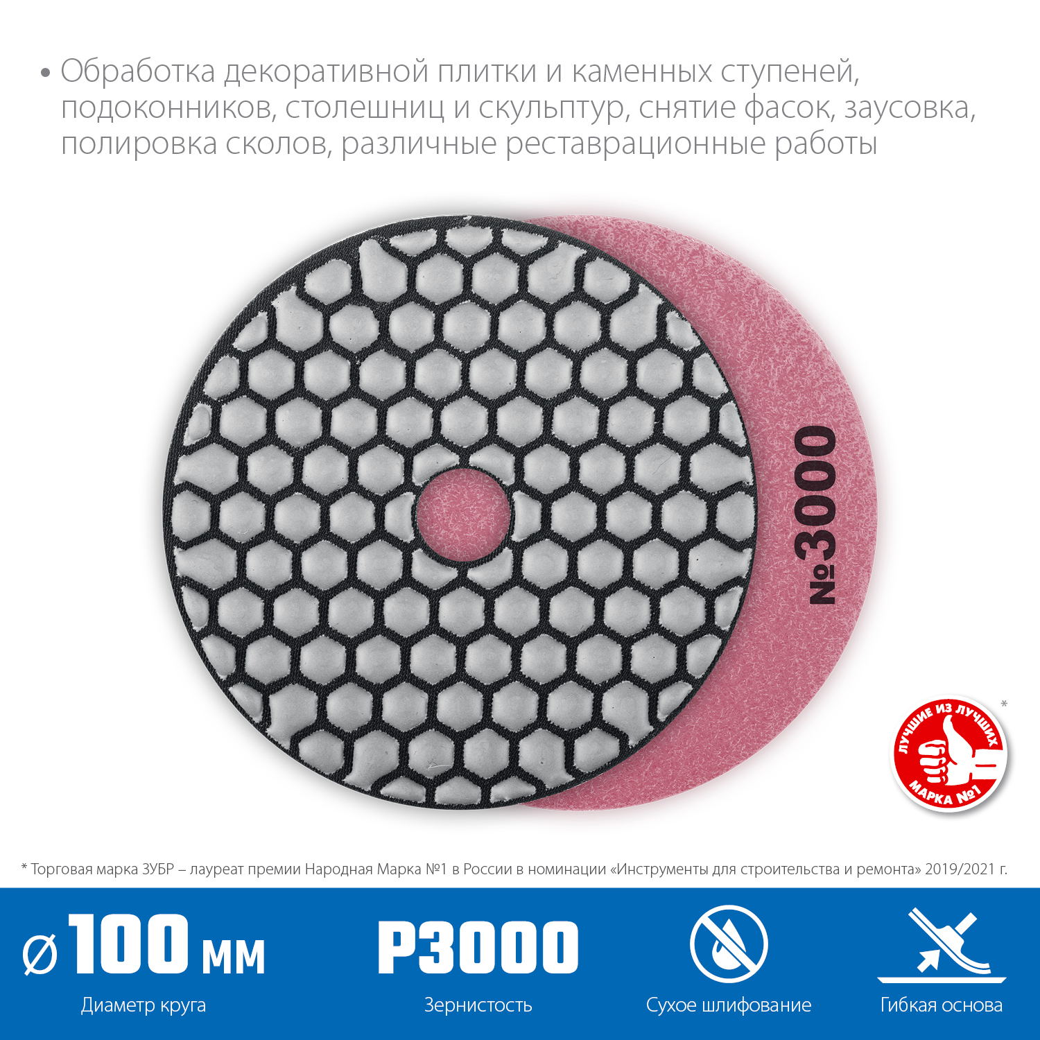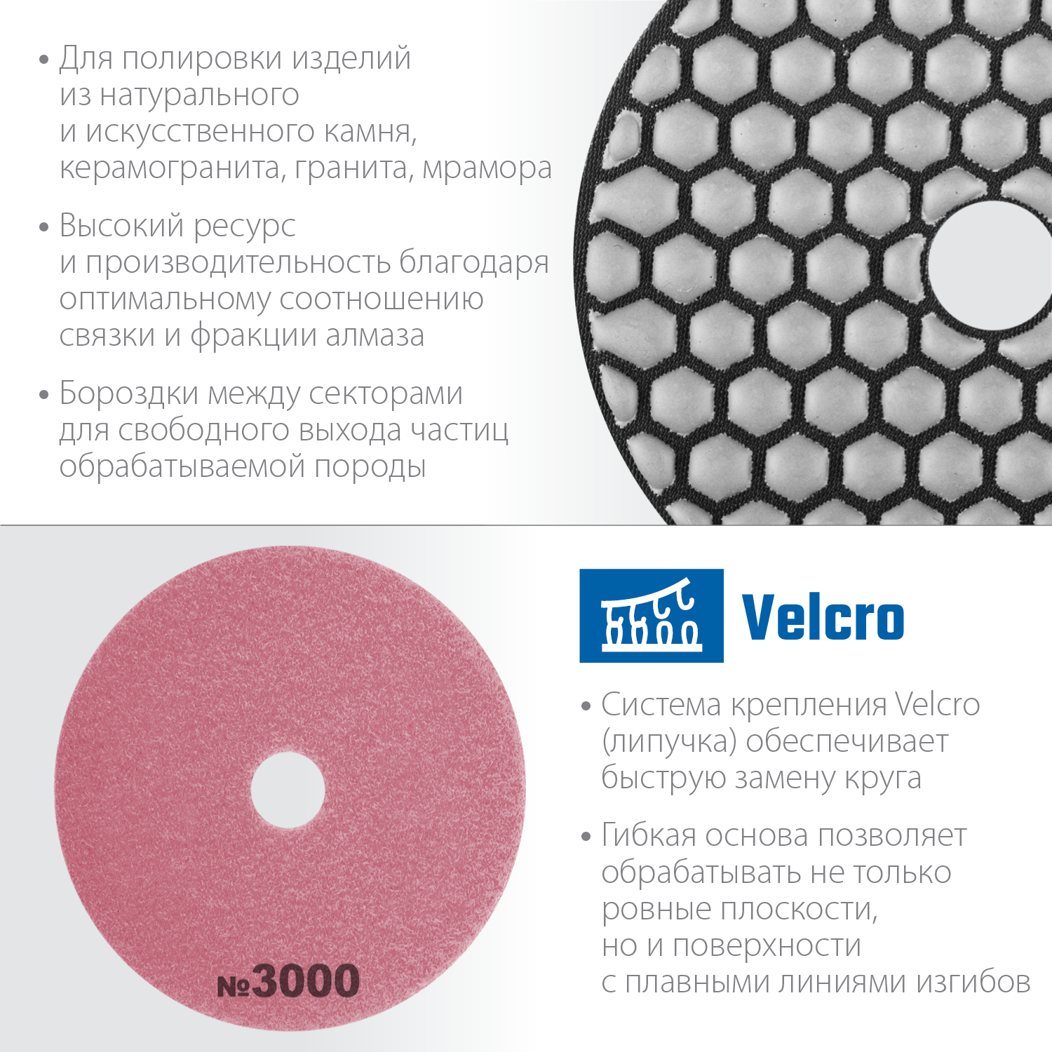 Для сухой шлифовки и полировки изделий из натурального и искуственного камня, керамогранита, гранита, мрамора. Используется на ручном электроинструменте (УШМ, полировальные машины, дрели) с насадкой адаптером под липучку Velcro. Охлаждение водой повышает ресурс инструмента.