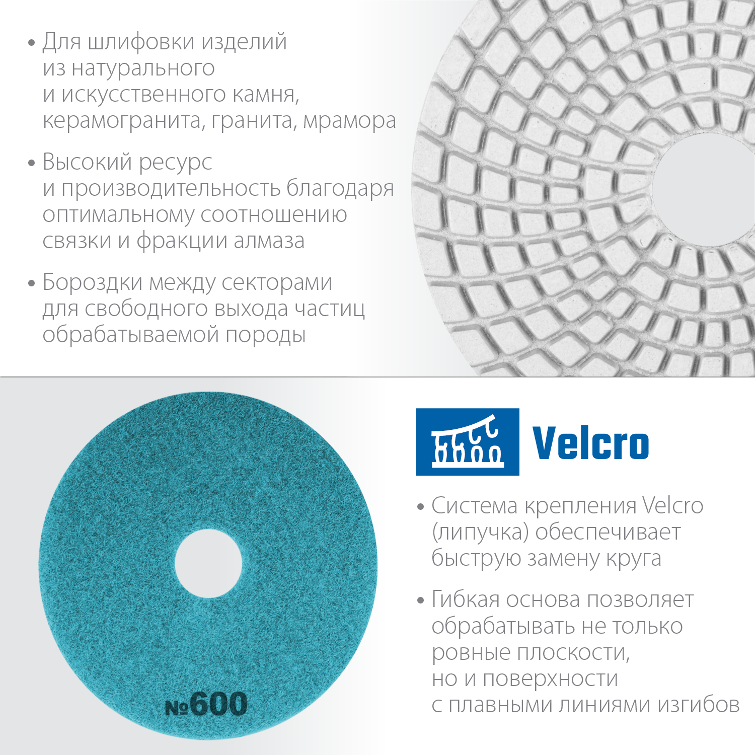 Для шлифовки и полировки изделий из натурального и искуственного камня, керамогранита, гранита, мрамора с применением водяного охлаждения. Используется на ручном электроинструменте (УШМ, полировальные машины, дрели) с насадкой адаптером под липучку Velcro.