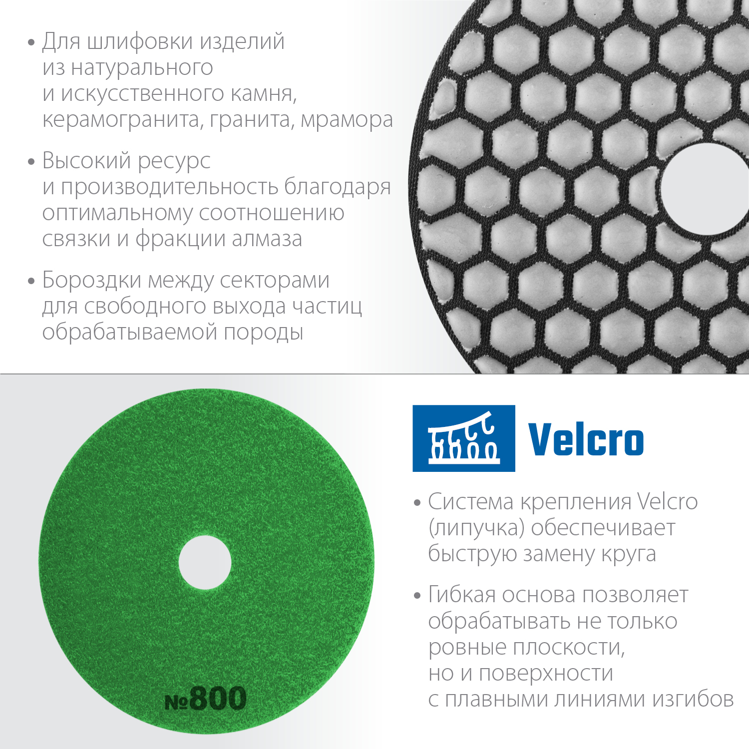 Для сухой шлифовки и полировки изделий из натурального и искуственного камня, керамогранита, гранита, мрамора. Используется на ручном электроинструменте (УШМ, полировальные машины, дрели) с насадкой адаптером под липучку Velcro. Охлаждение водой повышает ресурс инструмента.