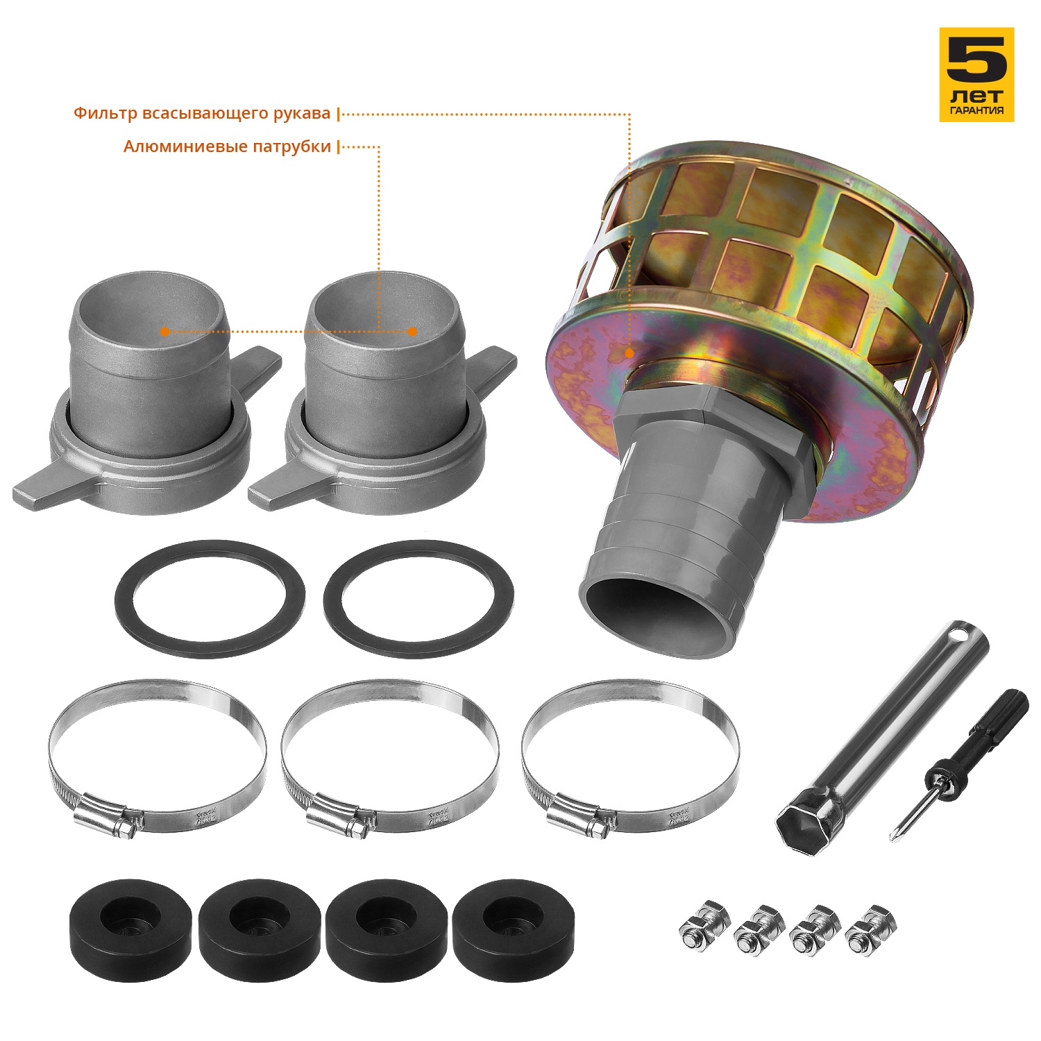 - Металлические патрубки для присоединения шлангов входят в комплект