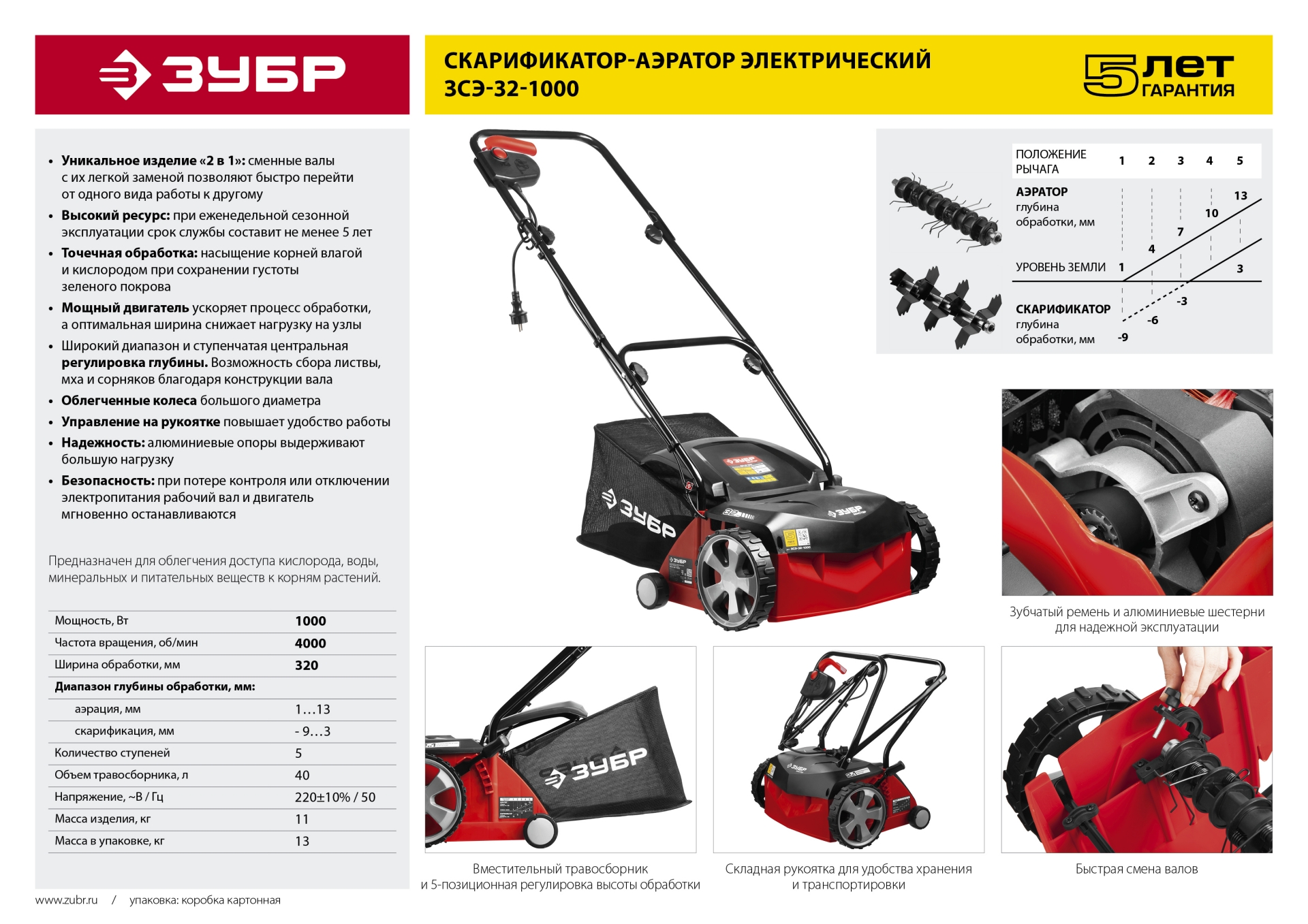 - Широкий диапазон и ступенчатая центральная регулировка глубины обработки дают возможность настроить изделие под индивидуальные особенности Вашего газона