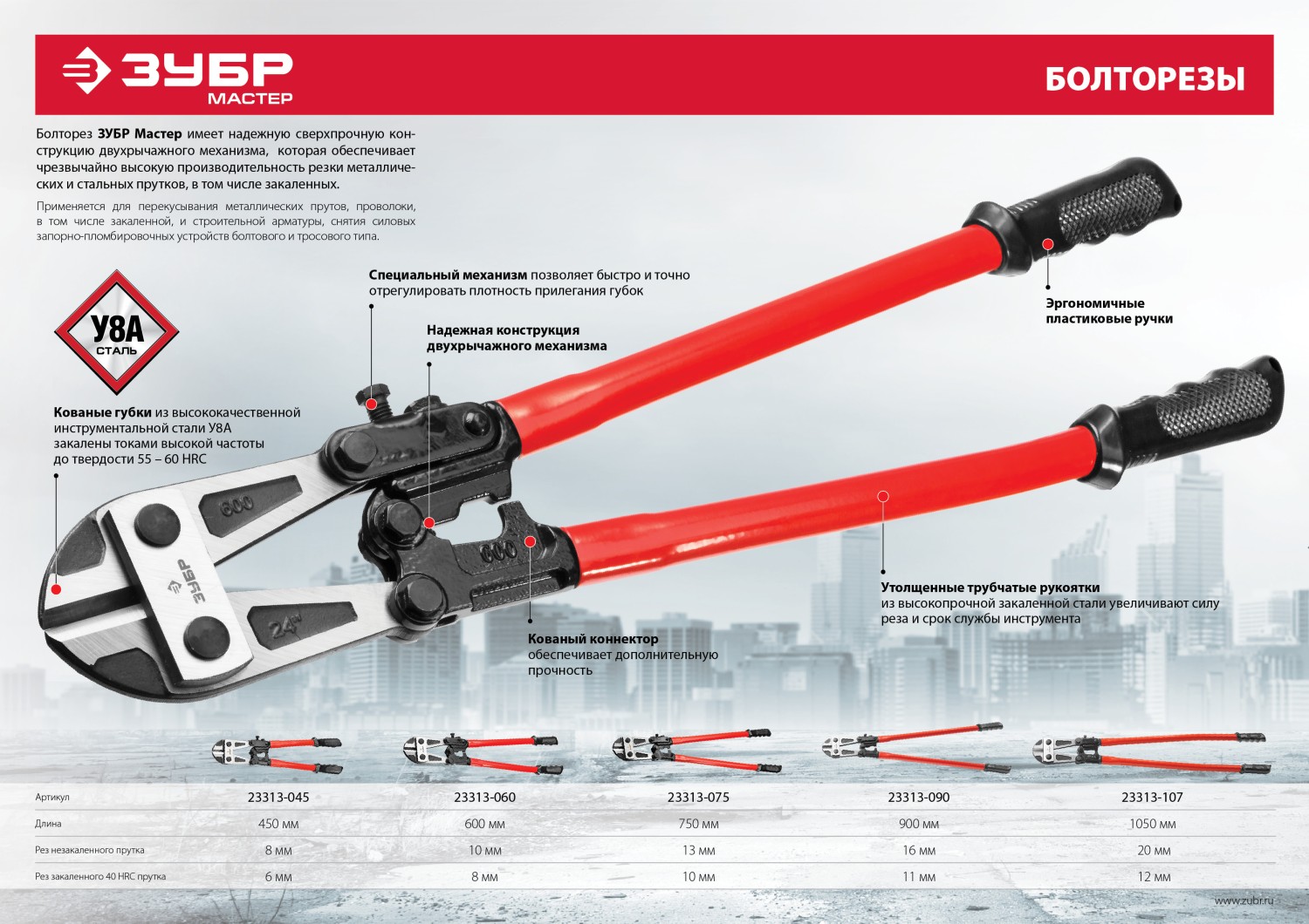 - Надежная конструкция двухрычажного механизма и применение высокопрочной закаленной стали в рукоятках болторезов увеличивает силу реза и срок службы ин