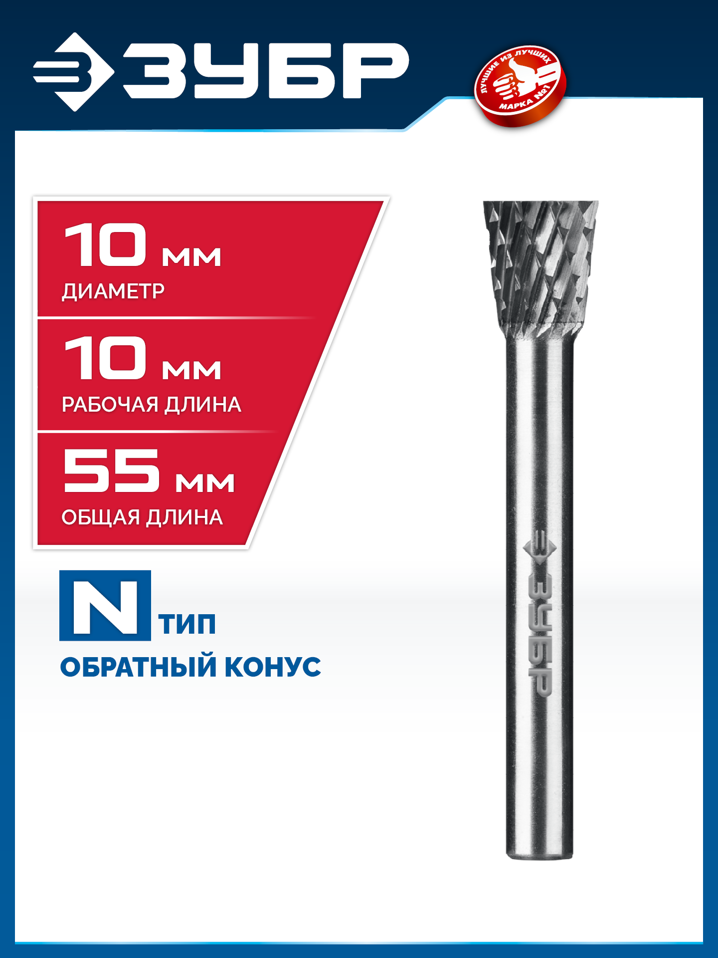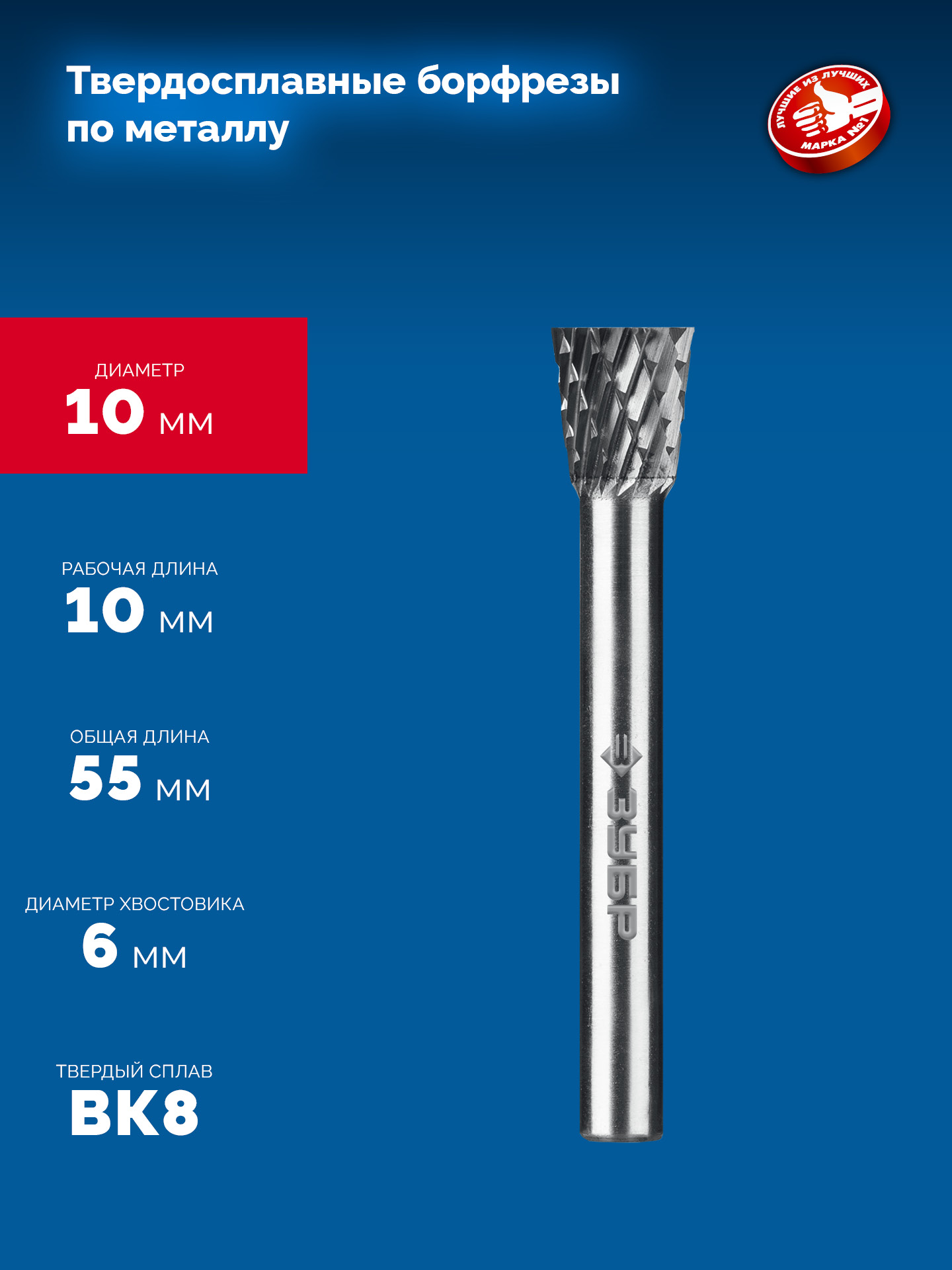 ЗУБР 10х10 мм, тип N (обратный конус, угол 13°), хв-к 6 мм, твердосплавная борфреза, ПРОФЕССИОНАЛ (28812-10-10)